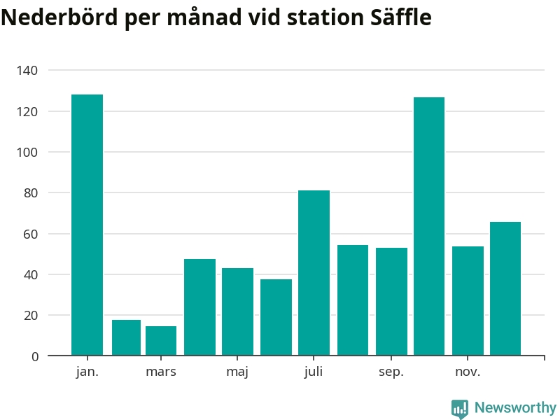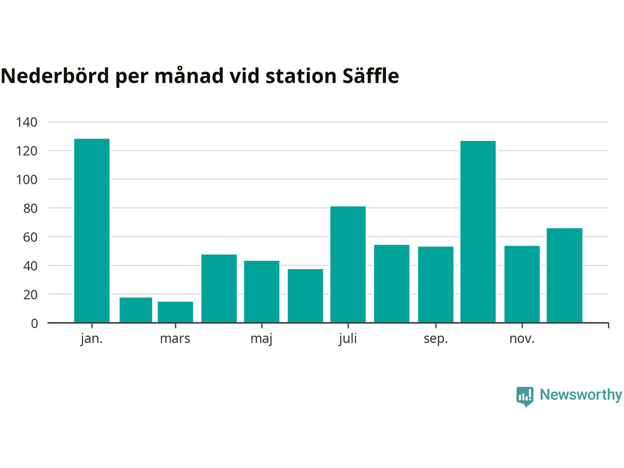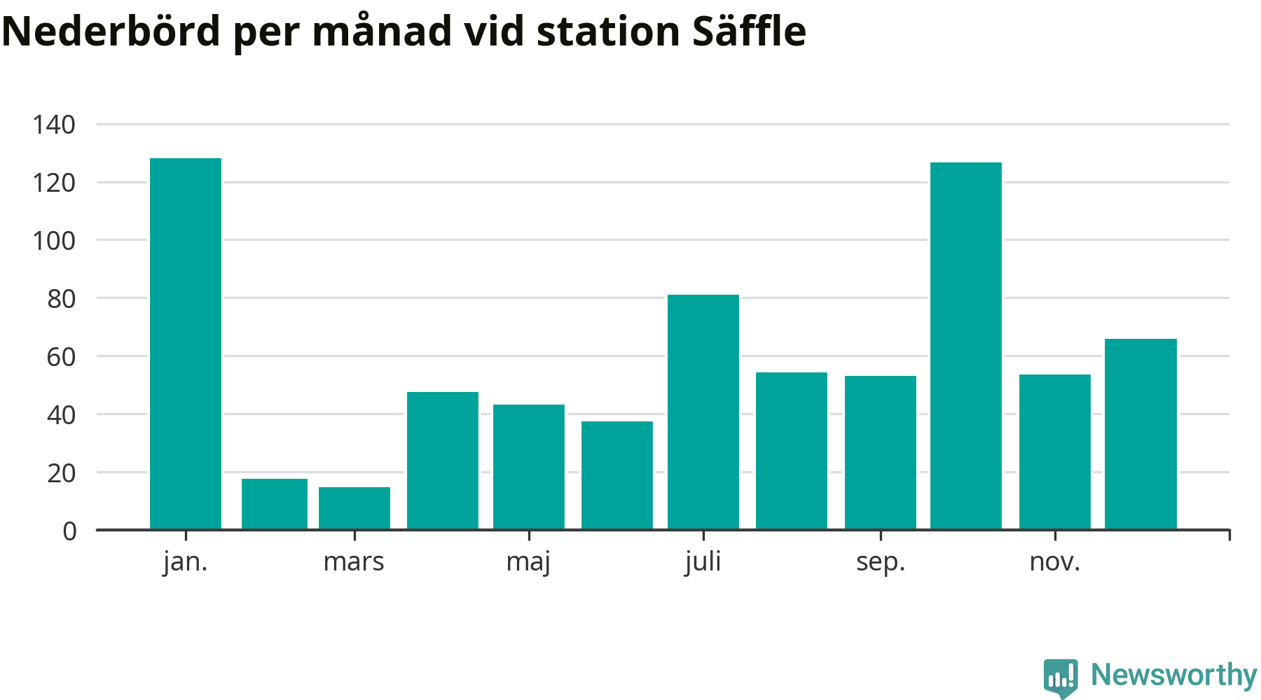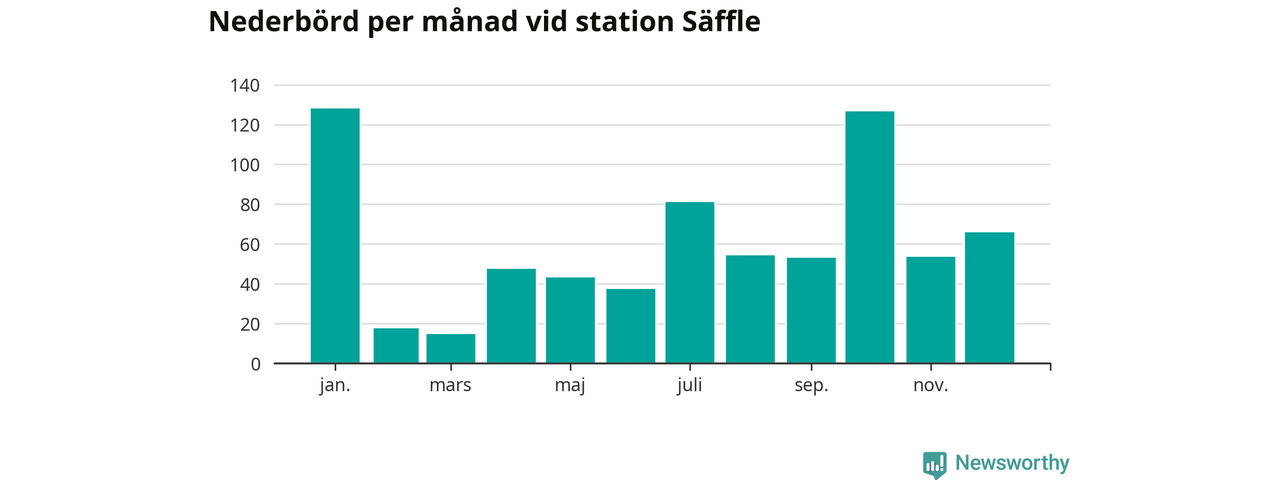 Nederbördsmässigt var 2025 ett torrare år än vanligt vid Säffle. Totalt föll 723 millimeter nederbörd vid stationen, att jämföra med de senaste tre decenniernas genomsnitt på 802 millimeter. Månaden med mest nederbörd var januari, med 128 millimeter.