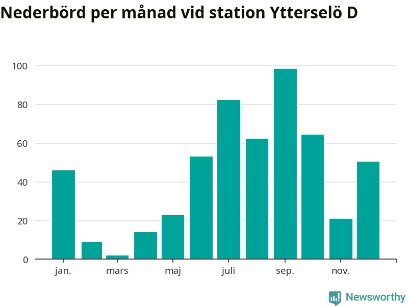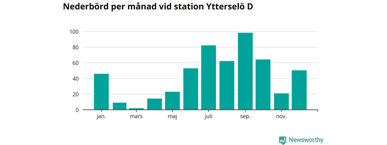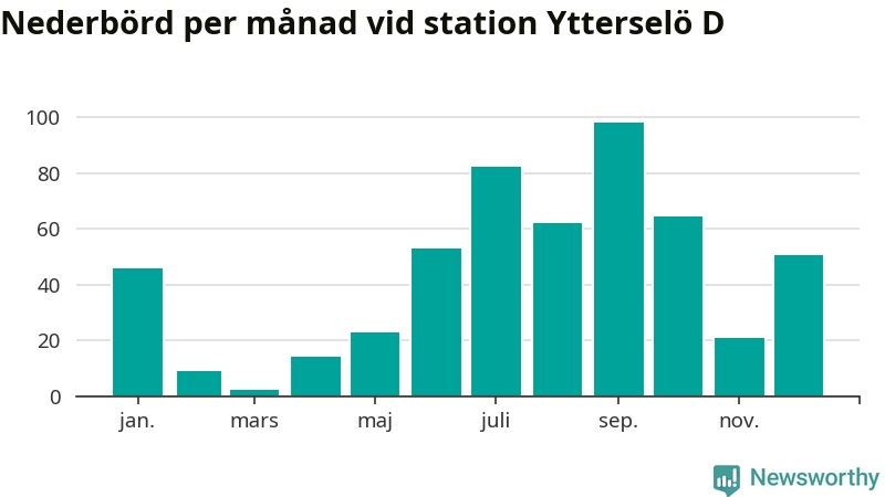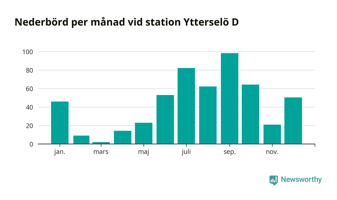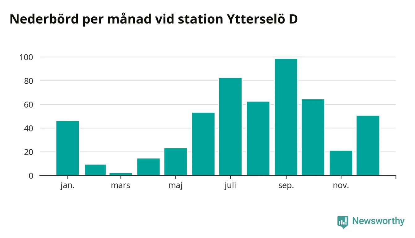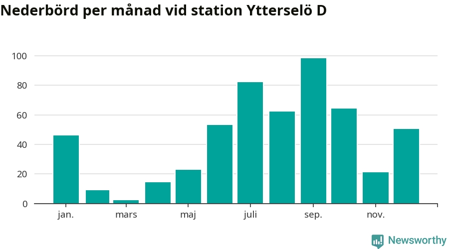 Nederbördsmässigt var 2025 ett ganska normalt år, åtminstone vid Ytterselö D, två mil sydväst om Bålsta. Totalt föll 526 millimeter nederbörd vid stationen, att jämföra med de senaste tre decenniernas genomsnitt på 560 millimeter. Månaden med mest nederbörd var september, med 98 millimeter.