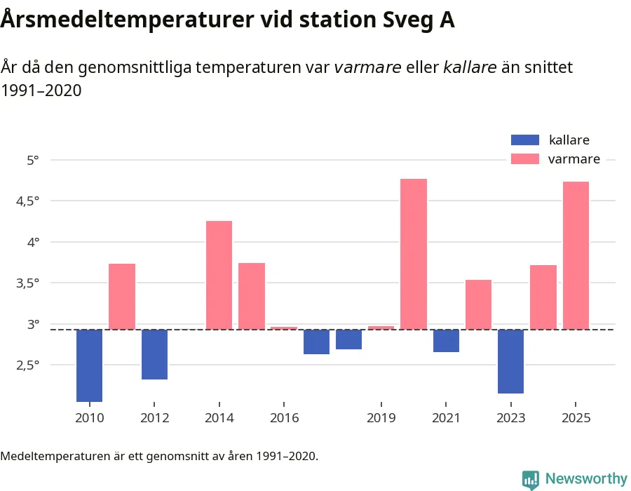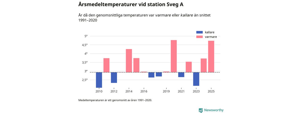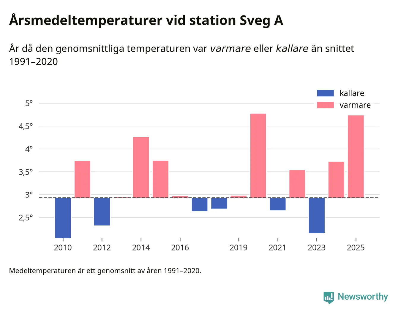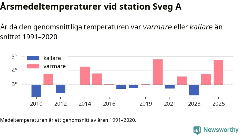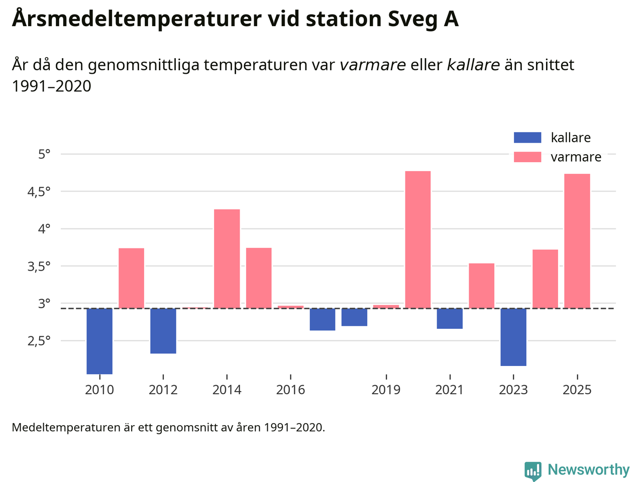 Årsmedeltemperaturen vid Sveg A utanför Sveg var under 2025 4,7 grader, 1,8 grader högre än genomsnittet de senaste decennierna. Det visar Newsworthys beräkningar, som bygger på delvis preliminär observationsdata från SMHI.