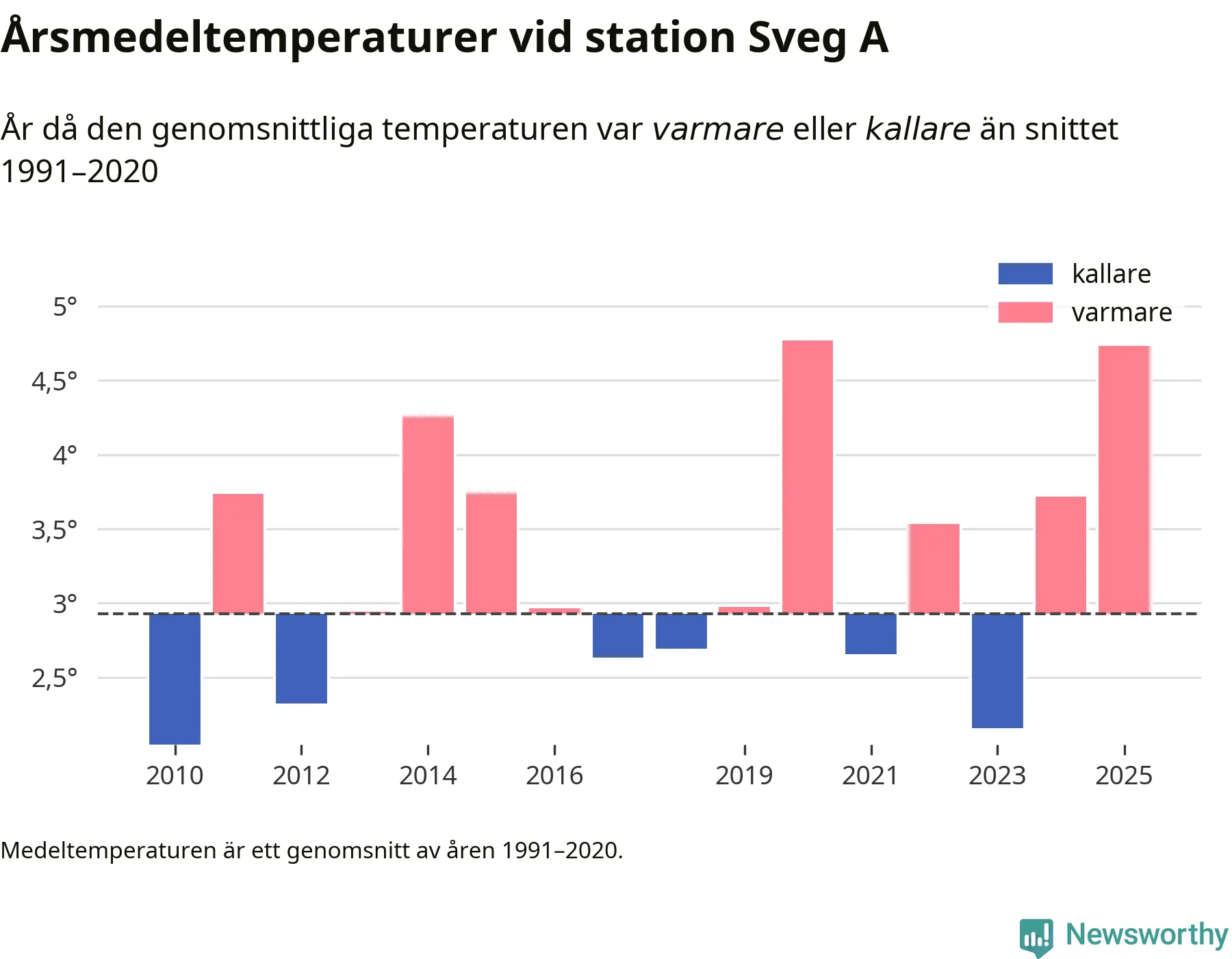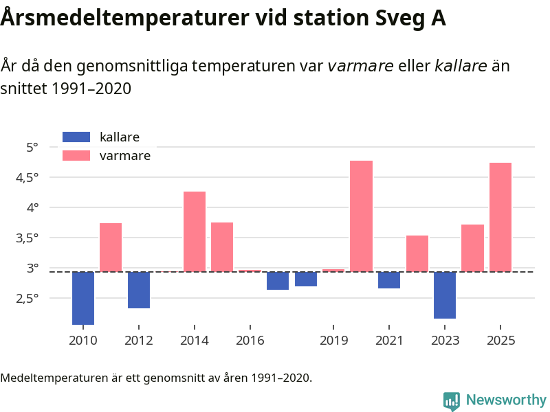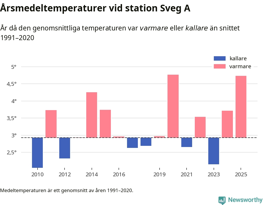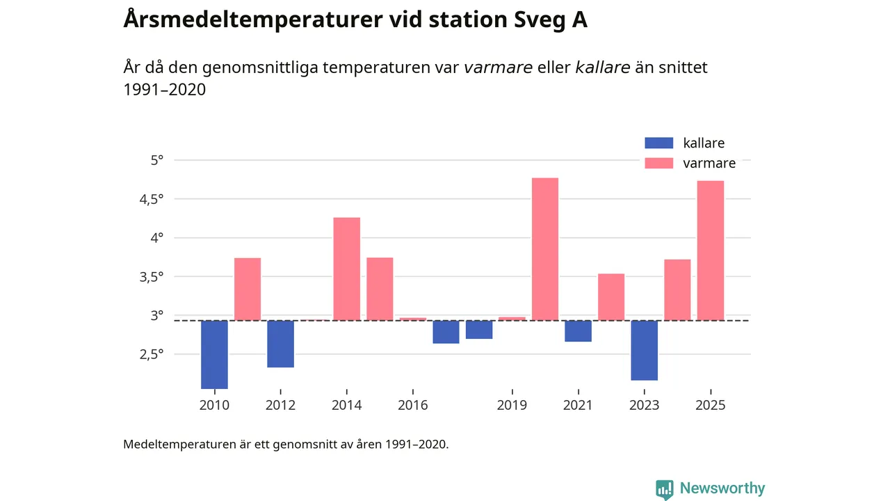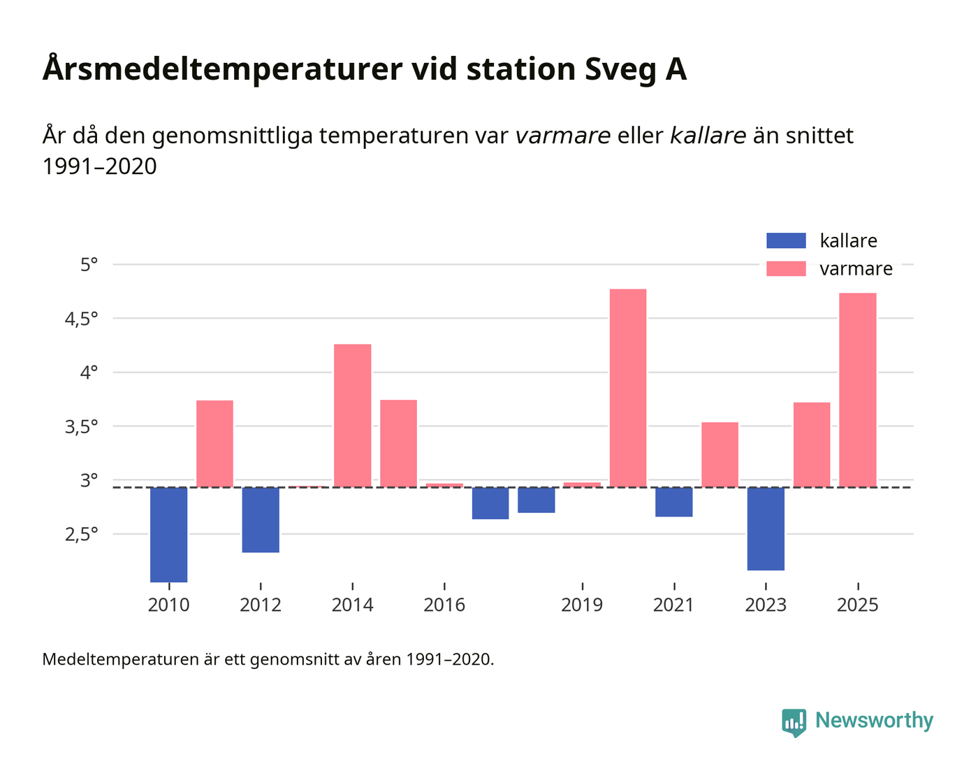 Årsmedeltemperaturen vid Sveg A utanför Sveg var under 2025 4,7 grader, 1,8 grader högre än genomsnittet de senaste decennierna. Det visar Newsworthys beräkningar, som bygger på delvis preliminär observationsdata från SMHI.