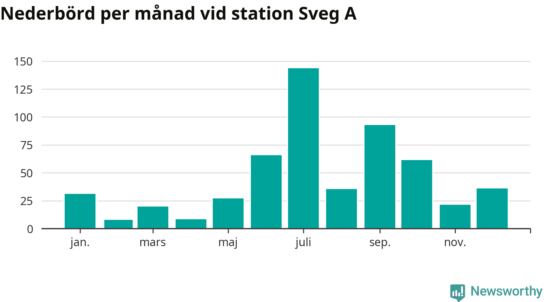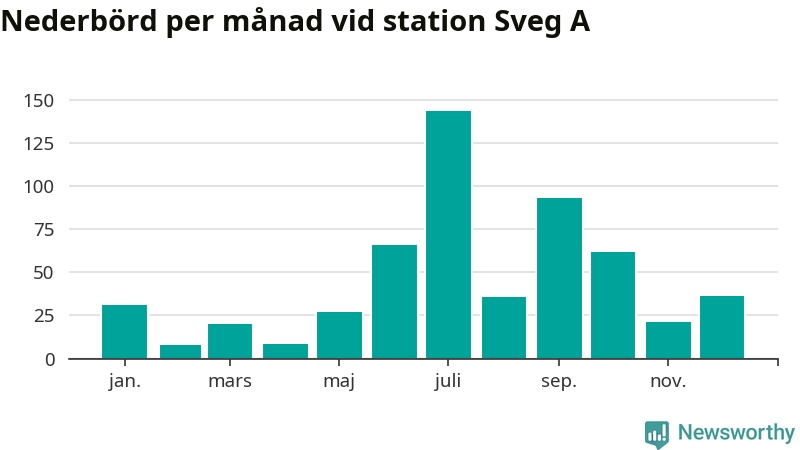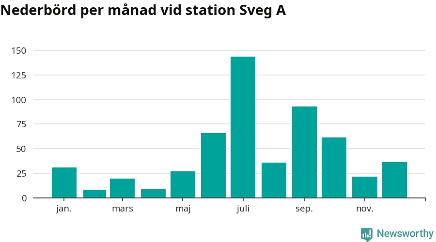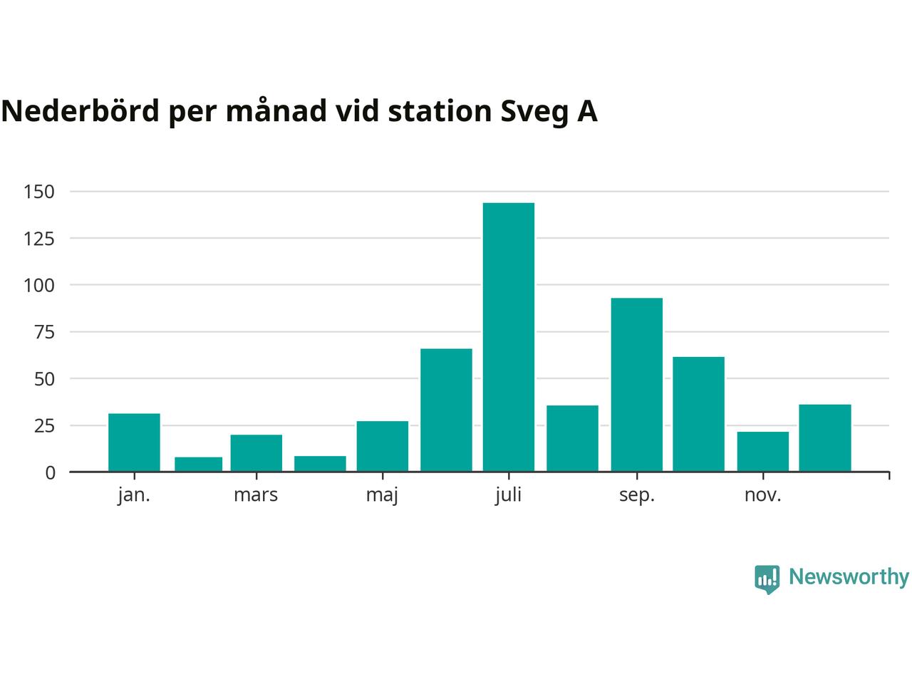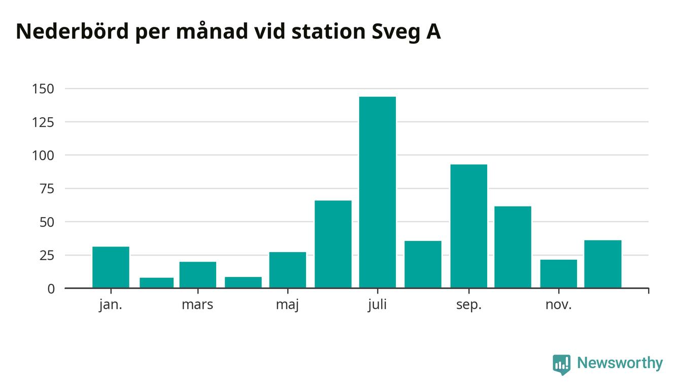 Nederbördsmässigt var 2025 ett ganska normalt år vid Sveg A. Totalt föll 550 millimeter nederbörd vid stationen, att jämföra med de senaste tre decenniernas genomsnitt på 518 millimeter. Månaden med mest nederbörd var juli, med 144 millimeter.