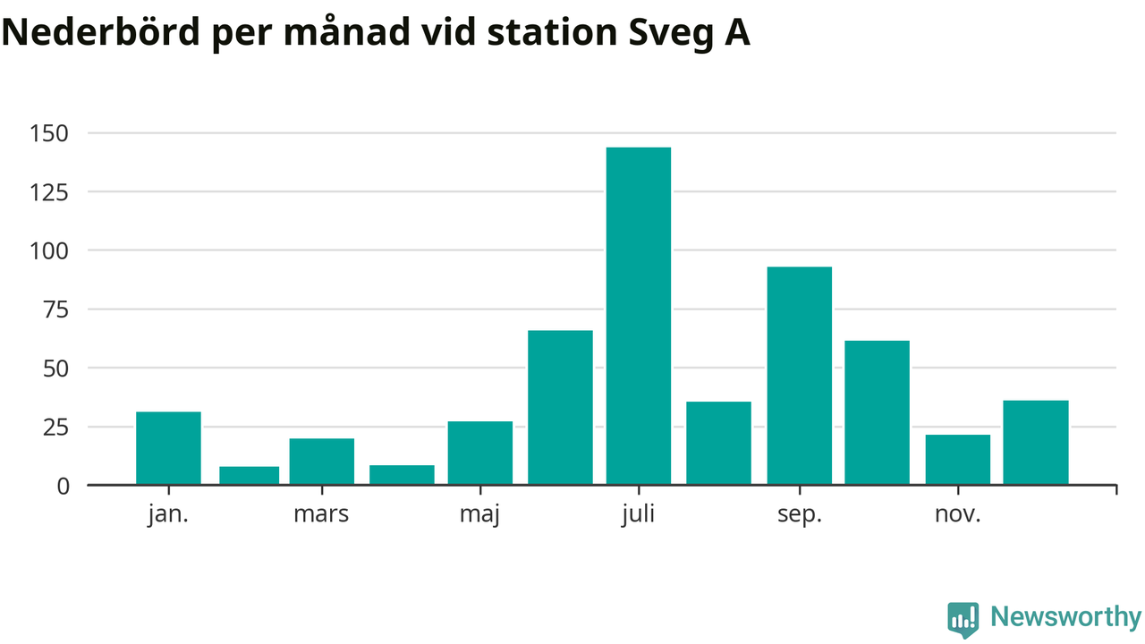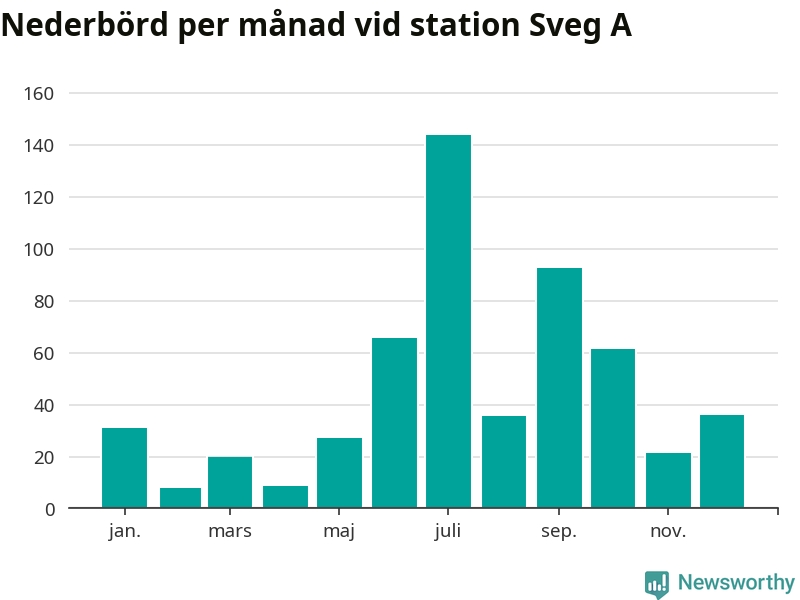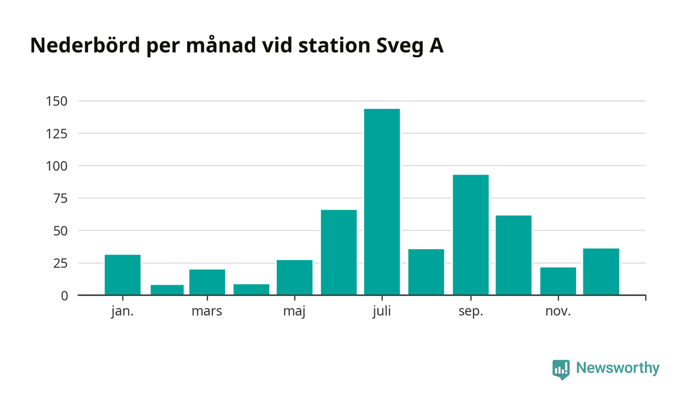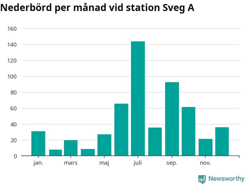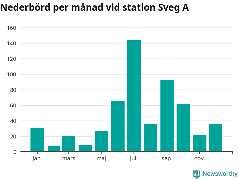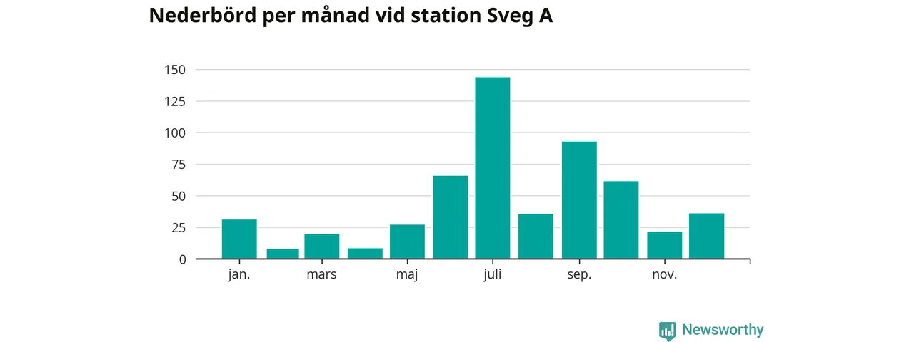 Nederbördsmässigt var 2025 ett ganska normalt år vid Sveg A. Totalt föll 550 millimeter nederbörd vid stationen, att jämföra med de senaste tre decenniernas genomsnitt på 518 millimeter. Månaden med mest nederbörd var juli, med 144 millimeter.