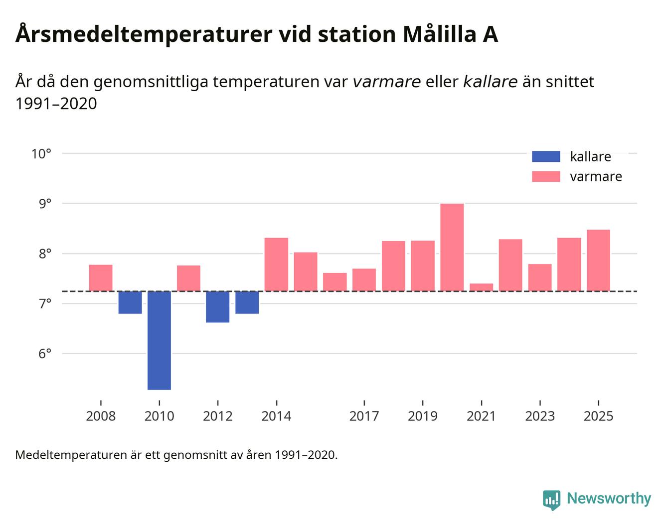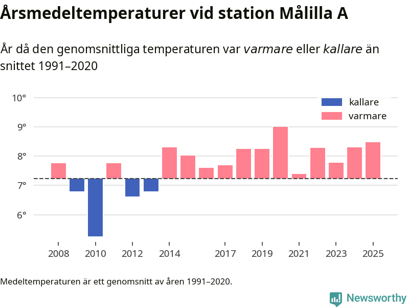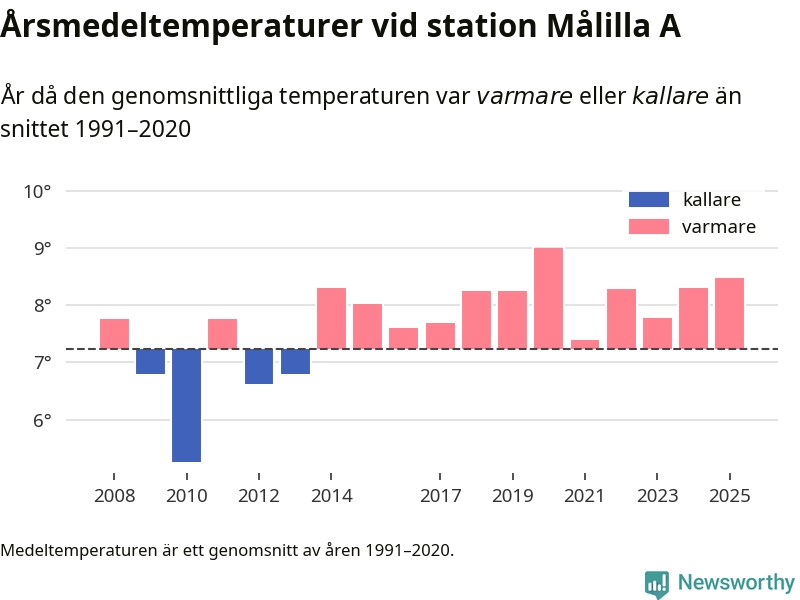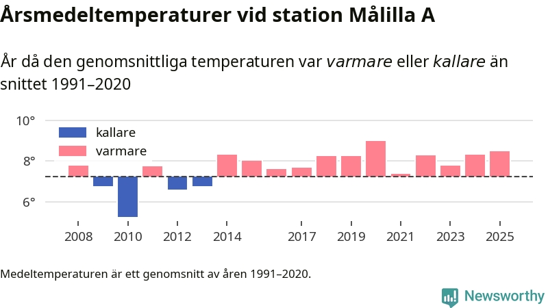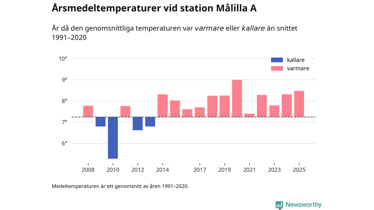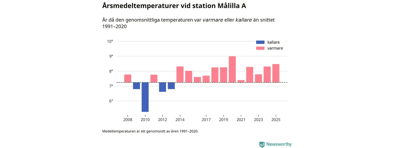 Årsmedeltemperaturen vid Målilla A 13 kilometer söder om centrala Hultsfred – den enda aktiva, SMHI-anslutna stationen som mäter medeltemperaturer i Hultsfreds kommun – var under 2025 8,5 grader, 1,2 grader högre än genomsnittet de senaste decennierna. Det visar Newsworthys beräkningar, som bygger på delvis preliminär observationsdata från SMHI.