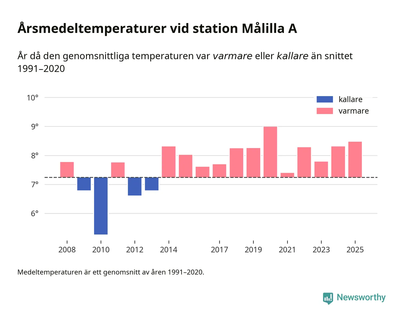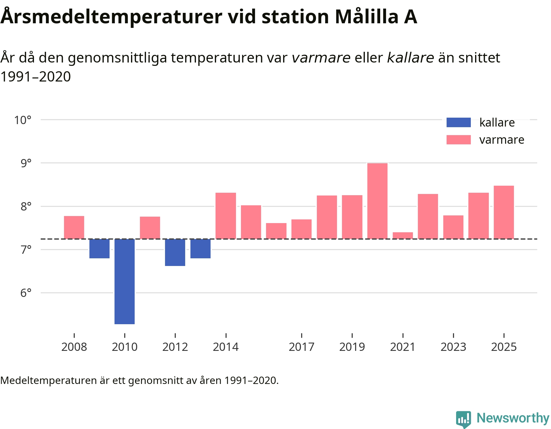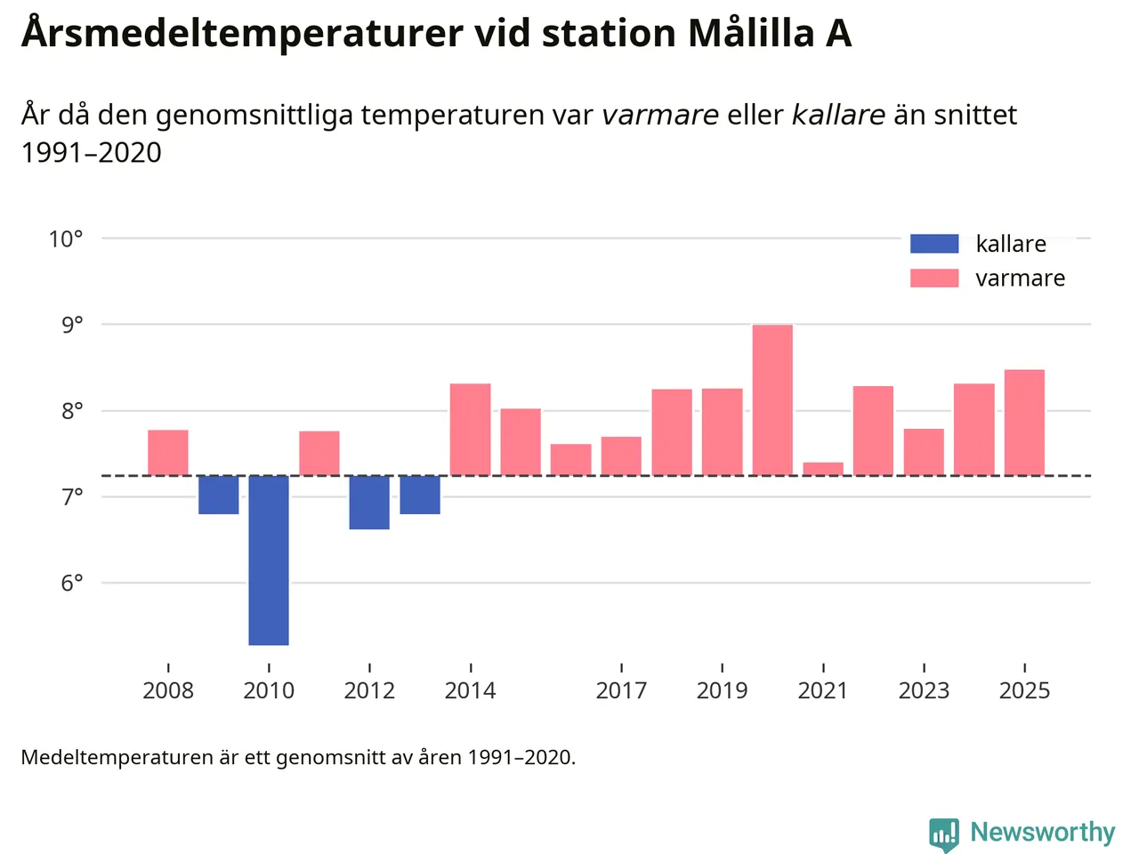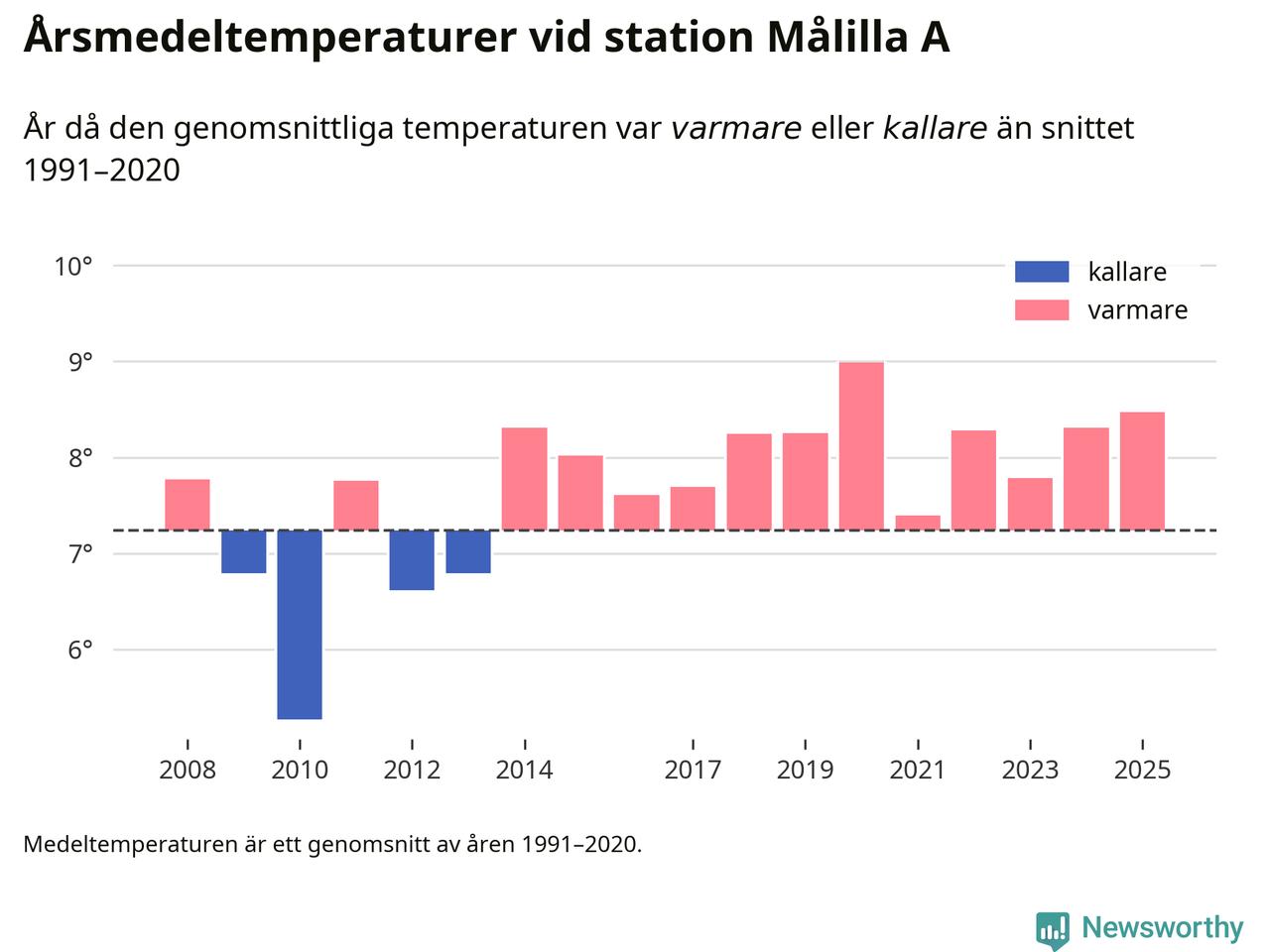Årsmedeltemperaturen vid Målilla A 13 kilometer söder om centrala Hultsfred – den enda aktiva, SMHI-anslutna stationen som mäter medeltemperaturer i Hultsfreds kommun – var under 2025 8,5 grader, 1,2 grader högre än genomsnittet de senaste decennierna. Det visar Newsworthys beräkningar, som bygger på delvis preliminär observationsdata från SMHI.