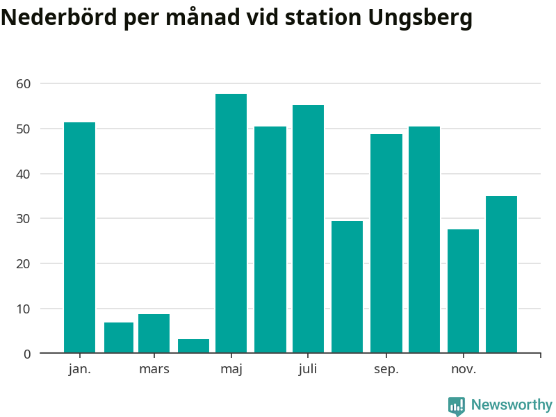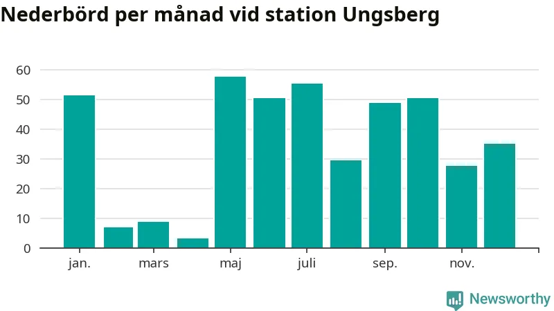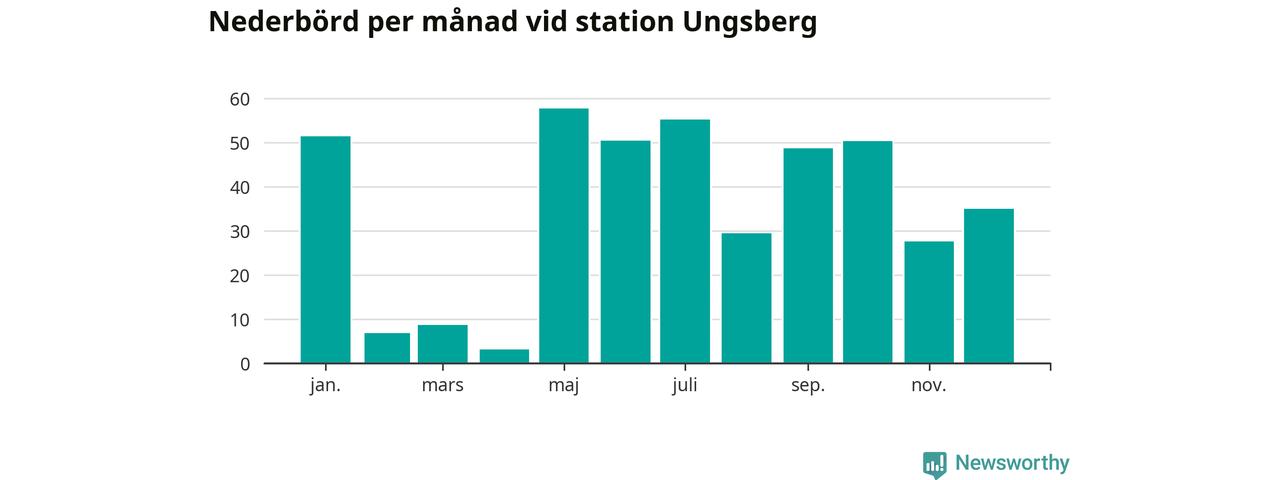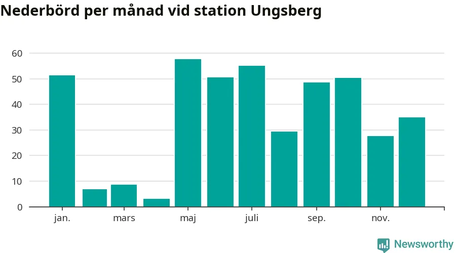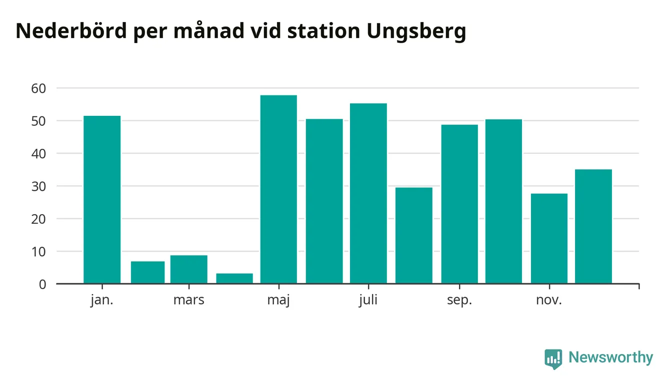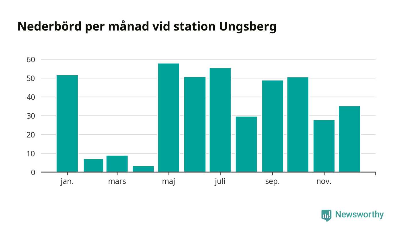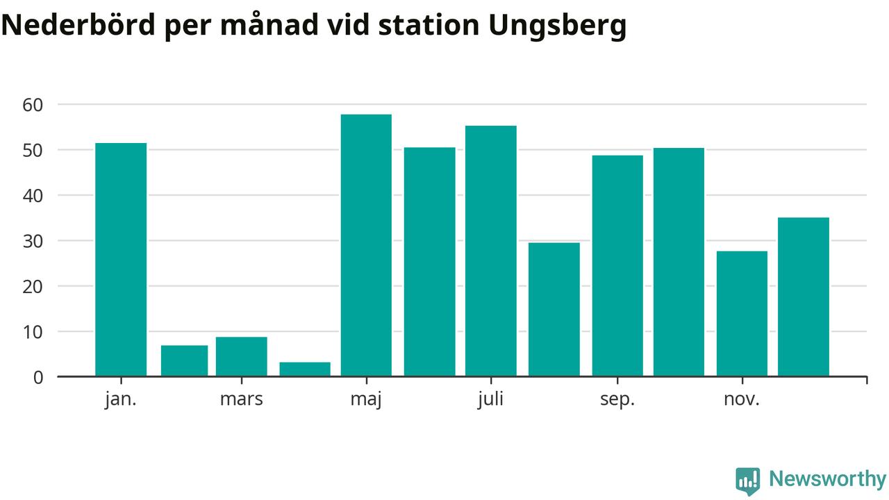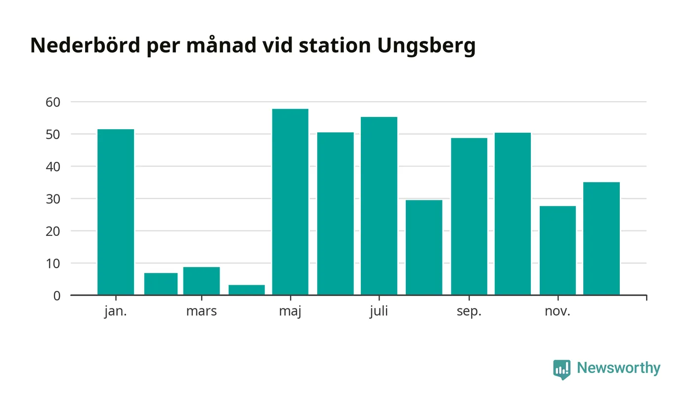 Nederbördsmässigt var 2025 ett torrare år än vanligt , åtminstone vid Ungsberg, fem kilometer öster om centrala Hultsfred2. Totalt föll 425 millimeter nederbörd vid stationen, att jämföra med de senaste tre decenniernas genomsnitt på 603 millimeter. Månaden med mest nederbörd var maj, med 58 millimeter.
