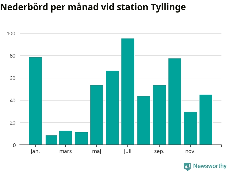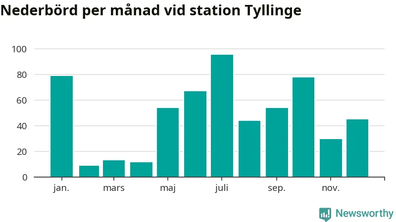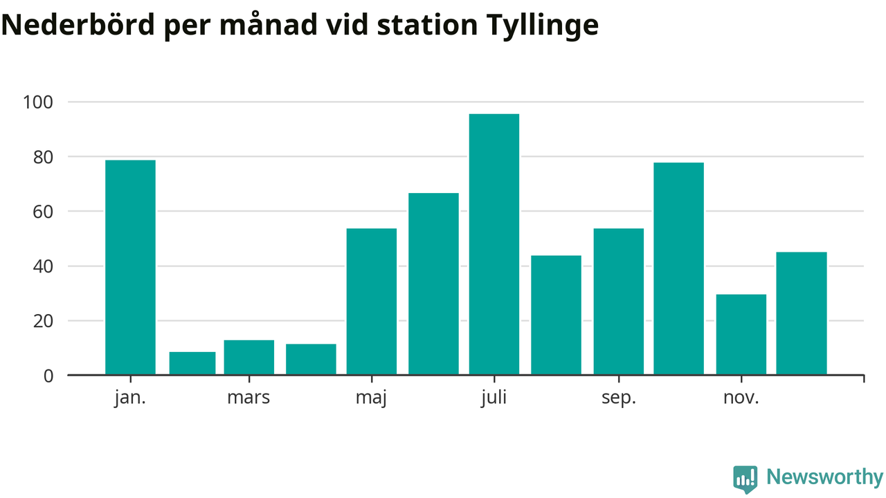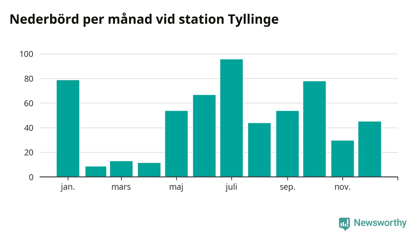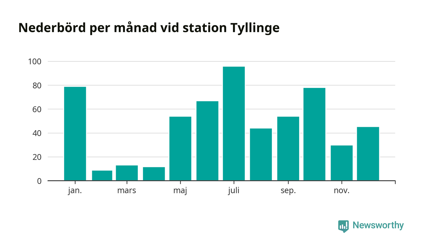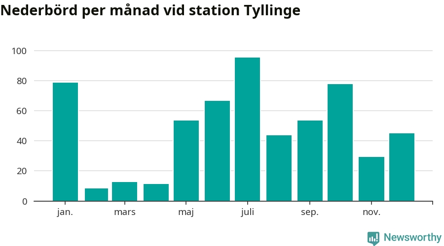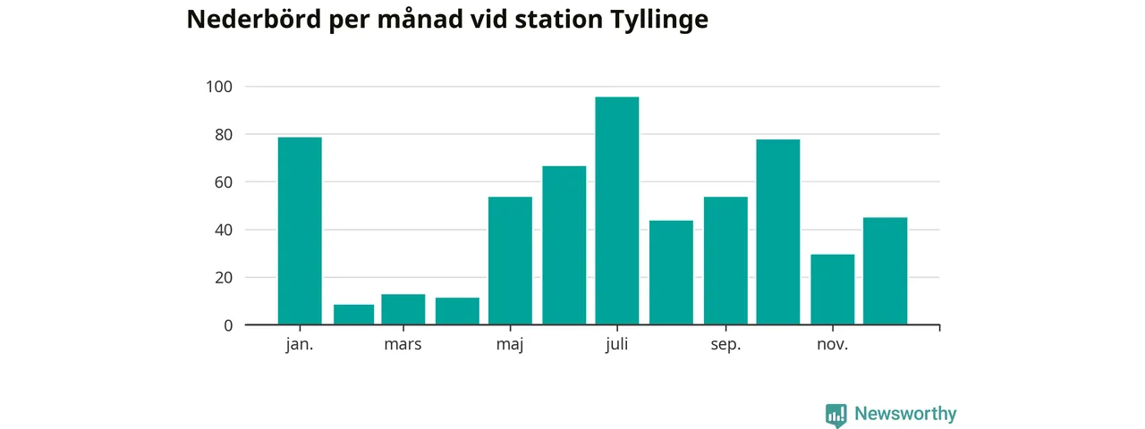 Nederbördsmässigt var 2025 ett torrare år än vanligt , åtminstone vid Tyllinge, två mil söder om centrala Åtvidaberg2. Totalt föll 576 millimeter nederbörd vid stationen, att jämföra med de senaste tre decenniernas genomsnitt på 647 millimeter. Månaden med mest nederbörd var juli, med 95 millimeter.