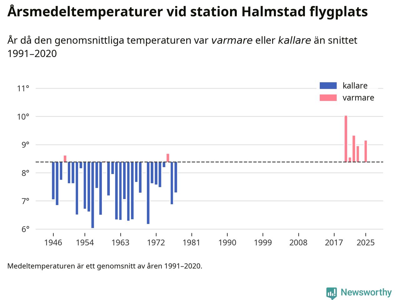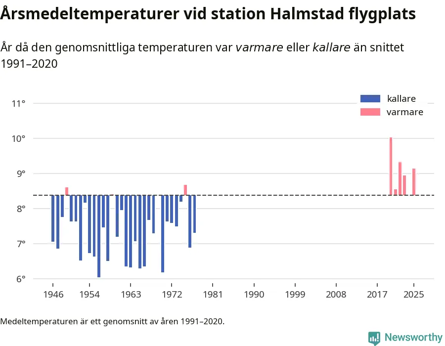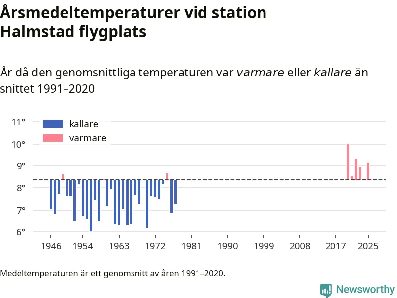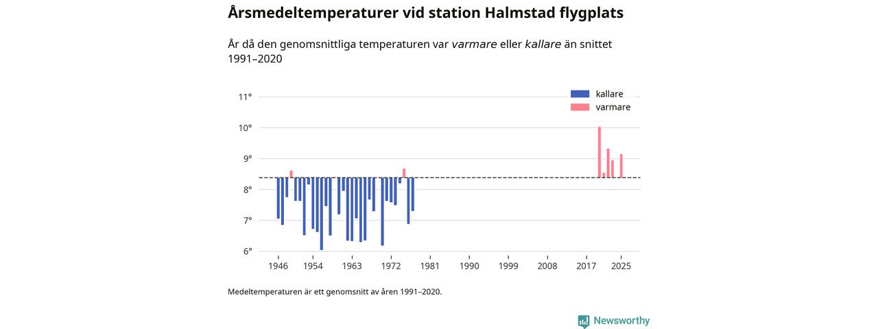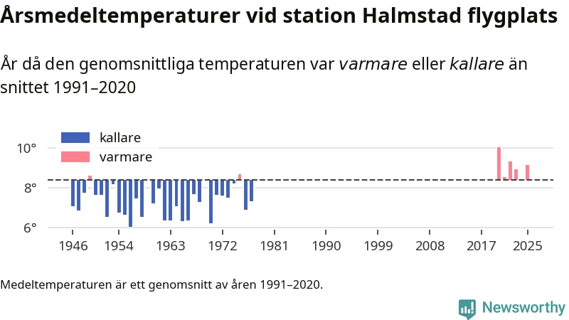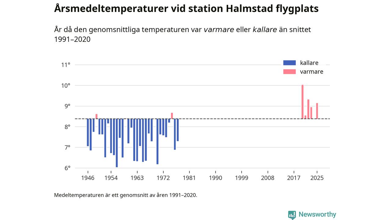 Årsmedeltemperaturen vid Halmstad flygplats 2,5 mil nordväst om centrala Laholm1 var under 2025 9,1 grader, 0,8 grader högre än genomsnittet de senaste decennierna. Det visar Newsworthys beräkningar, som bygger på delvis preliminär observationsdata från SMHI.