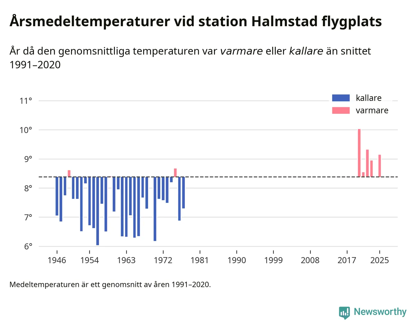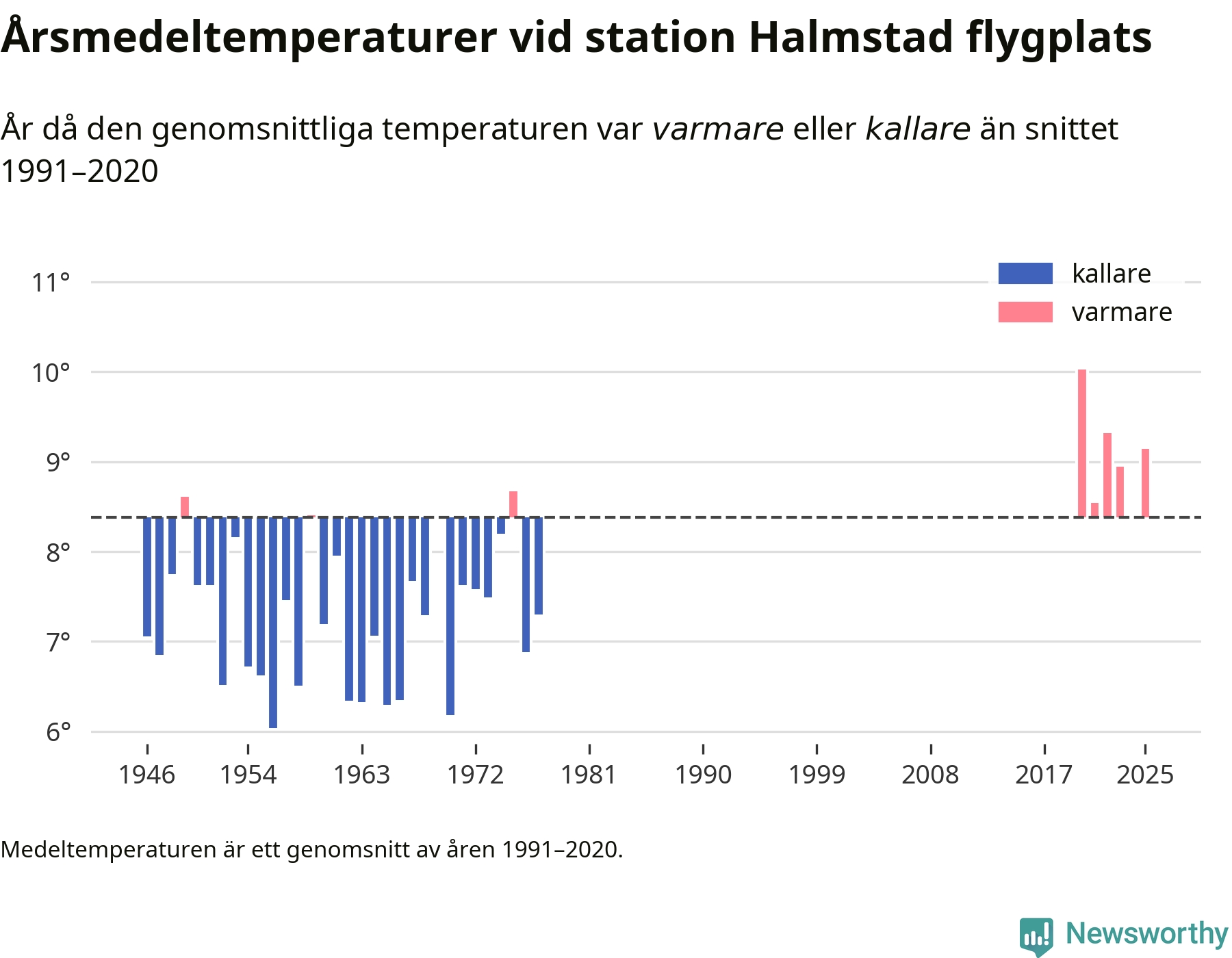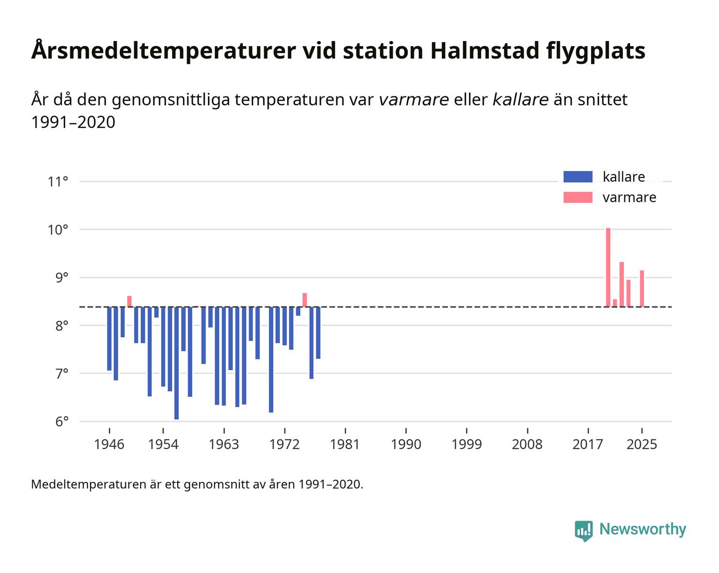 Årsmedeltemperaturen vid Halmstad flygplats 2,5 mil nordväst om centrala Laholm1 var under 2025 9,1 grader, 0,8 grader högre än genomsnittet de senaste decennierna. Det visar Newsworthys beräkningar, som bygger på delvis preliminär observationsdata från SMHI.