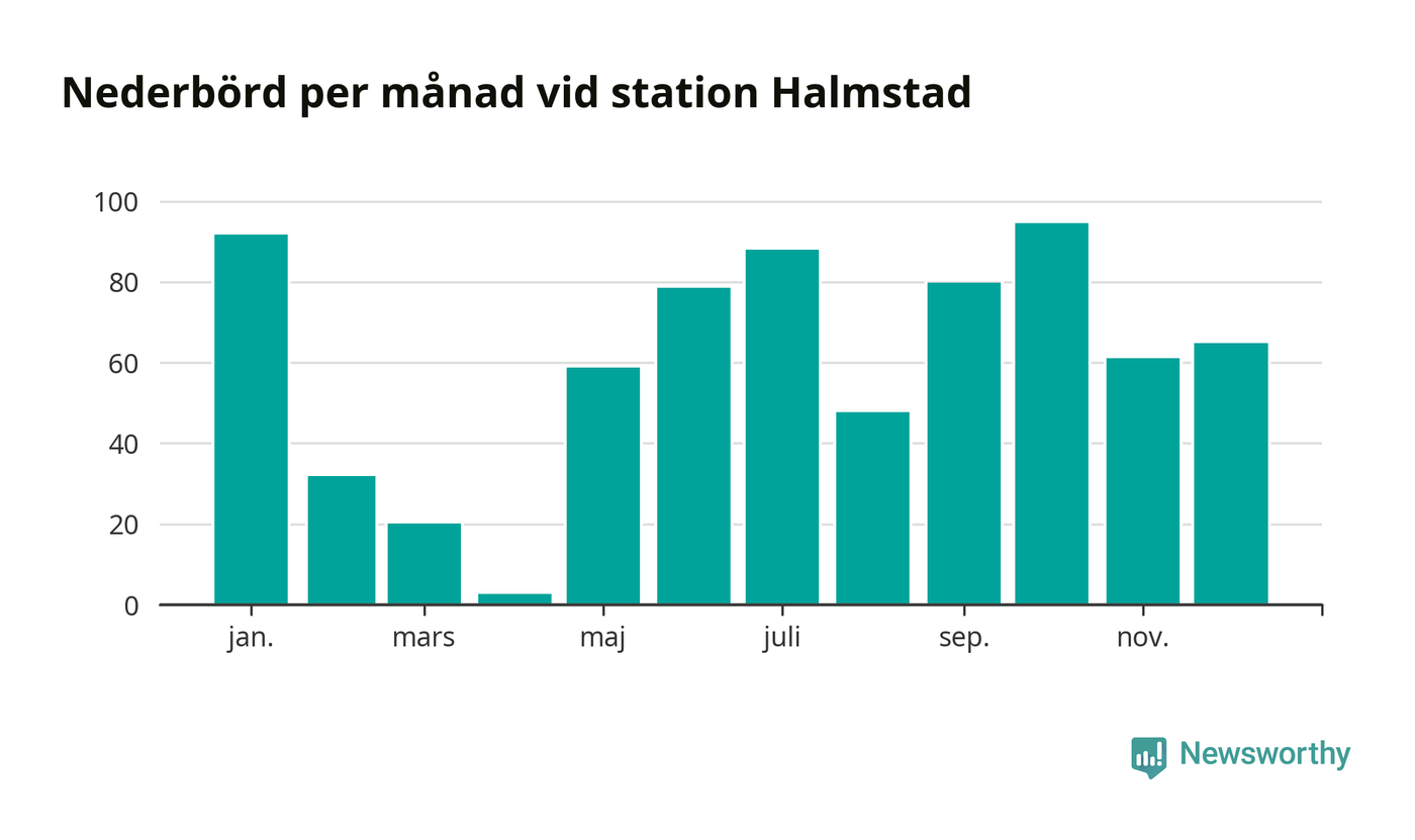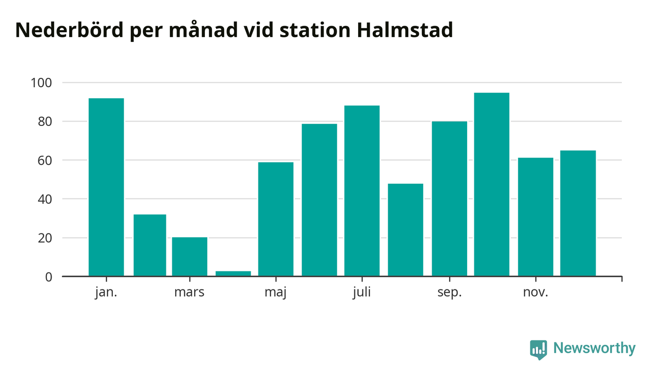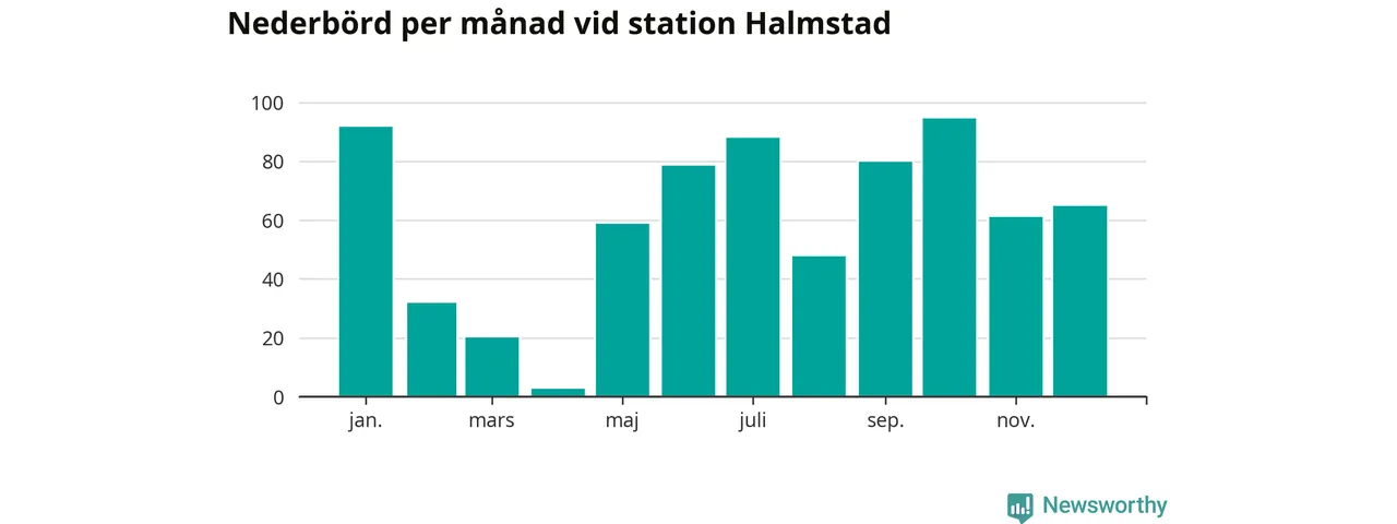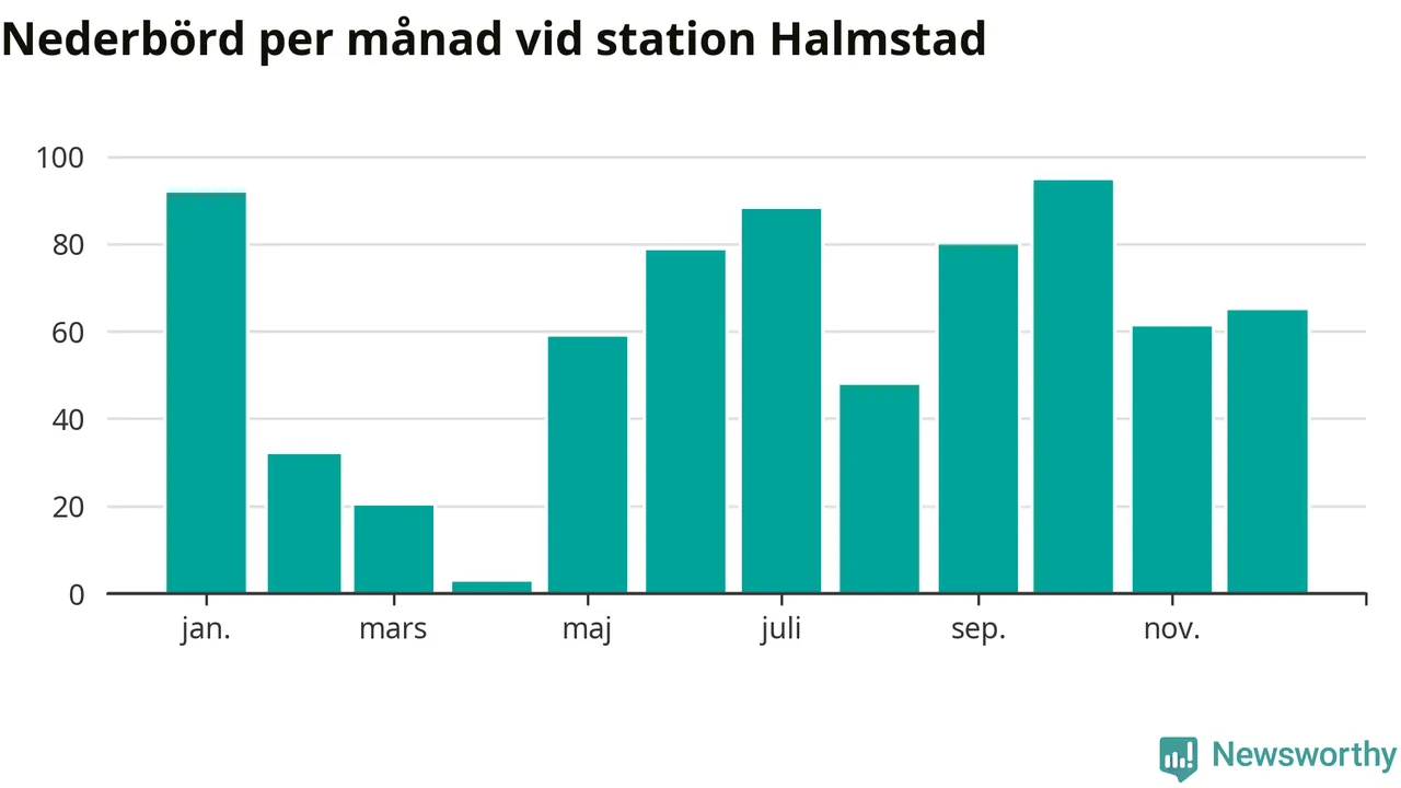Nederbördsmässigt var 2025 ett torrare år än vanligt , åtminstone vid Halmstad, fyra kilometer öster om centrala Halmstad3. Totalt föll 719 millimeter nederbörd vid stationen, att jämföra med de senaste tre decenniernas genomsnitt på 850 millimeter. Månaden med mest nederbörd var oktober, med 95 millimeter.