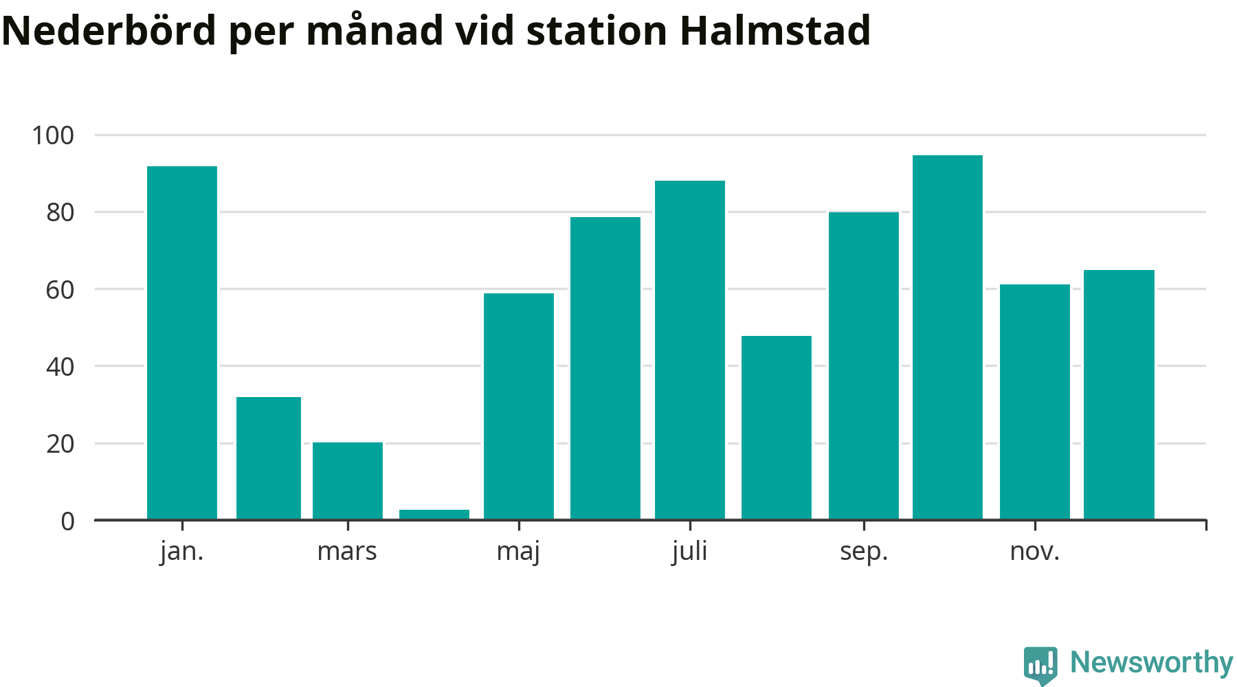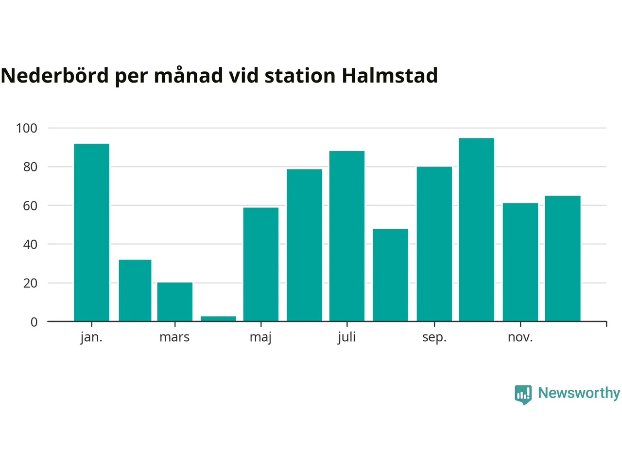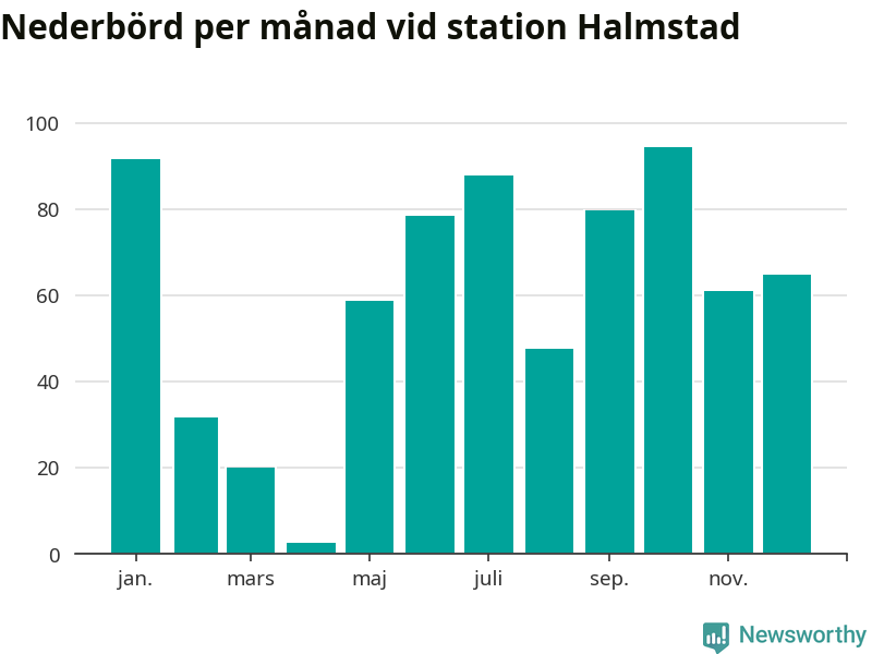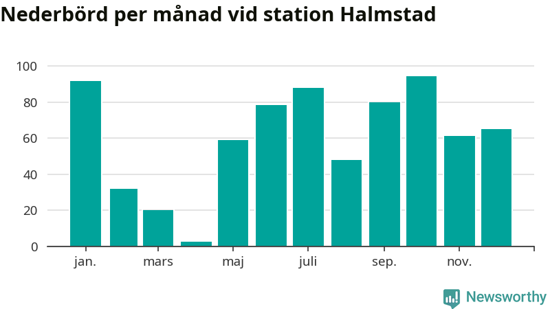 Nederbördsmässigt var 2025 ett torrare år än vanligt , åtminstone vid Halmstad, fyra kilometer öster om centrala Halmstad3. Totalt föll 719 millimeter nederbörd vid stationen, att jämföra med de senaste tre decenniernas genomsnitt på 850 millimeter. Månaden med mest nederbörd var oktober, med 95 millimeter.