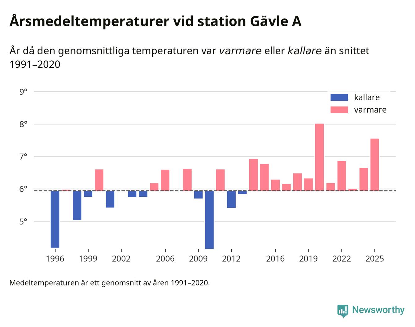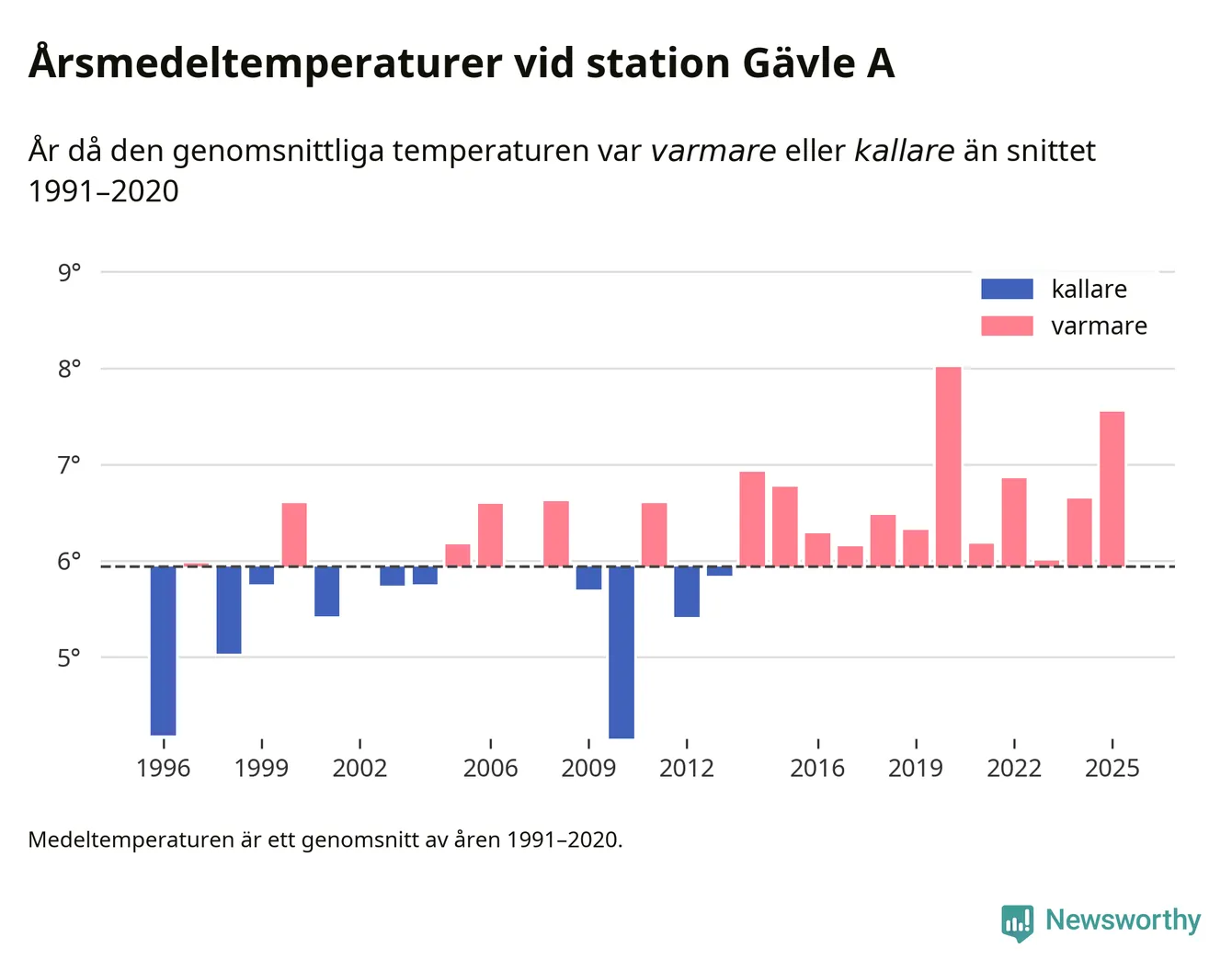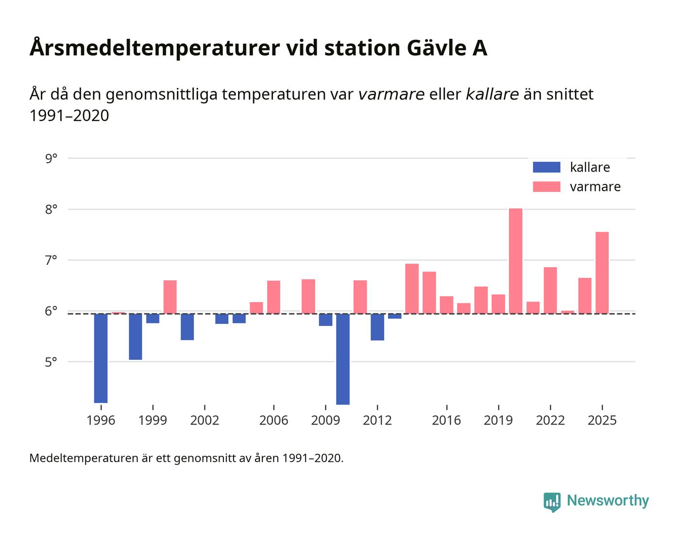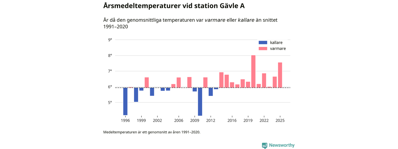 Årsmedeltemperaturen vid Gävle A 16 kilometer nordväst om Skutskär var under 2025 7,6 grader, 1,6 grader högre än genomsnittet de senaste decennierna. Det är den näst högsta noteringen sedan 1996, visar Newsworthys beräkningar baserade på delvis preliminär observationsdata från SMHI.