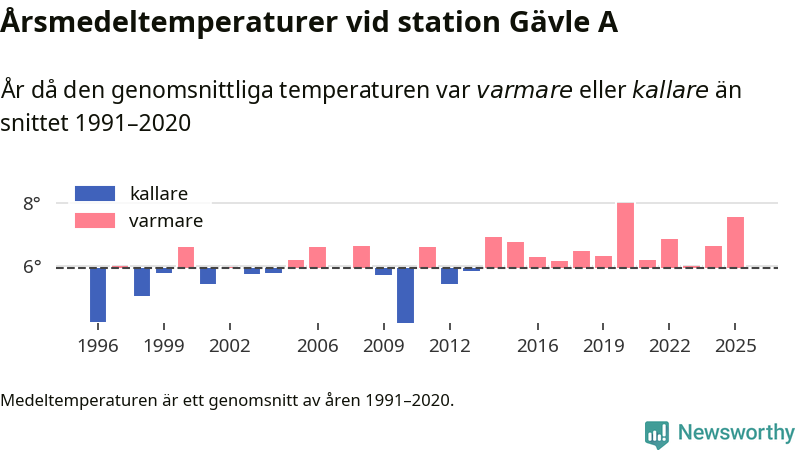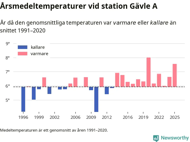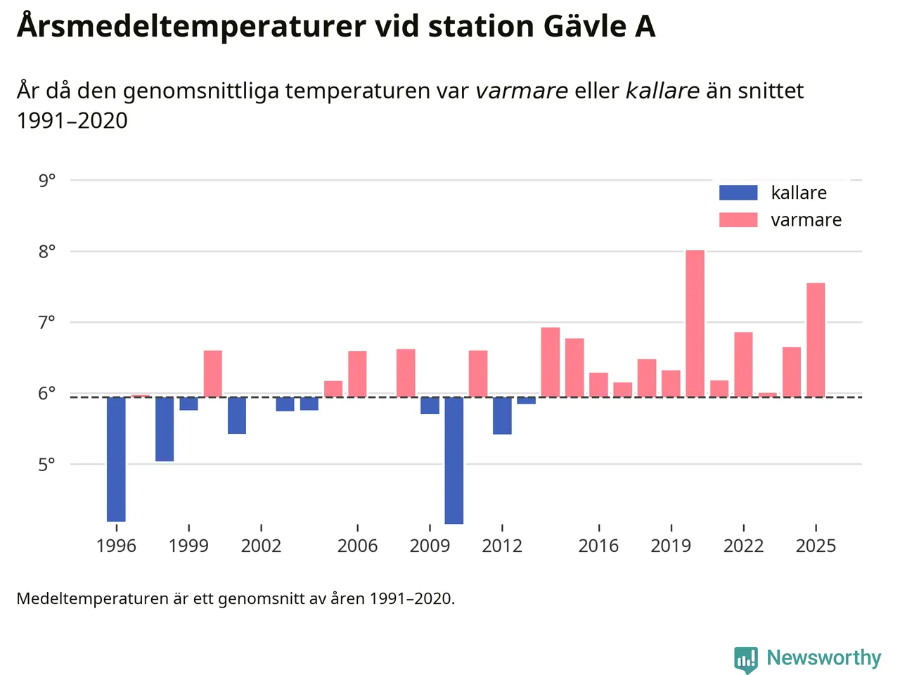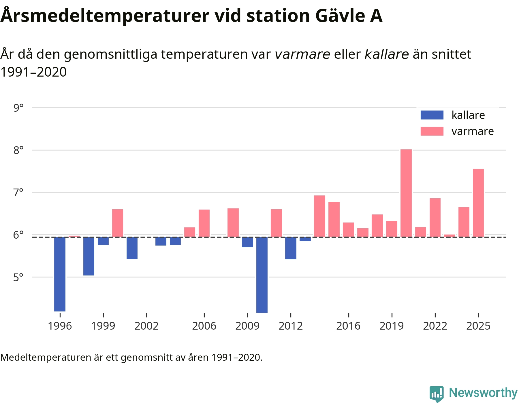 Årsmedeltemperaturen vid Gävle A 16 kilometer nordväst om Skutskär var under 2025 7,6 grader, 1,6 grader högre än genomsnittet de senaste decennierna. Det är den näst högsta noteringen sedan 1996, visar Newsworthys beräkningar baserade på delvis preliminär observationsdata från SMHI.