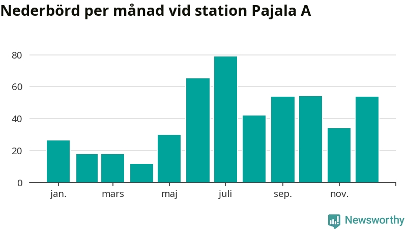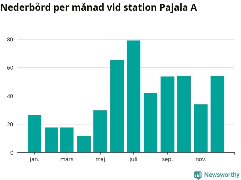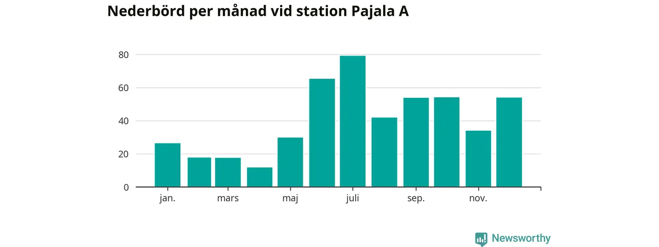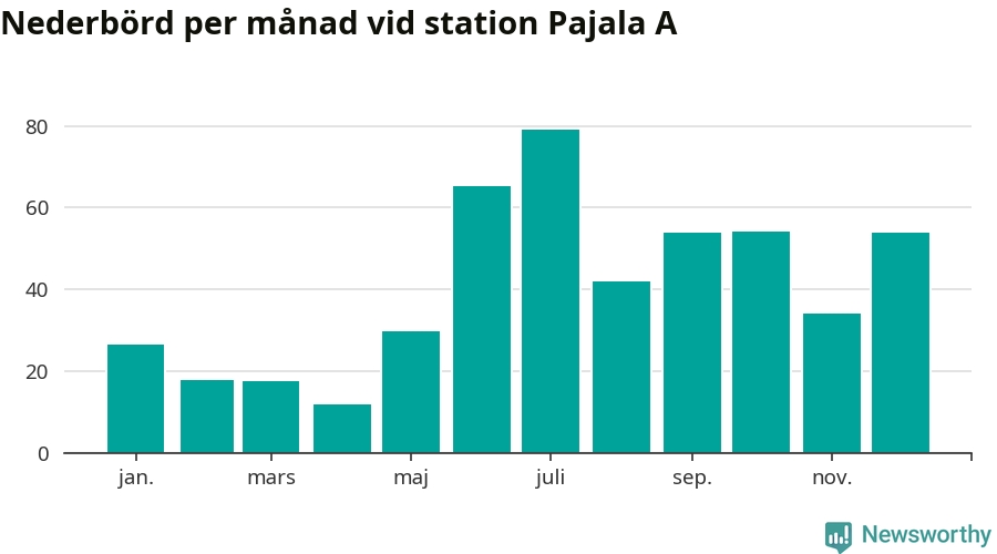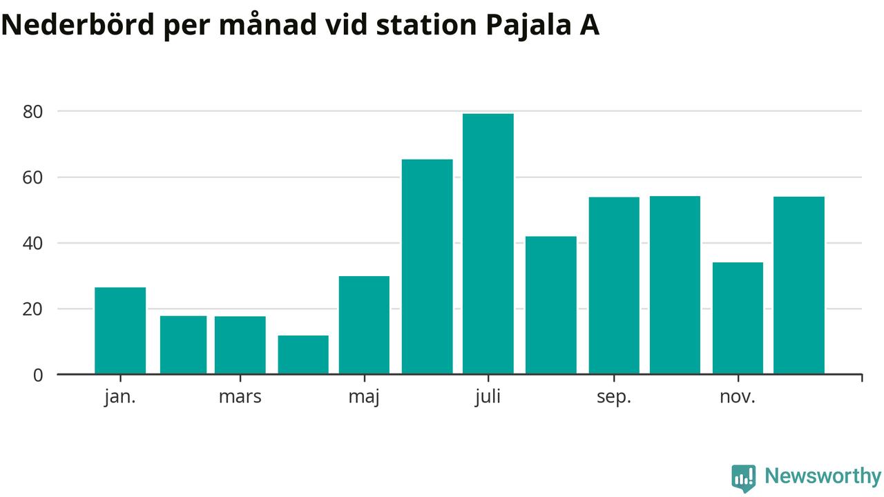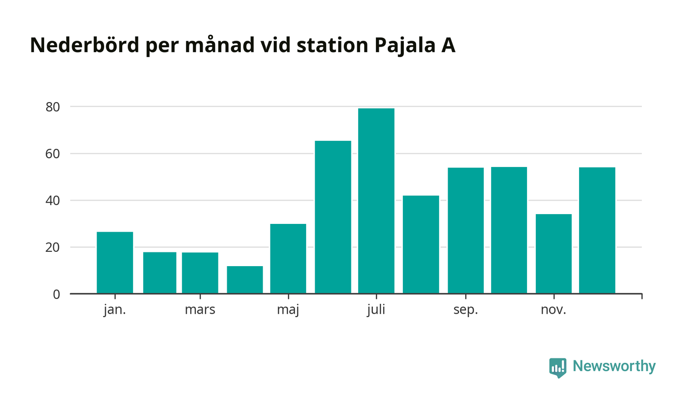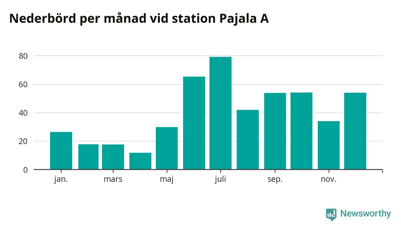 Nederbördsmässigt var 2025 ett ganska normalt år vid Pajala A. Totalt föll 485 millimeter nederbörd vid stationen, att jämföra med de senaste tre decenniernas genomsnitt på 491 millimeter. Månaden med mest nederbörd var juli, med 79 millimeter.