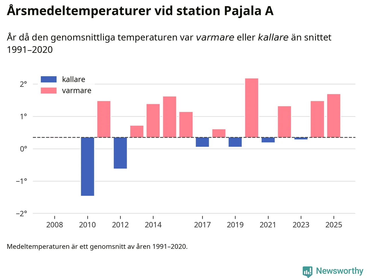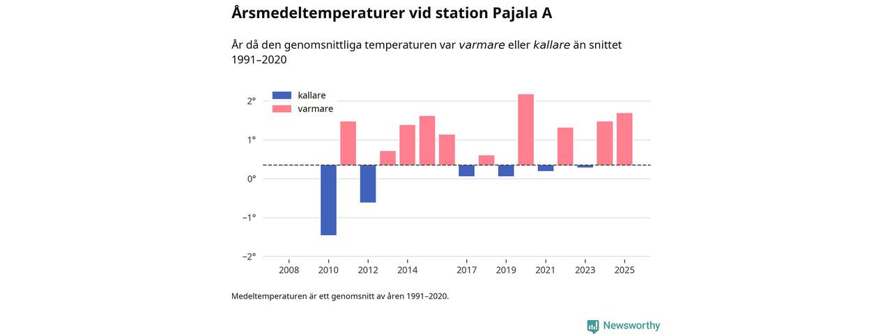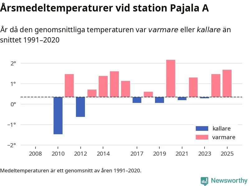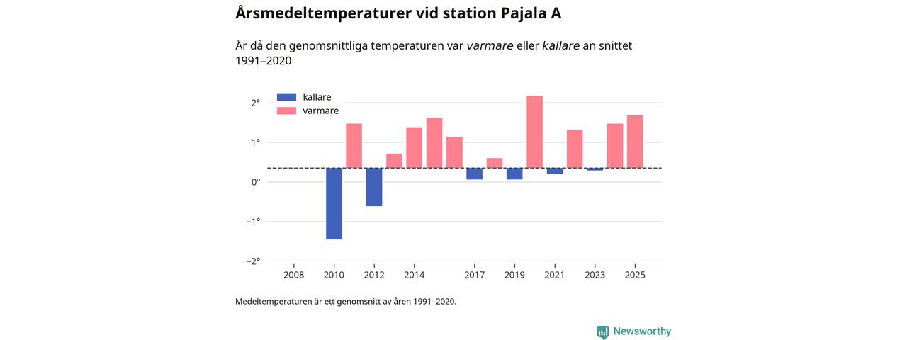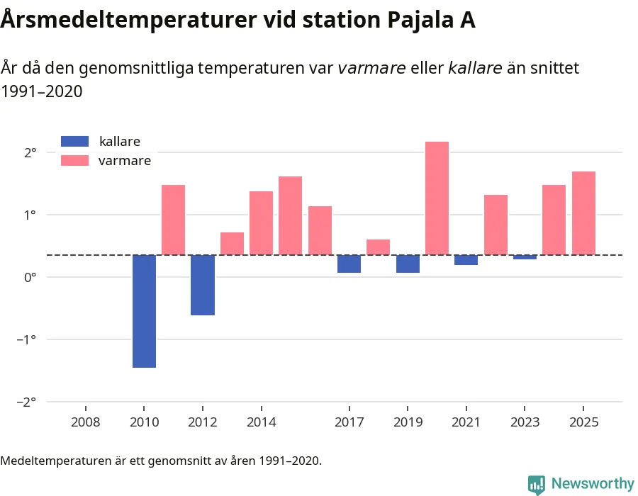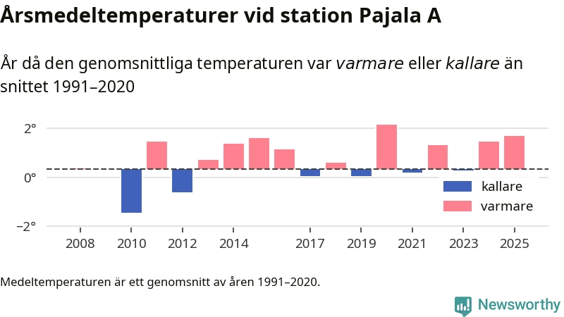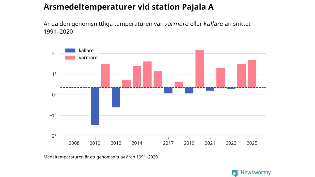Årsmedeltemperaturen vid Pajala A i centrala Pajala var under 2025 1,7 grader, 1,3 grader högre än genomsnittet de senaste decennierna. Det visar Newsworthys beräkningar, som bygger på delvis preliminär observationsdata från SMHI.