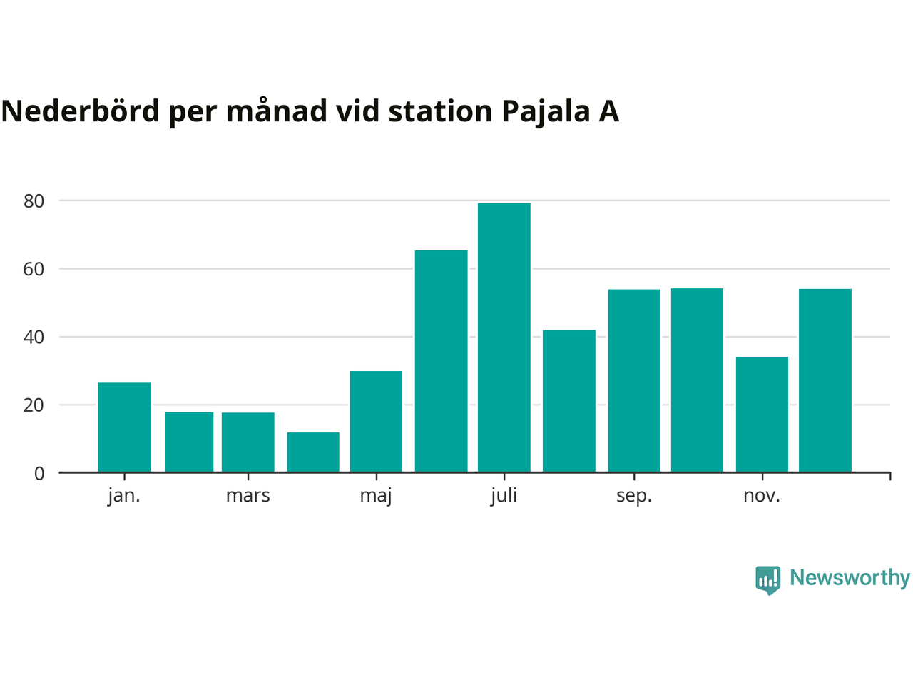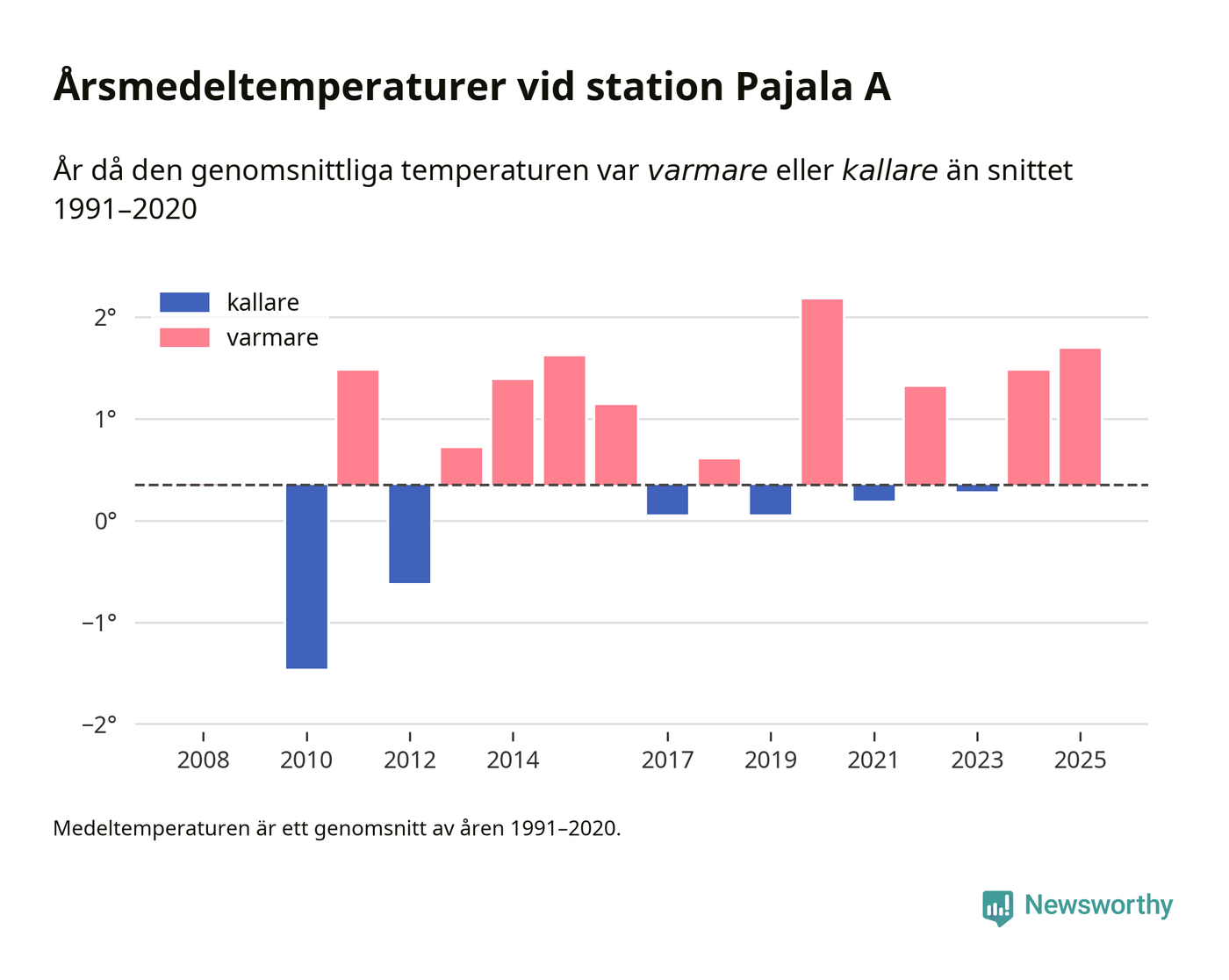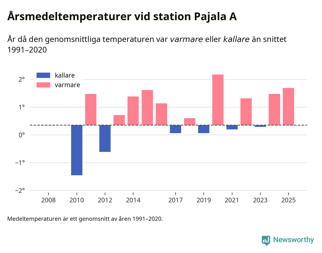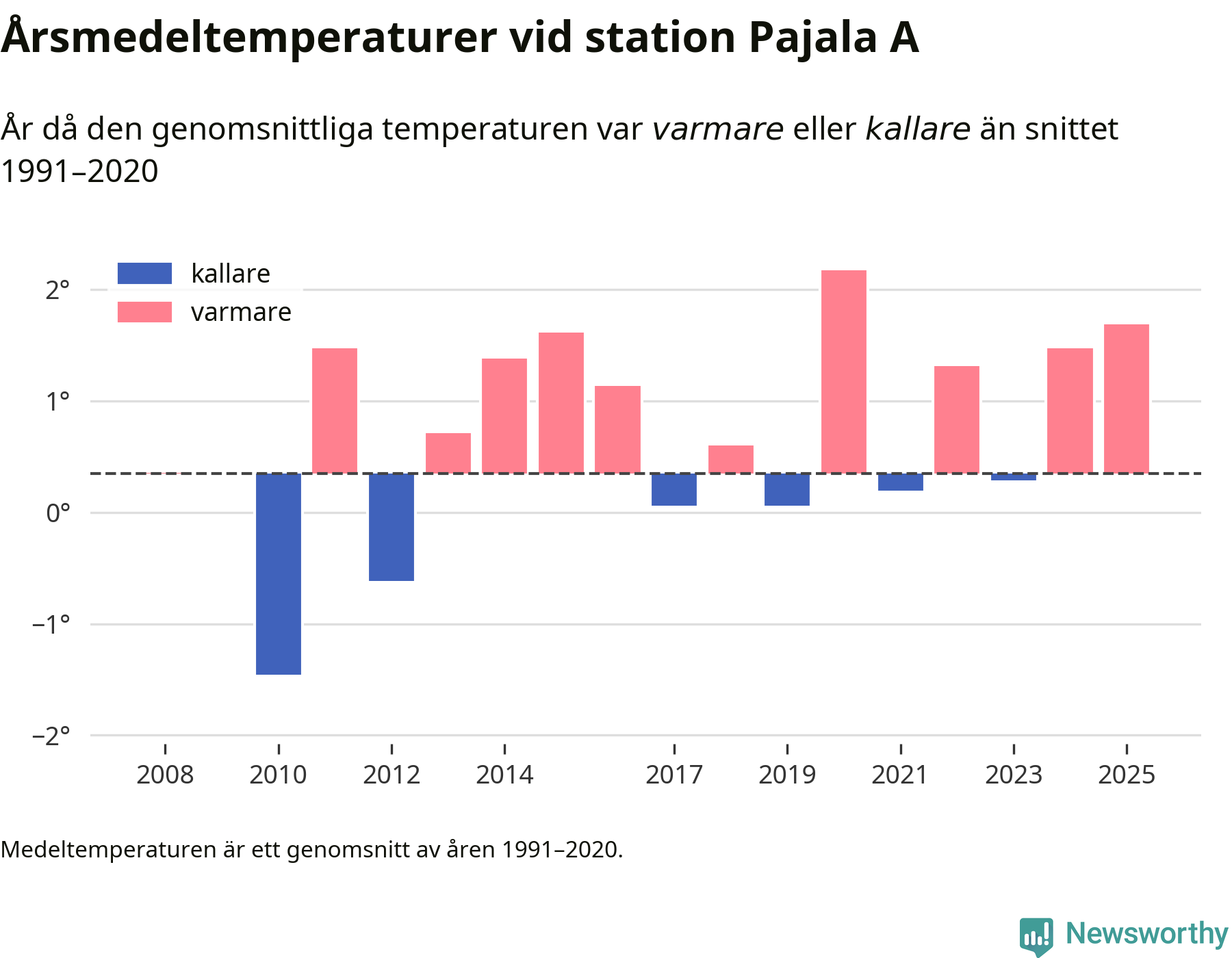 Årsmedeltemperaturen vid Pajala A i centrala Pajala var under 2025 1,7 grader, 1,3 grader högre än genomsnittet de senaste decennierna. Det visar Newsworthys beräkningar, som bygger på delvis preliminär observationsdata från SMHI.