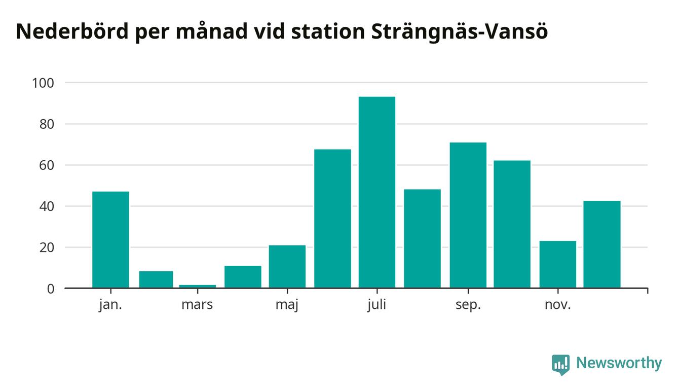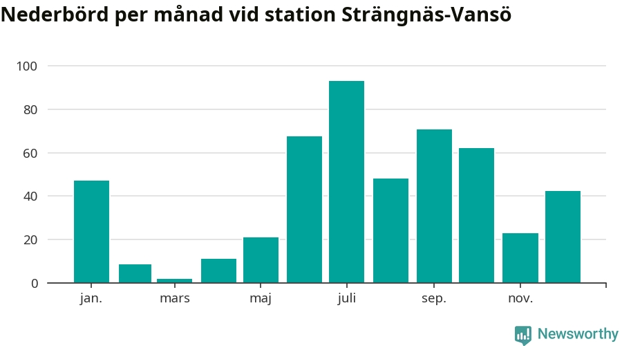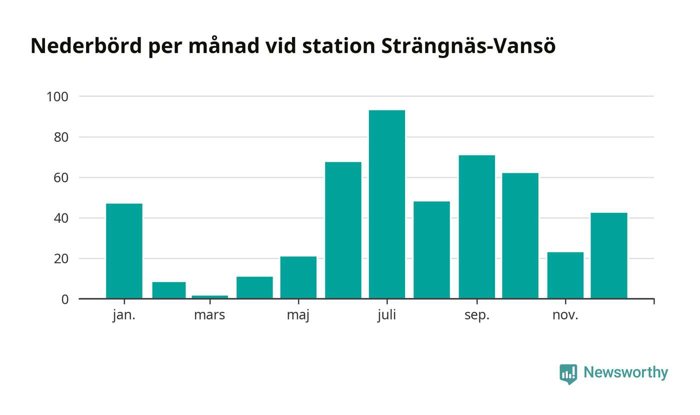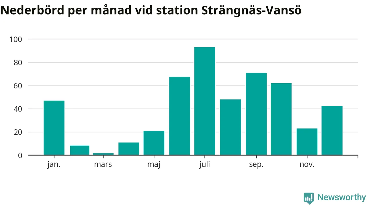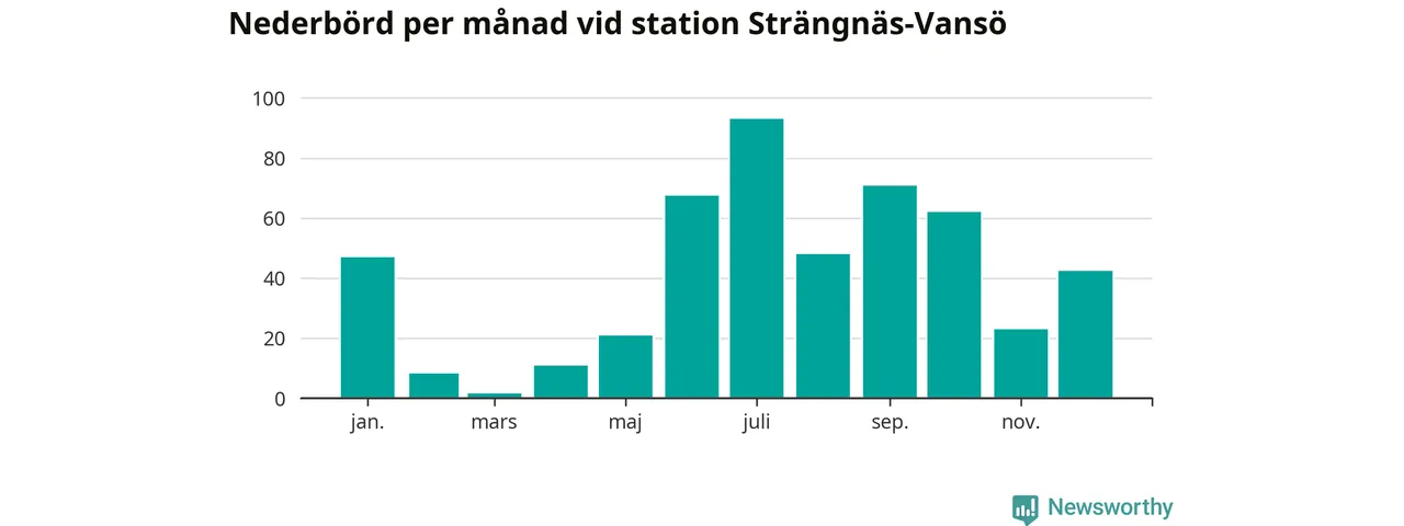 Nederbördsmässigt var 2025 ett ganska normalt år, åtminstone vid Strängnäs-Vansö, sex kilometer nordväst om centrala Strängnäs2. Totalt föll 495 millimeter nederbörd vid stationen, att jämföra med de senaste tre decenniernas genomsnitt på 535 millimeter. Månaden med mest nederbörd var juli, med 93 millimeter.