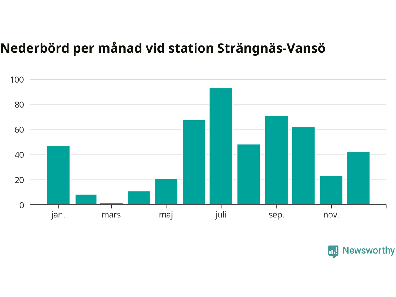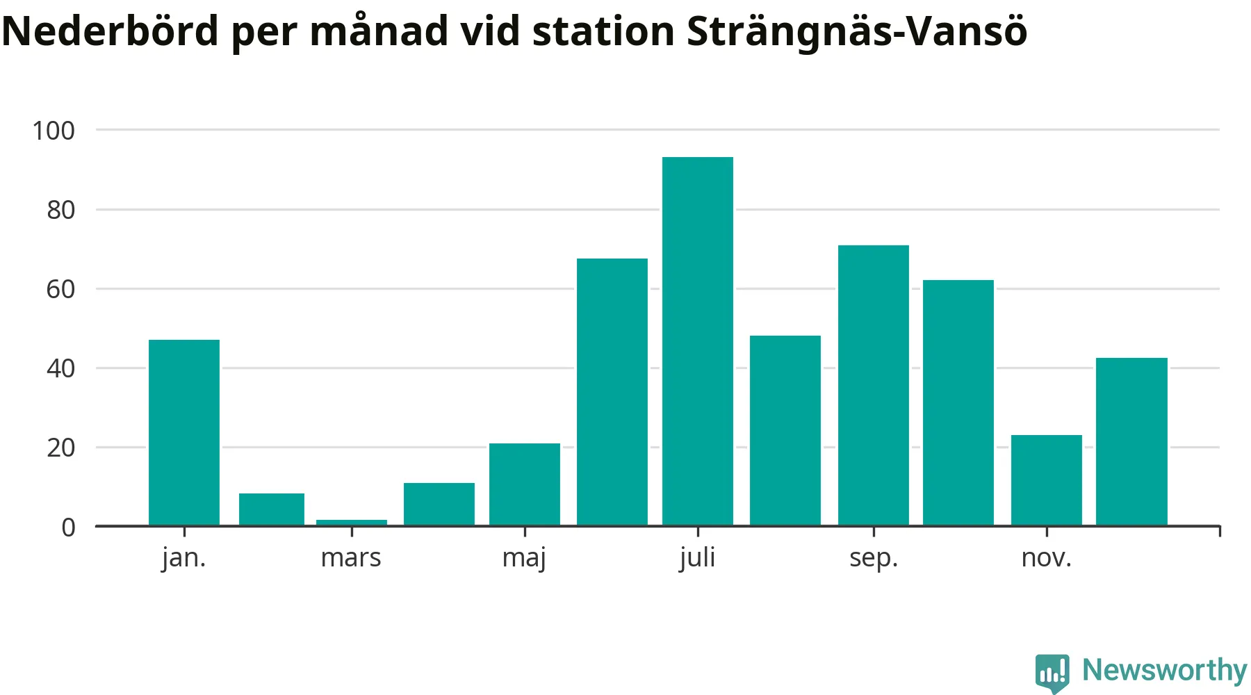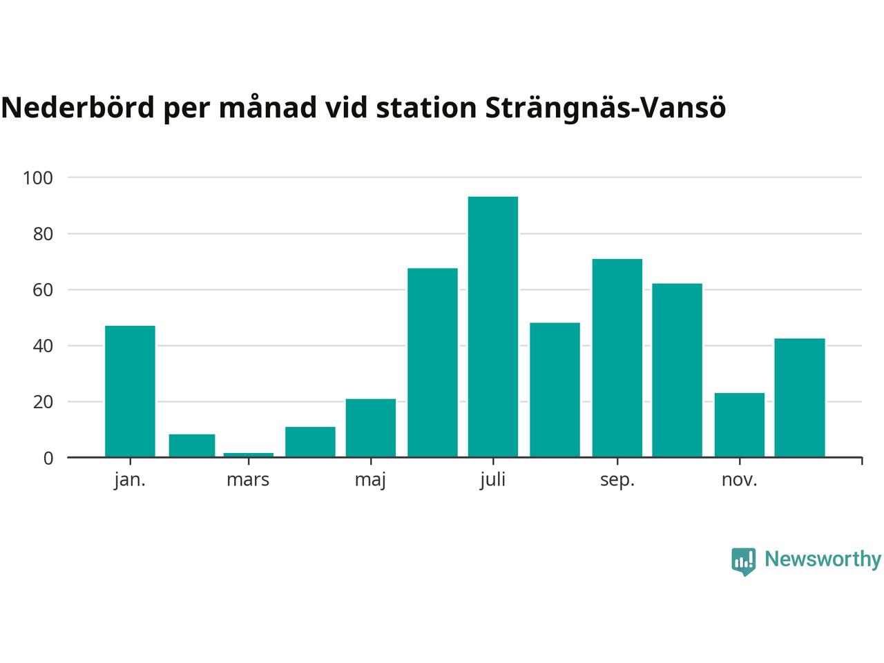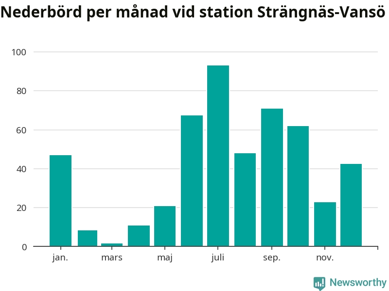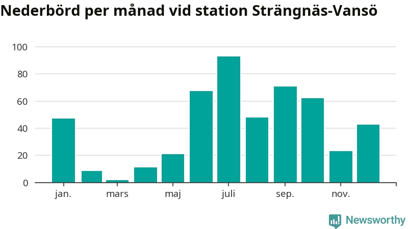 Nederbördsmässigt var 2025 ett ganska normalt år, åtminstone vid Strängnäs-Vansö, sex kilometer nordväst om centrala Strängnäs2. Totalt föll 495 millimeter nederbörd vid stationen, att jämföra med de senaste tre decenniernas genomsnitt på 535 millimeter. Månaden med mest nederbörd var juli, med 93 millimeter.