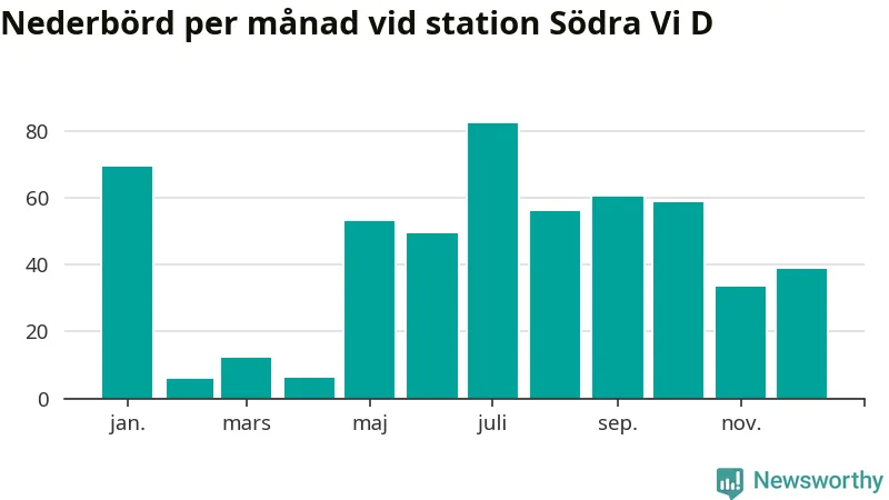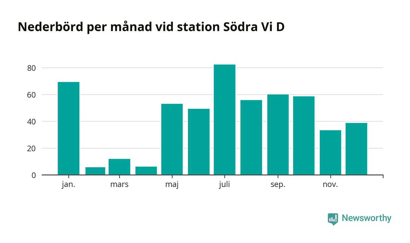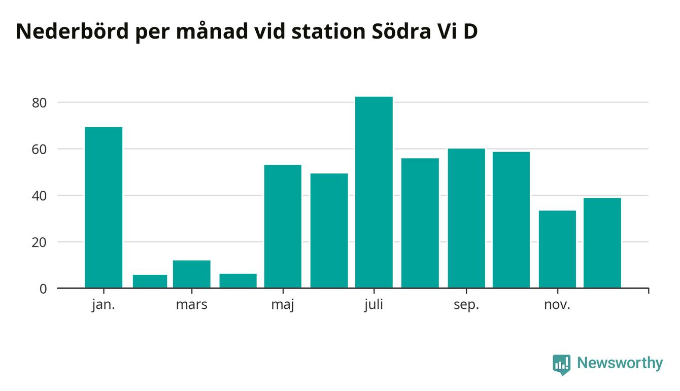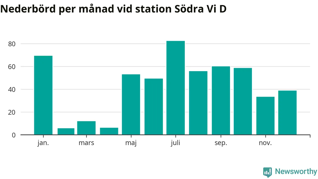Nederbördsmässigt var 2025 ett torrare år än vanligt , åtminstone vid Södra Vi D, tio kilometer nordväst om centrala Vimmerby. Totalt föll 525 millimeter nederbörd vid stationen, att jämföra med de senaste tre decenniernas genomsnitt på 643 millimeter. Månaden med mest nederbörd var juli, med 82 millimeter.