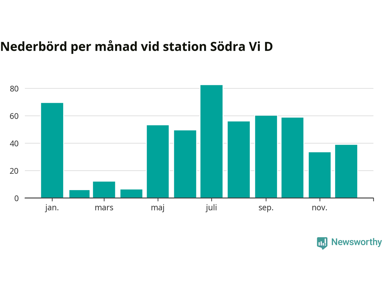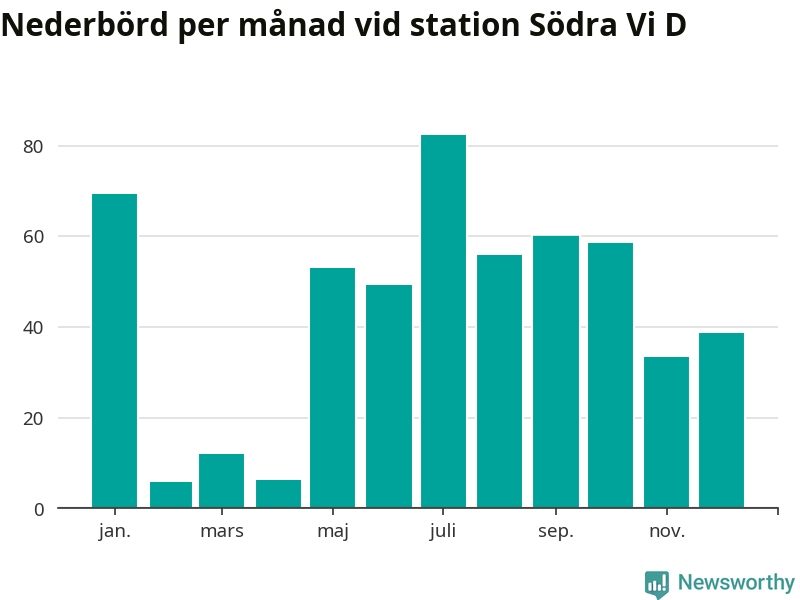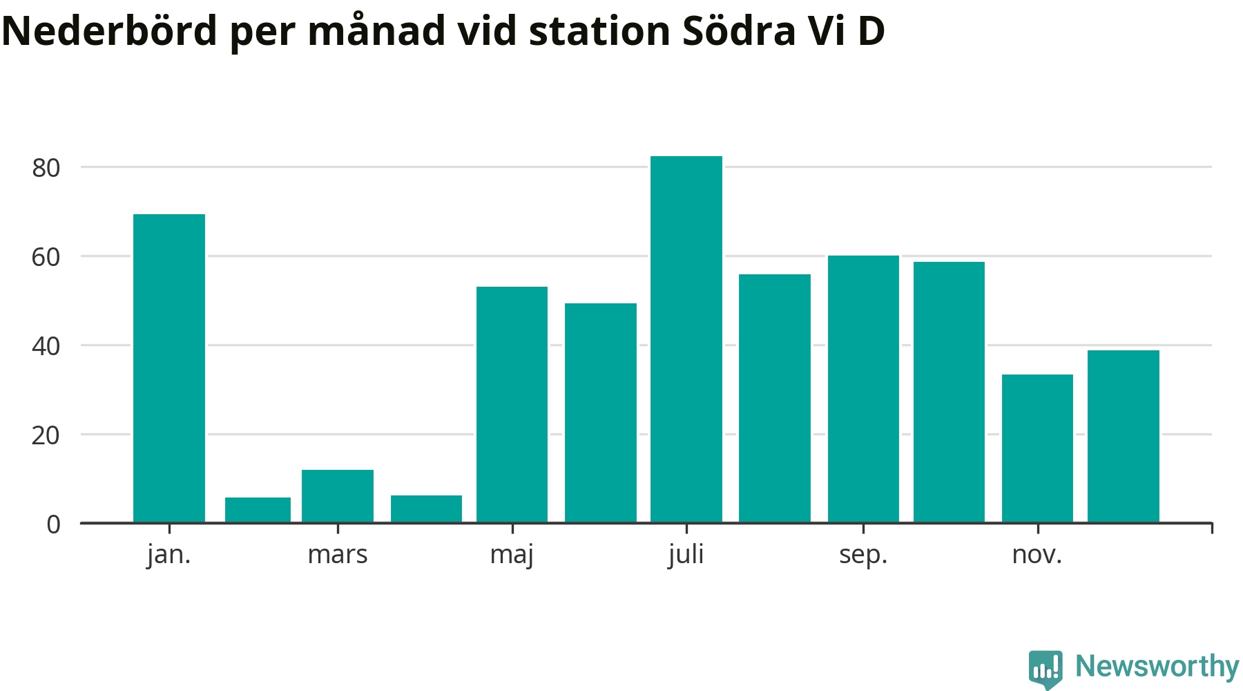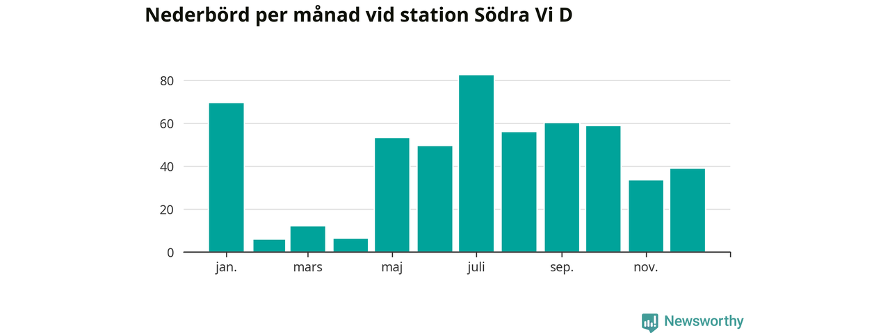 Nederbördsmässigt var 2025 ett torrare år än vanligt , åtminstone vid Södra Vi D, tio kilometer nordväst om centrala Vimmerby. Totalt föll 525 millimeter nederbörd vid stationen, att jämföra med de senaste tre decenniernas genomsnitt på 643 millimeter. Månaden med mest nederbörd var juli, med 82 millimeter.