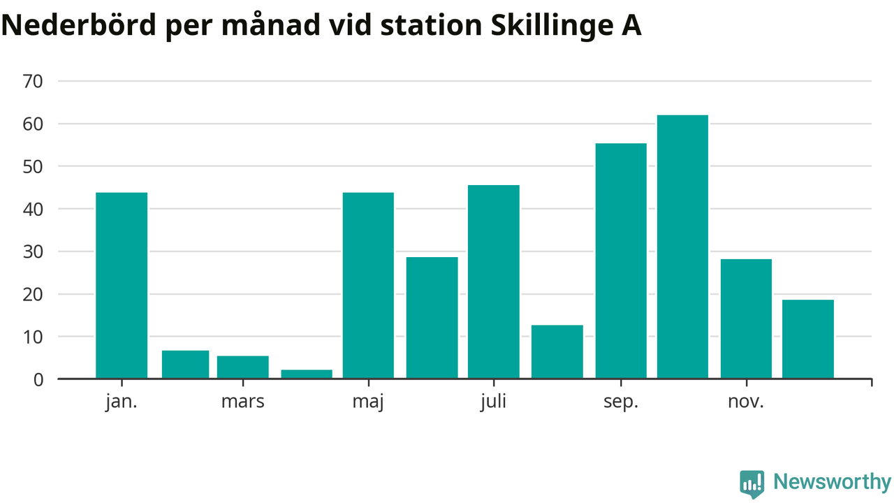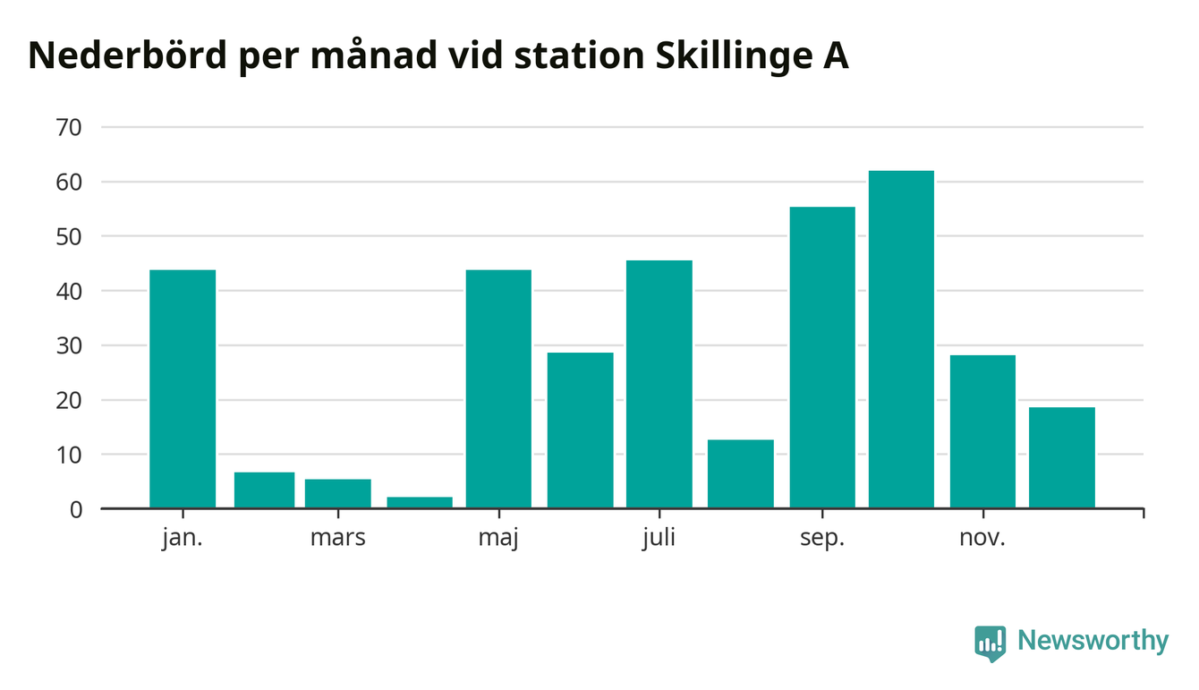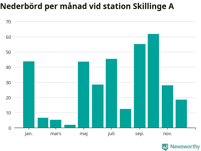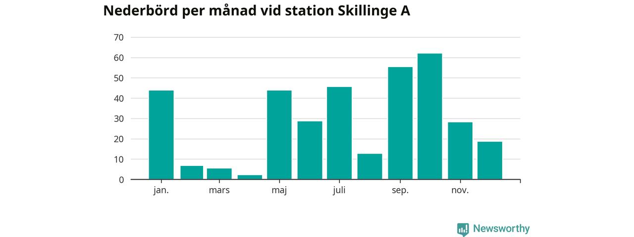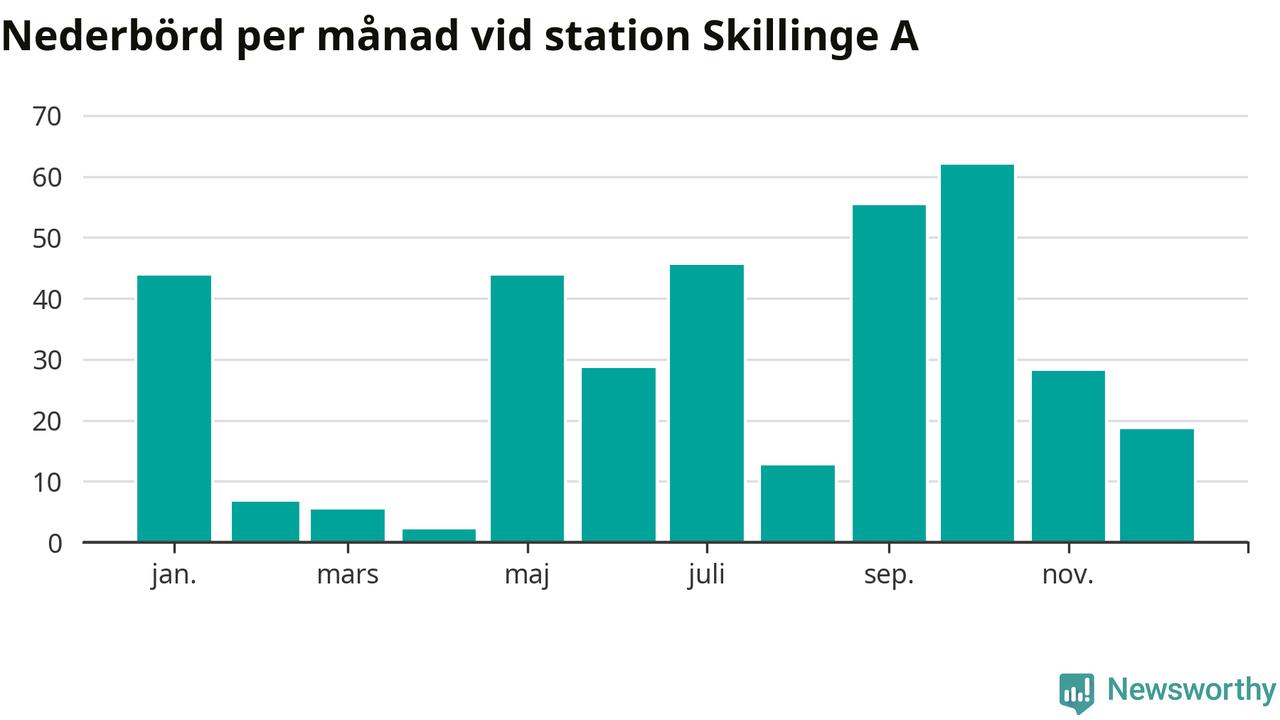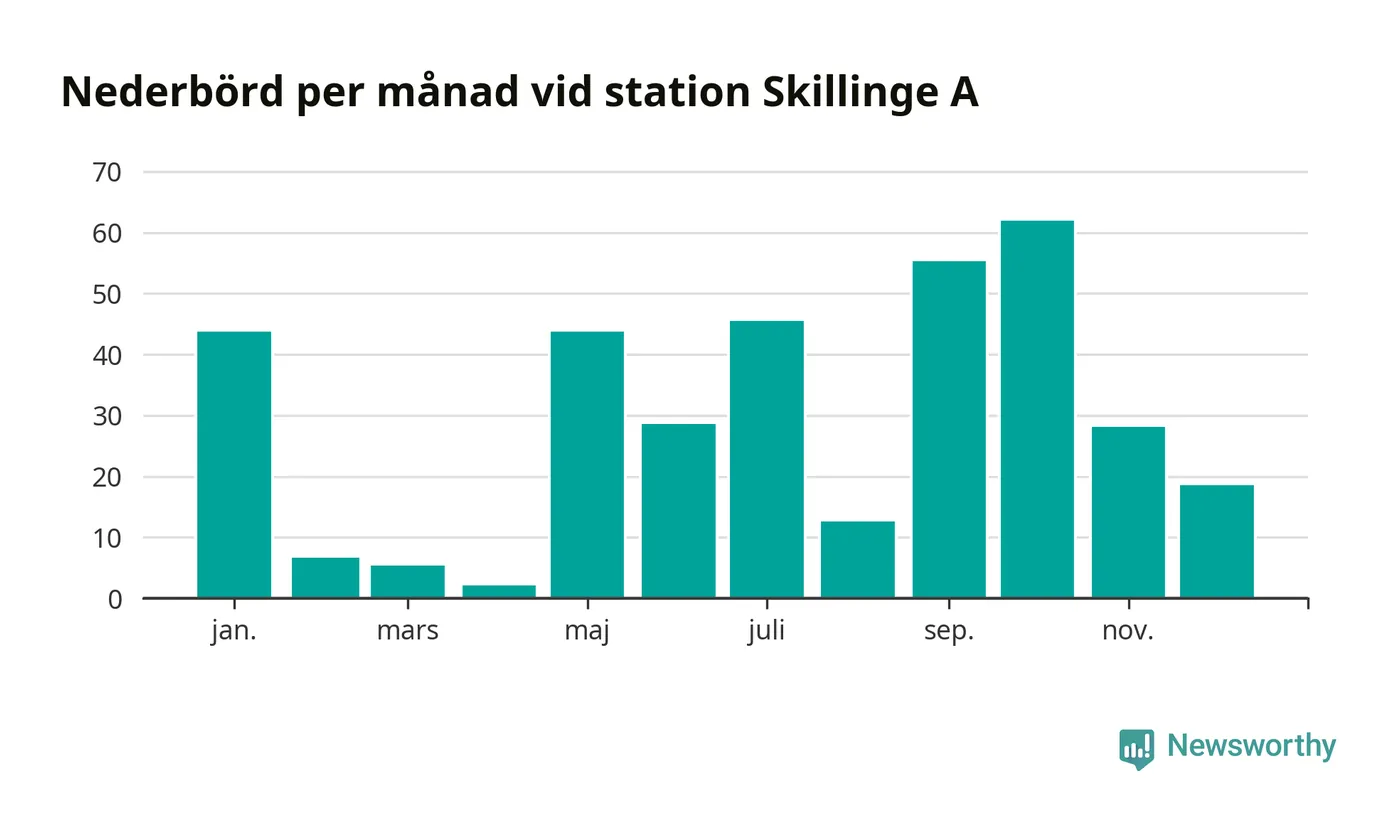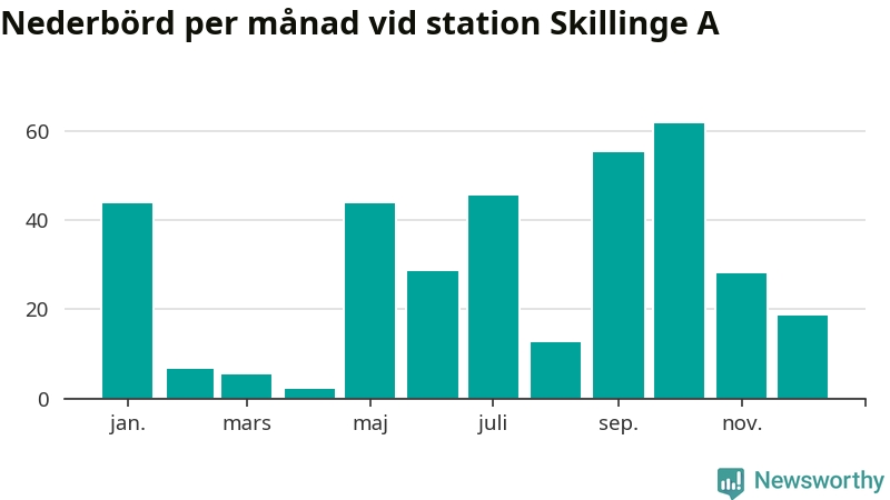 Nederbördsmässigt var 2025 ett torrare år än vanligt vid Skillinge A. Totalt föll 352 millimeter nederbörd vid stationen, att jämföra med de senaste tre decenniernas genomsnitt på 565 millimeter. Månaden med mest nederbörd var oktober, med 62 millimeter.