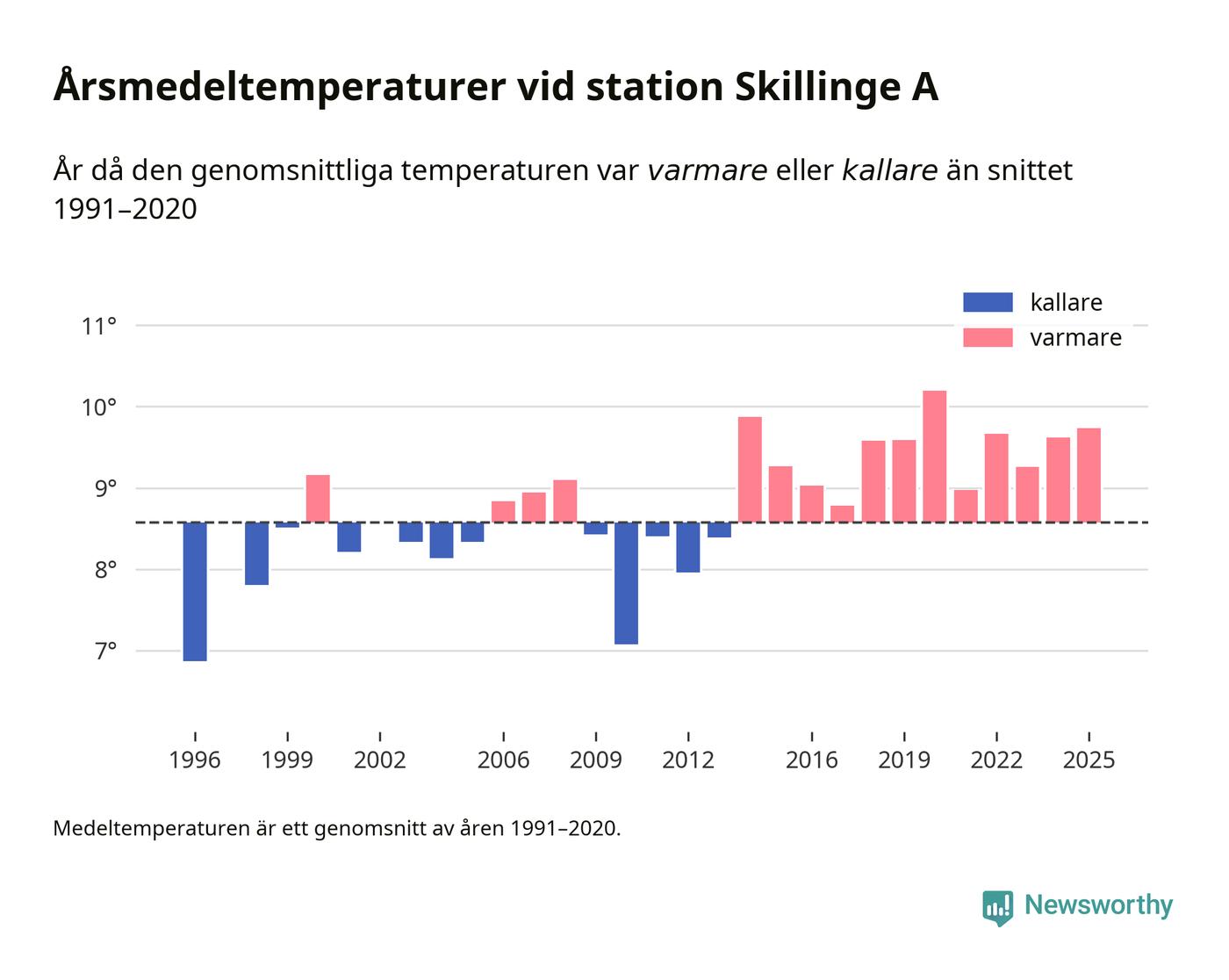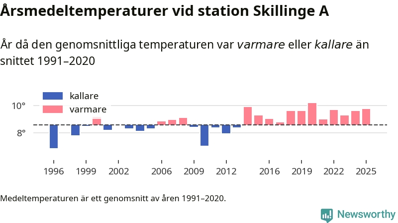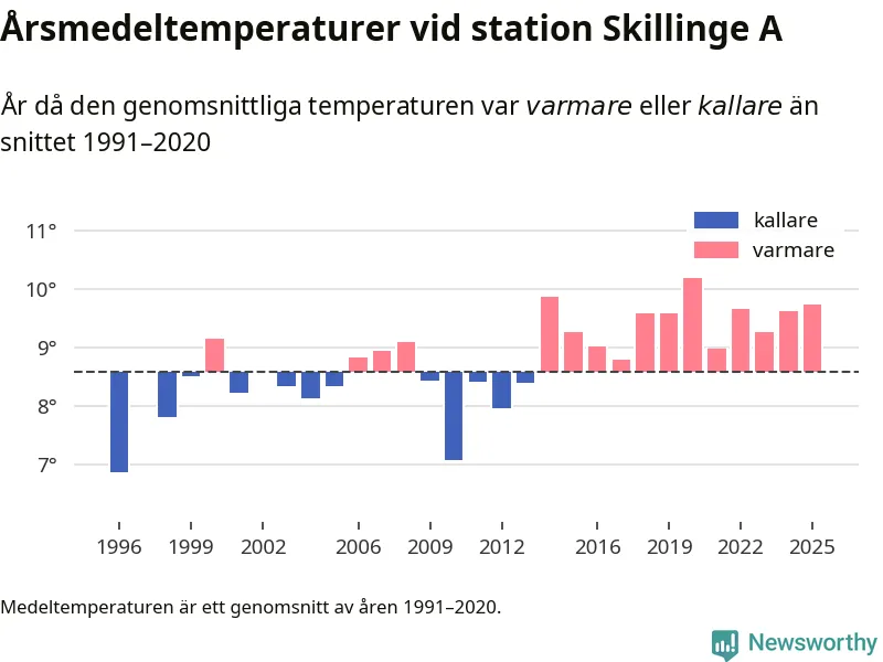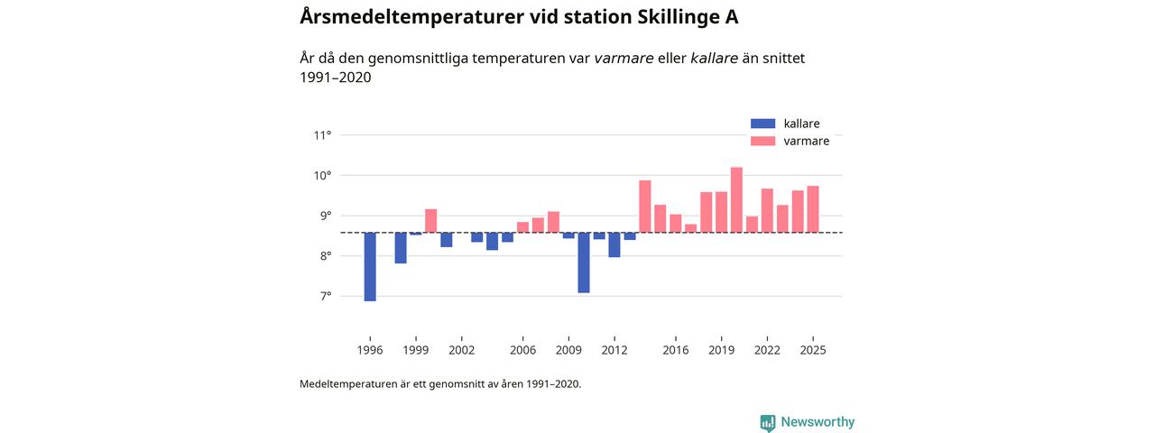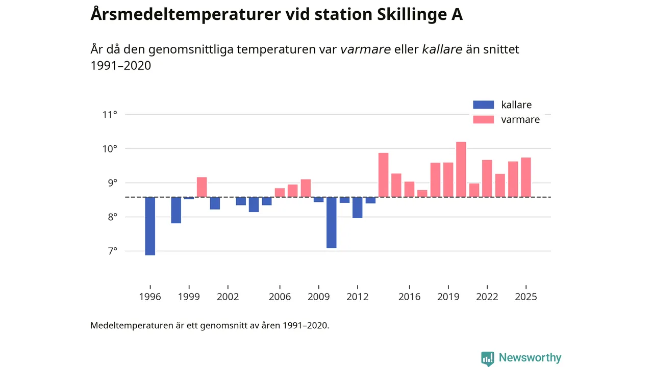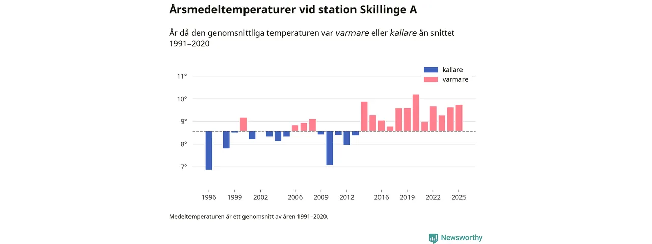 Årsmedeltemperaturen vid Skillinge A sju kilometer söder om centrala Simrishamn – den enda aktiva, SMHI-anslutna stationen som mäter medeltemperaturer i Simrishamns kommun – var under 2025 9,7 grader, 1,2 grader högre än genomsnittet de senaste decennierna. Det är den tredje högsta noteringen sedan 1996, visar Newsworthys beräkningar baserade på delvis preliminär observationsdata från SMHI.