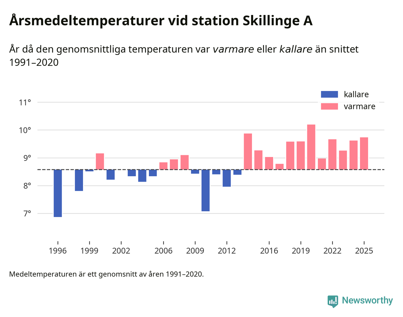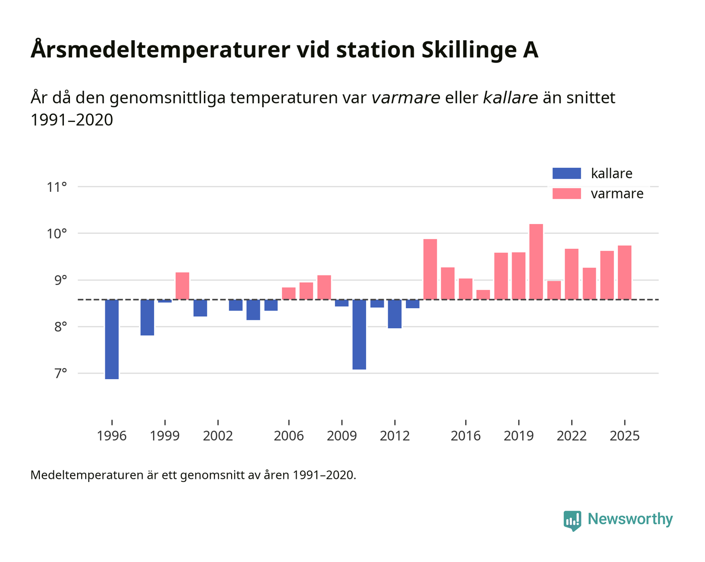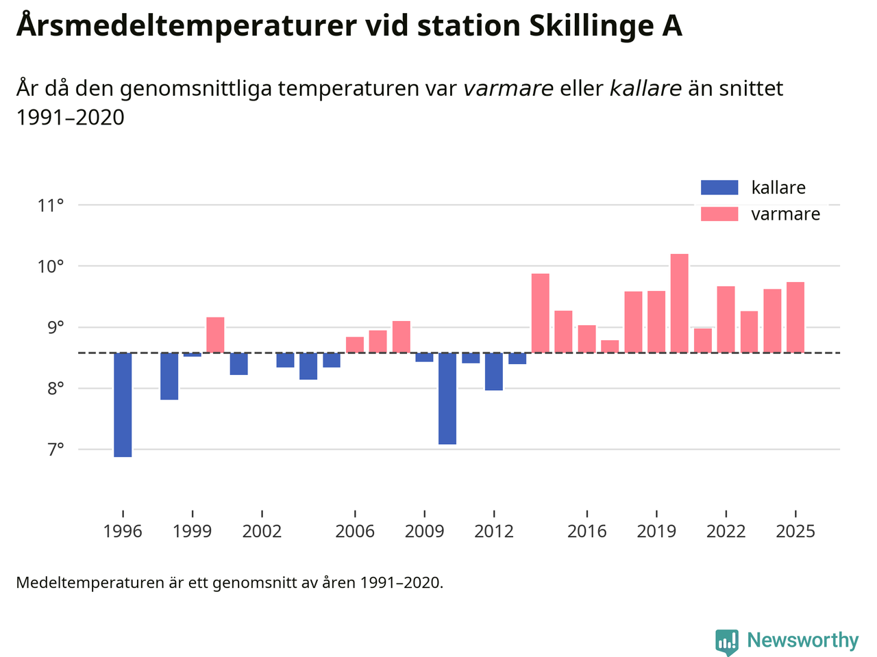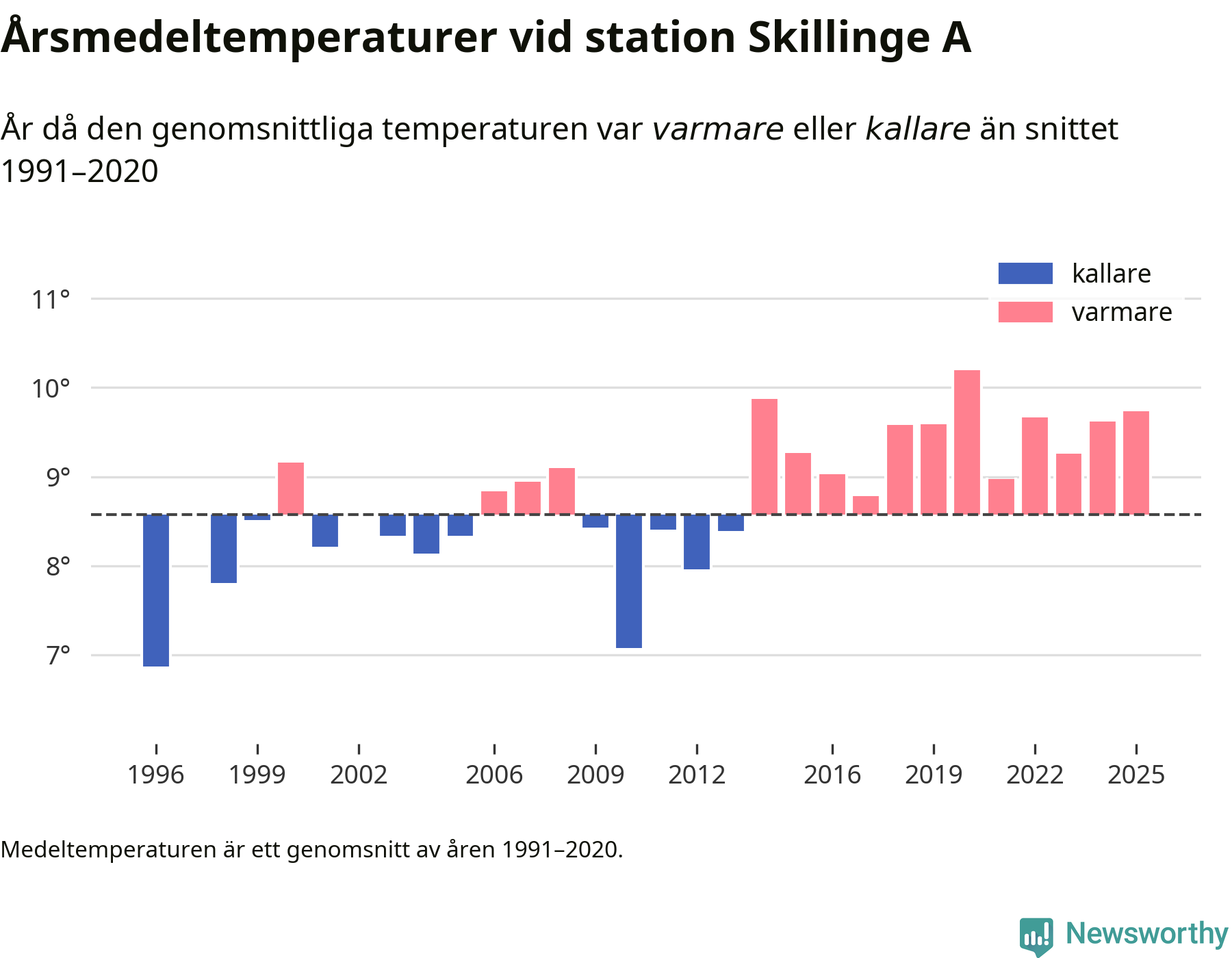 Årsmedeltemperaturen vid Skillinge A sju kilometer söder om centrala Simrishamn – den enda aktiva, SMHI-anslutna stationen som mäter medeltemperaturer i Simrishamns kommun – var under 2025 9,7 grader, 1,2 grader högre än genomsnittet de senaste decennierna. Det är den tredje högsta noteringen sedan 1996, visar Newsworthys beräkningar baserade på delvis preliminär observationsdata från SMHI.