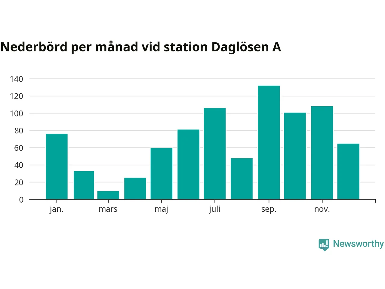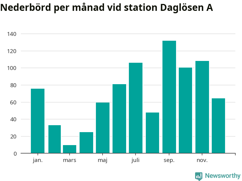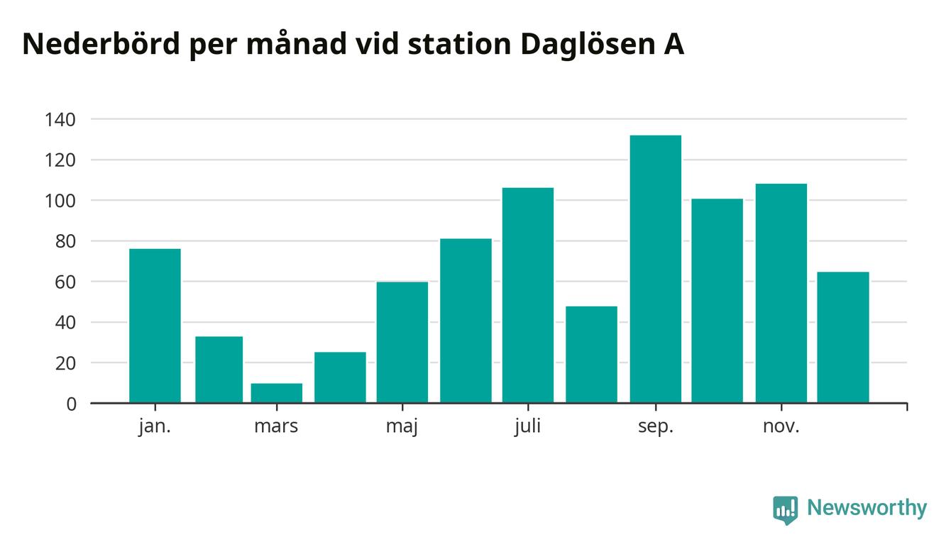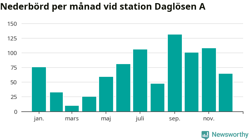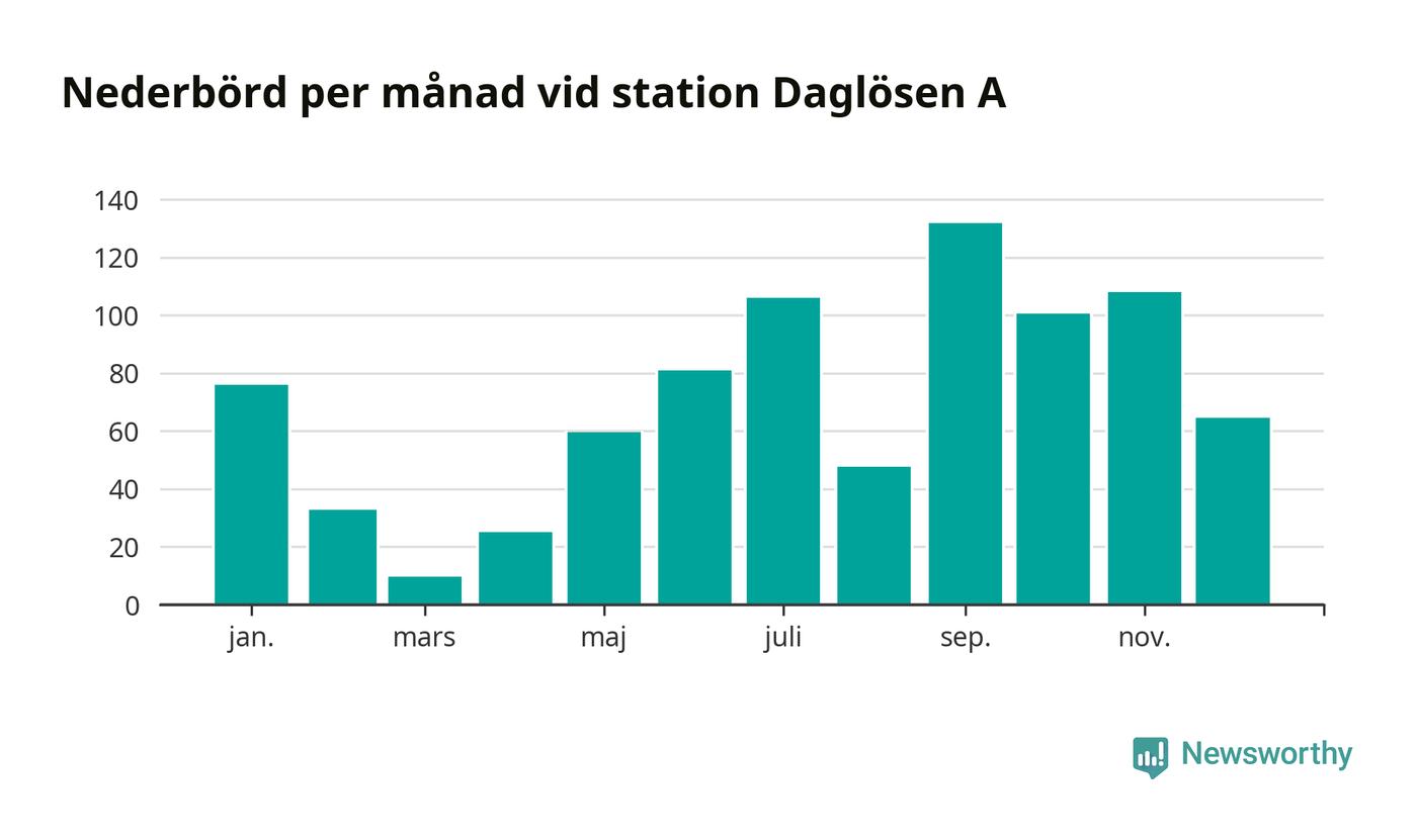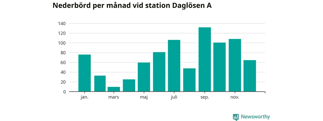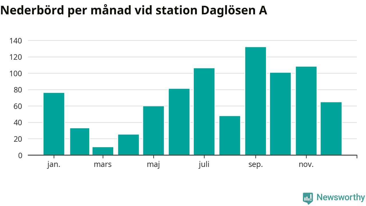 Nederbördsmässigt var 2025 ett blötare år än vanligt vid Daglösen A. Totalt föll 843 millimeter nederbörd vid stationen, att jämföra med de senaste tre decenniernas genomsnitt på 774 millimeter. Månaden med mest nederbörd var september, med 132 millimeter.
