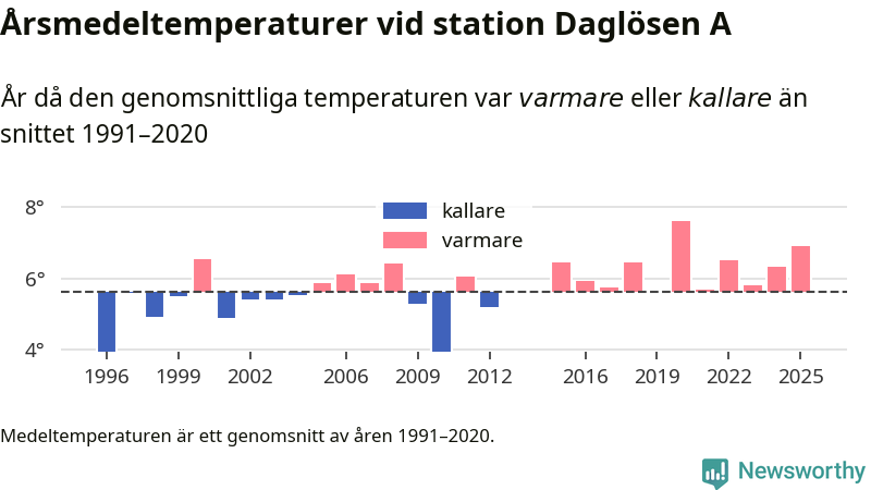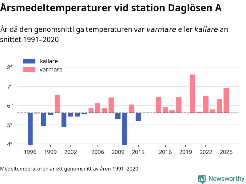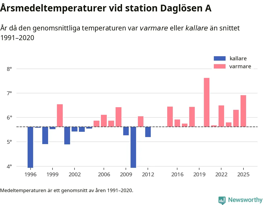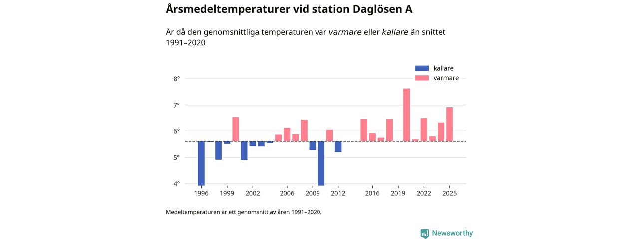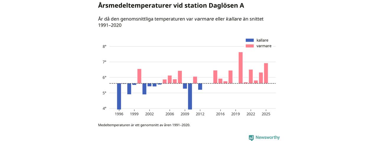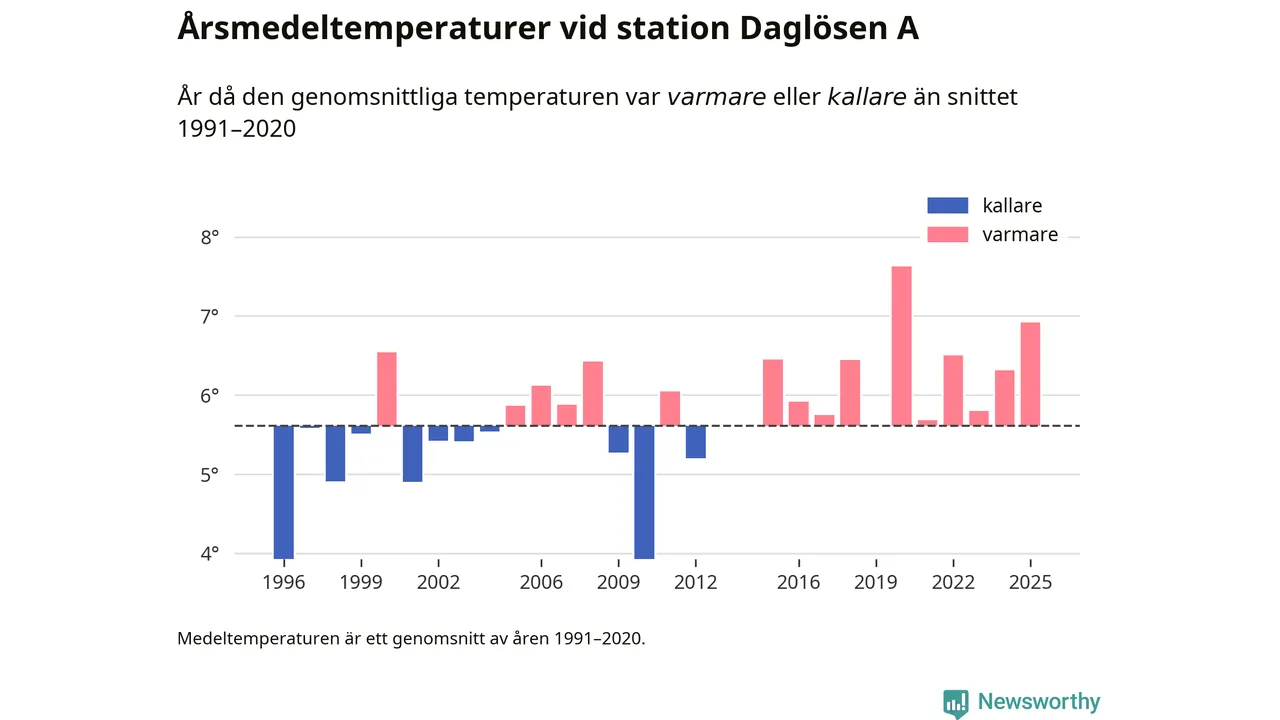 2025 blev ett av de tre varmaste åren som uppmätts på jorden, och även i Sverige var temperaturerna över de normala. Vid mätstationen Daglösen A var årsmedeltemperaturen den näst högsta som uppmätts sedan 1996, enligt preliminära uppgifter.