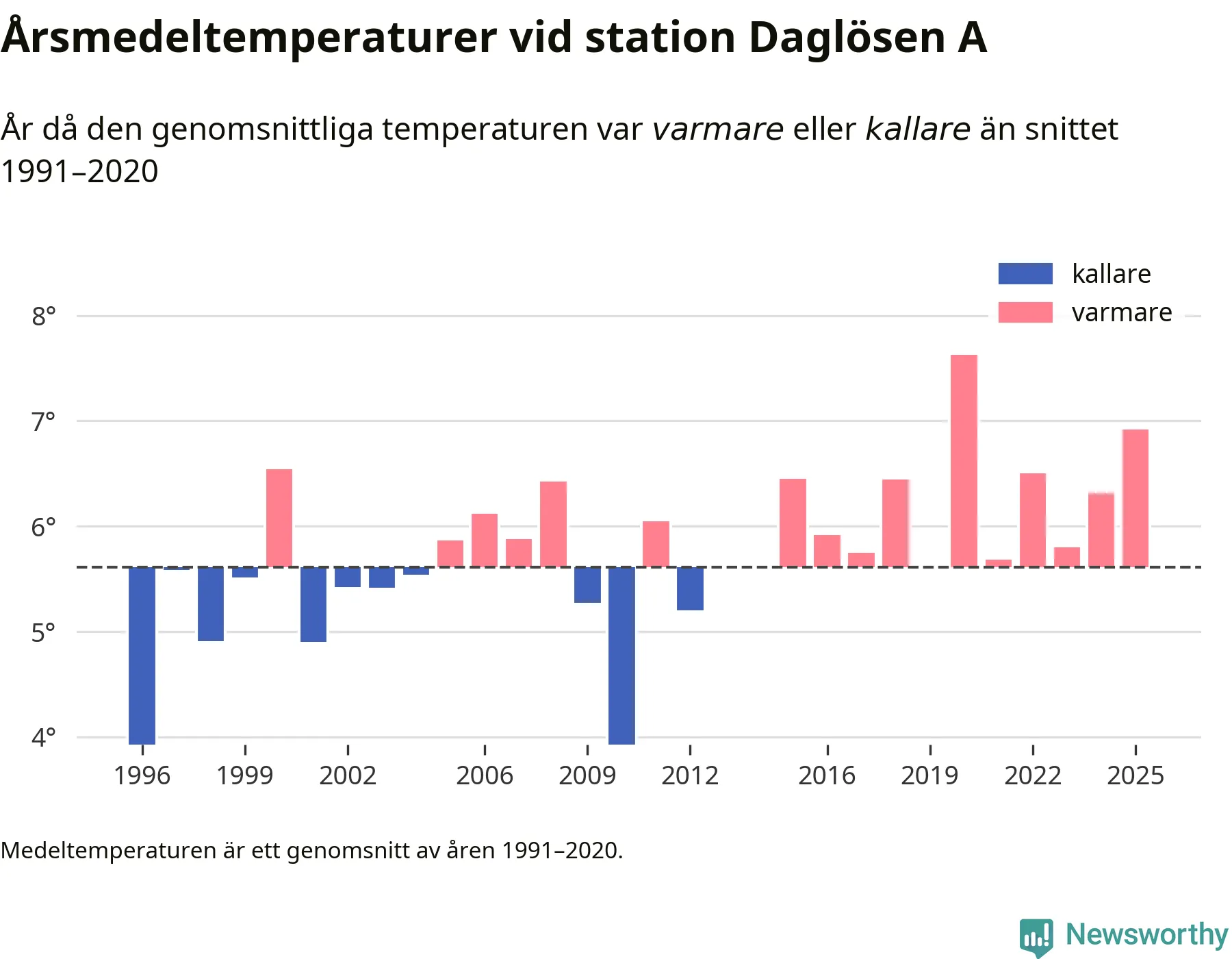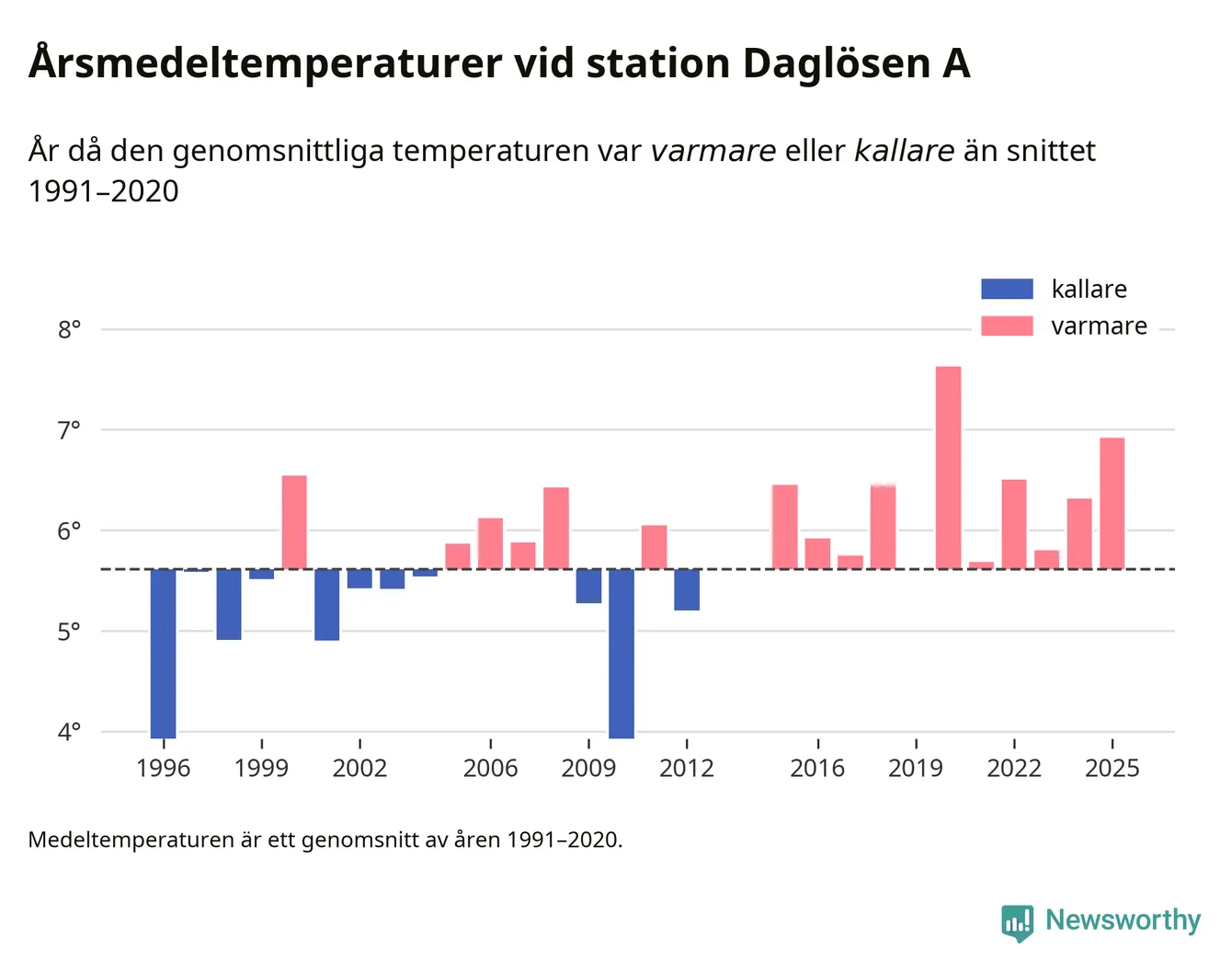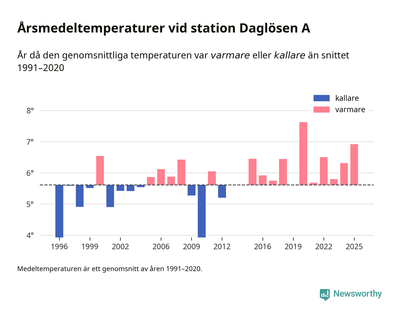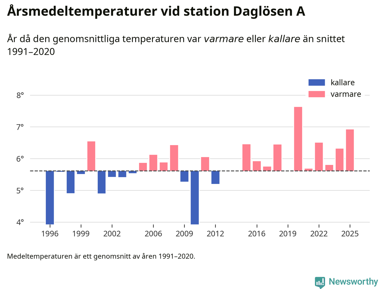 2025 blev ett av de tre varmaste åren som uppmätts på jorden, och även i Sverige var temperaturerna över de normala. Vid mätstationen Daglösen A var årsmedeltemperaturen den näst högsta som uppmätts sedan 1996, enligt preliminära uppgifter.