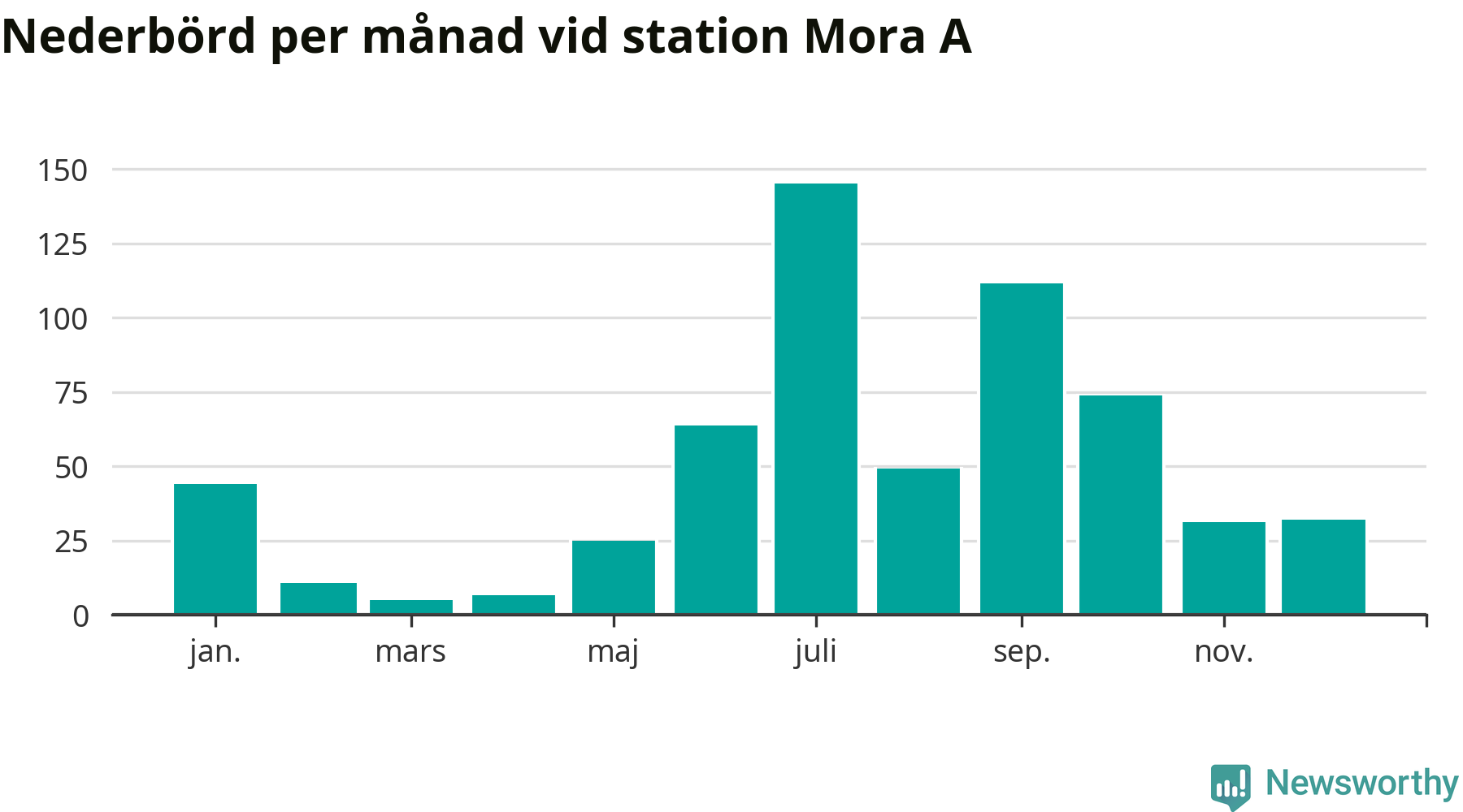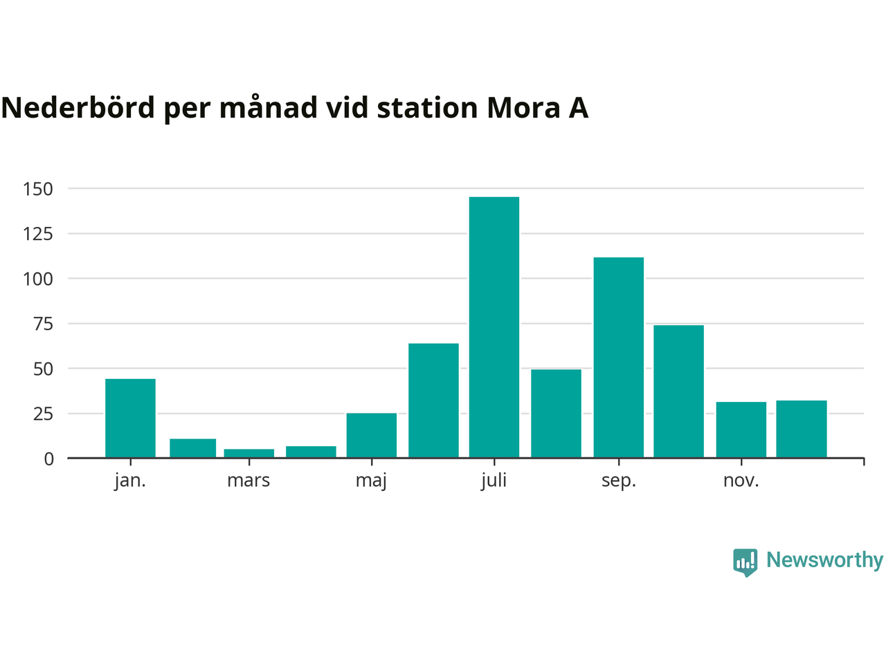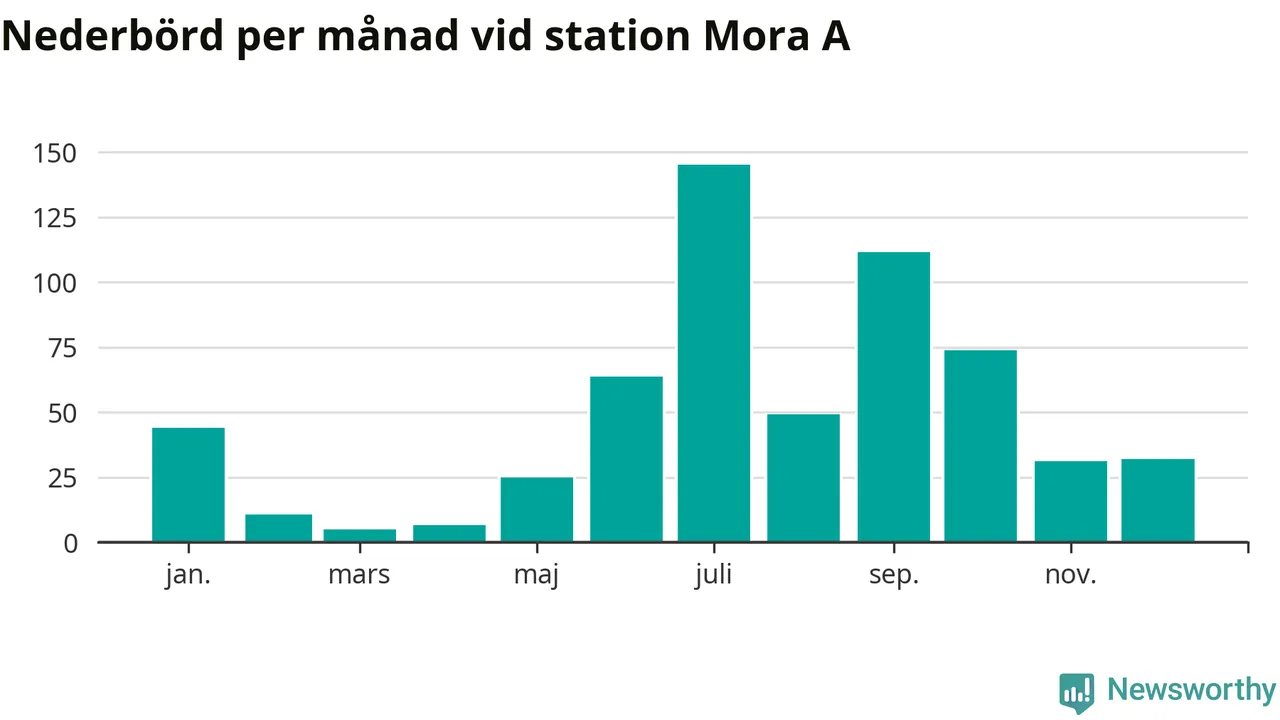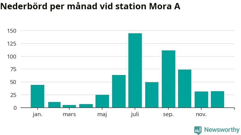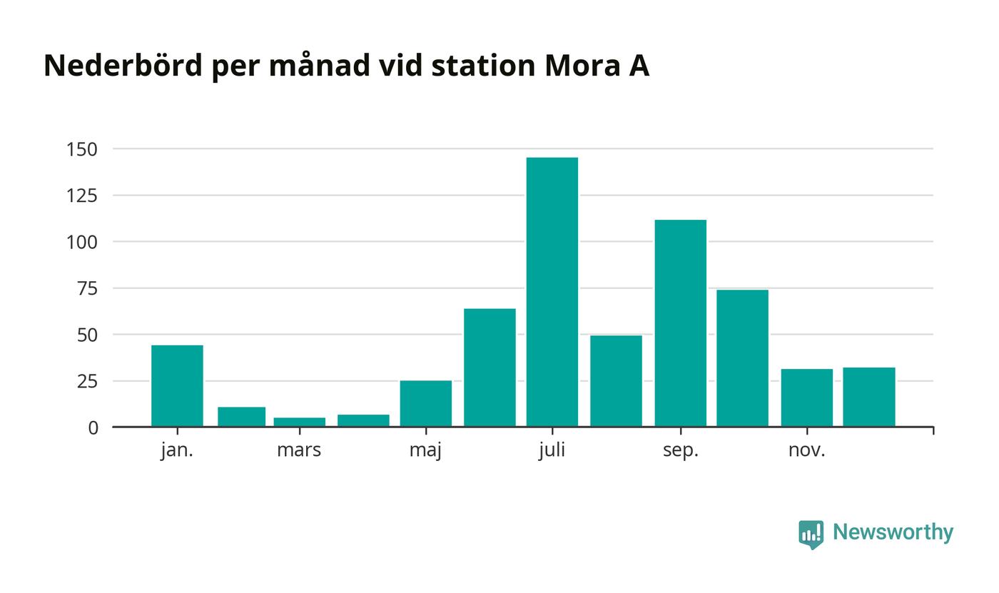 Nederbördsmässigt var 2025 ett ganska normalt år vid Mora A. Totalt föll 597 millimeter nederbörd vid stationen, att jämföra med de senaste tre decenniernas genomsnitt på 601 millimeter. Månaden med mest nederbörd var juli, med 145 millimeter.