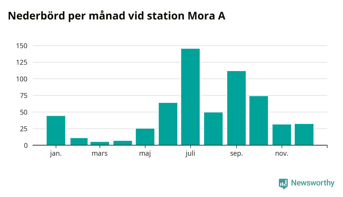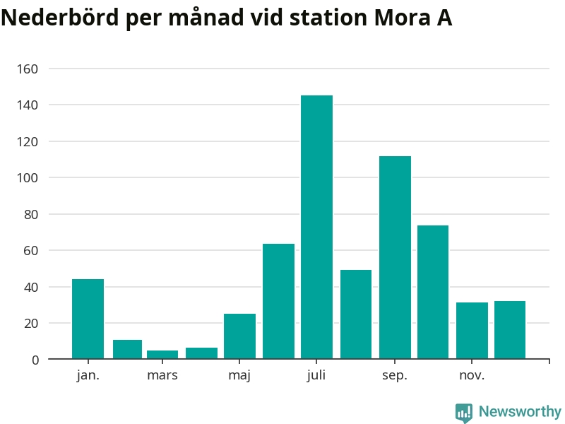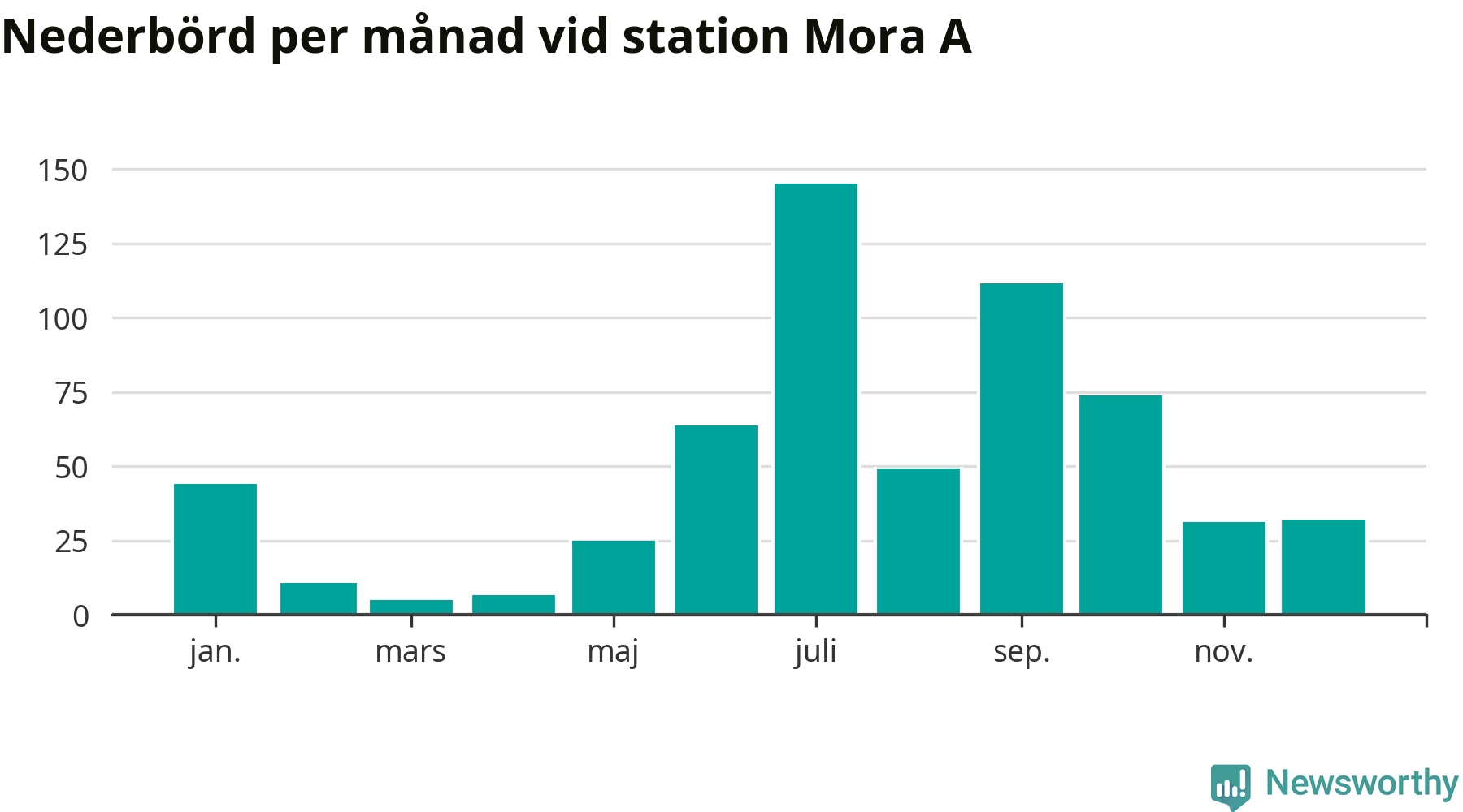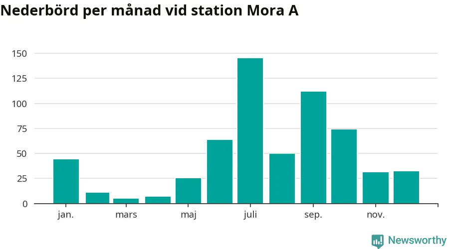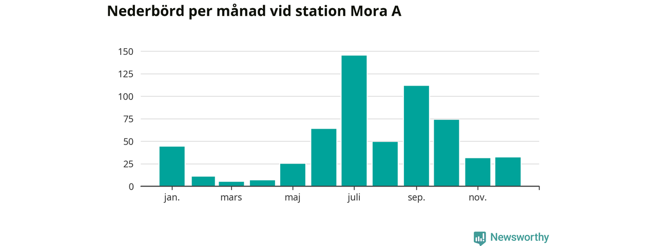 Nederbördsmässigt var 2025 ett ganska normalt år vid Mora A. Totalt föll 597 millimeter nederbörd vid stationen, att jämföra med de senaste tre decenniernas genomsnitt på 601 millimeter. Månaden med mest nederbörd var juli, med 145 millimeter.