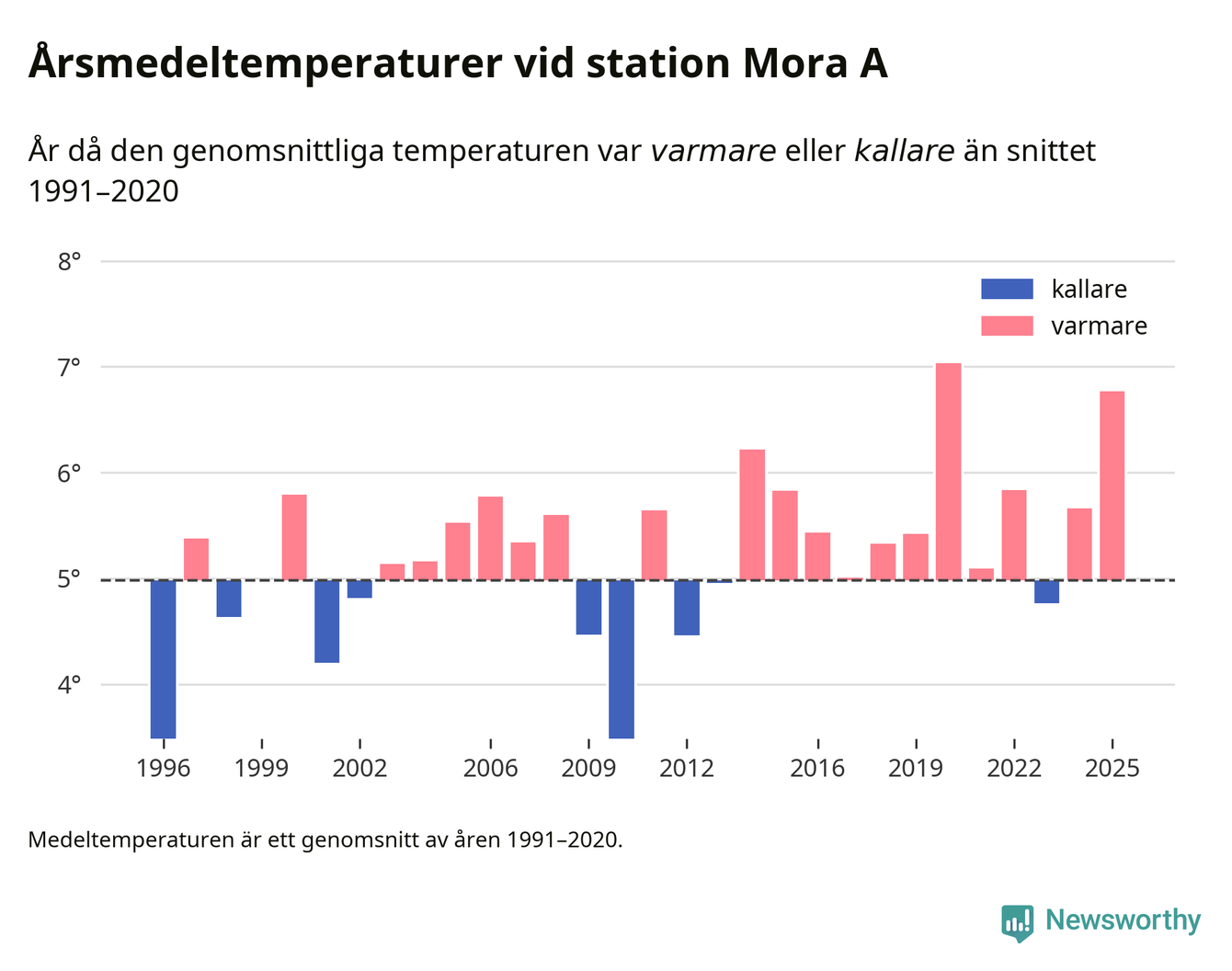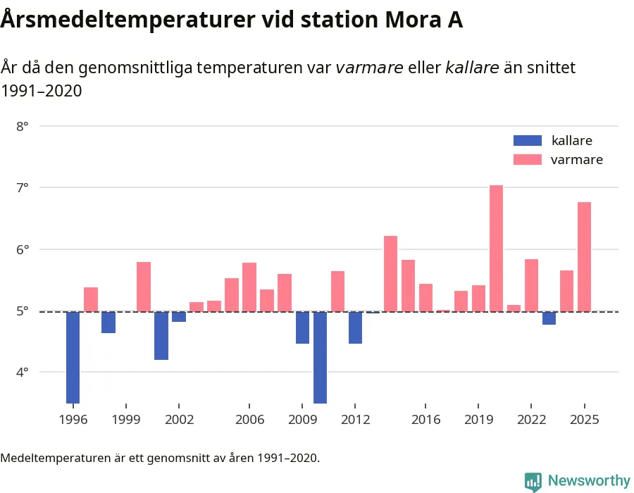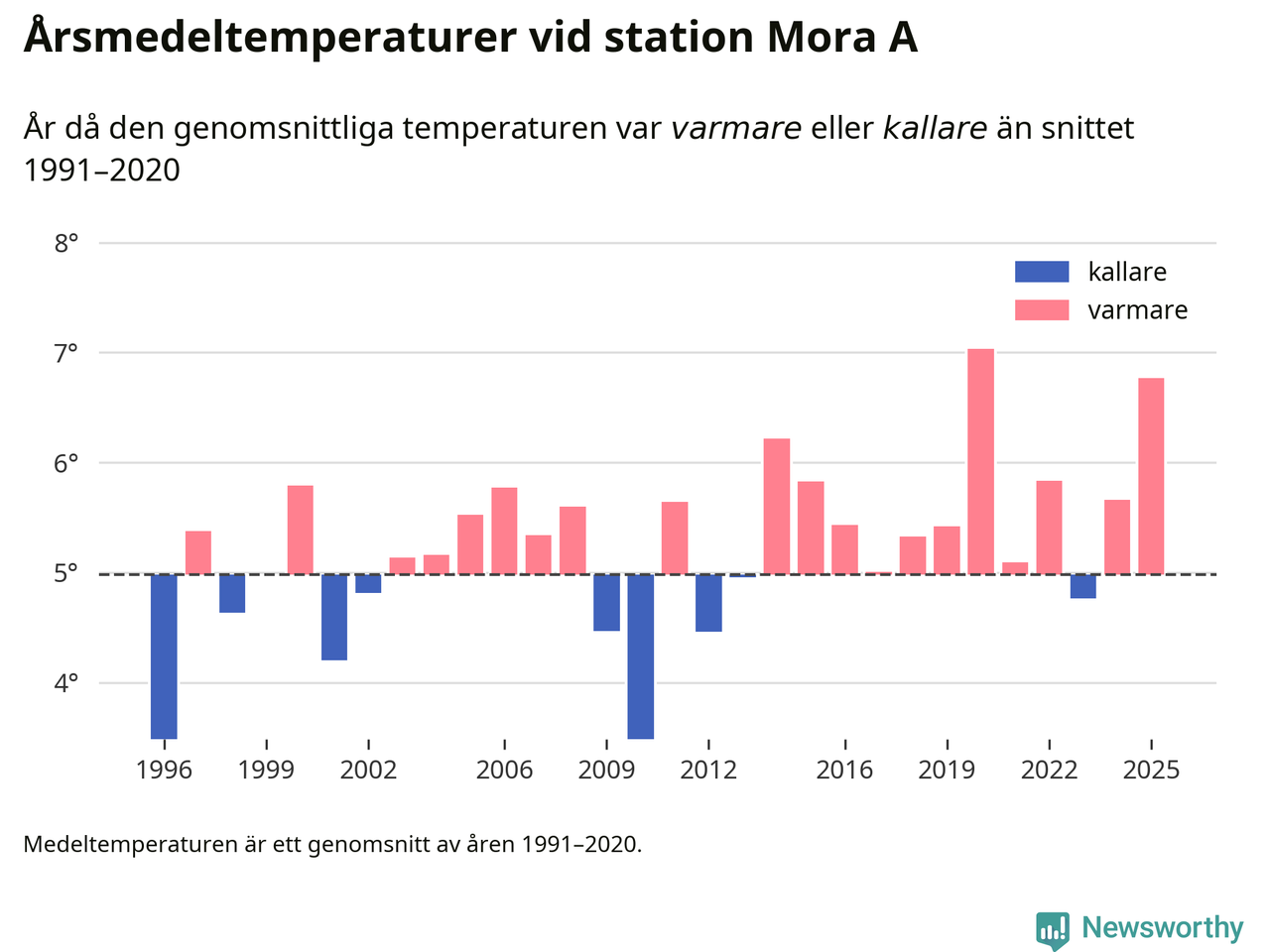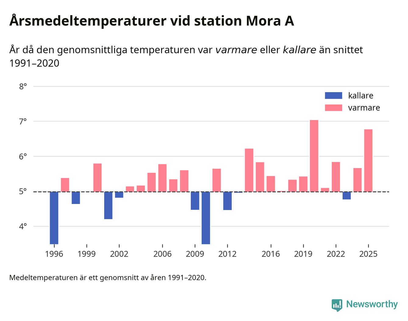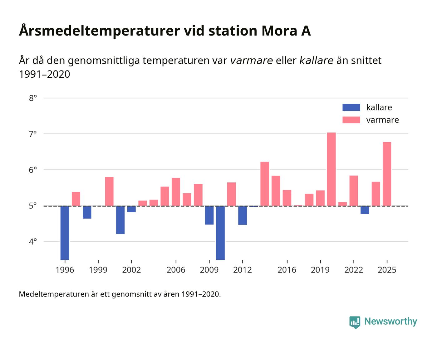 Årsmedeltemperaturen vid Mora A sex kilometer sydväst om centrala Mora1 – den enda aktiva, SMHI-anslutna stationen som mäter medeltemperaturer i Mora kommun – var under 2025 6,8 grader, 1,8 grader högre än genomsnittet de senaste decennierna. Det är den näst högsta noteringen sedan 1941, visar Newsworthys beräkningar baserade på delvis preliminär observationsdata från SMHI.