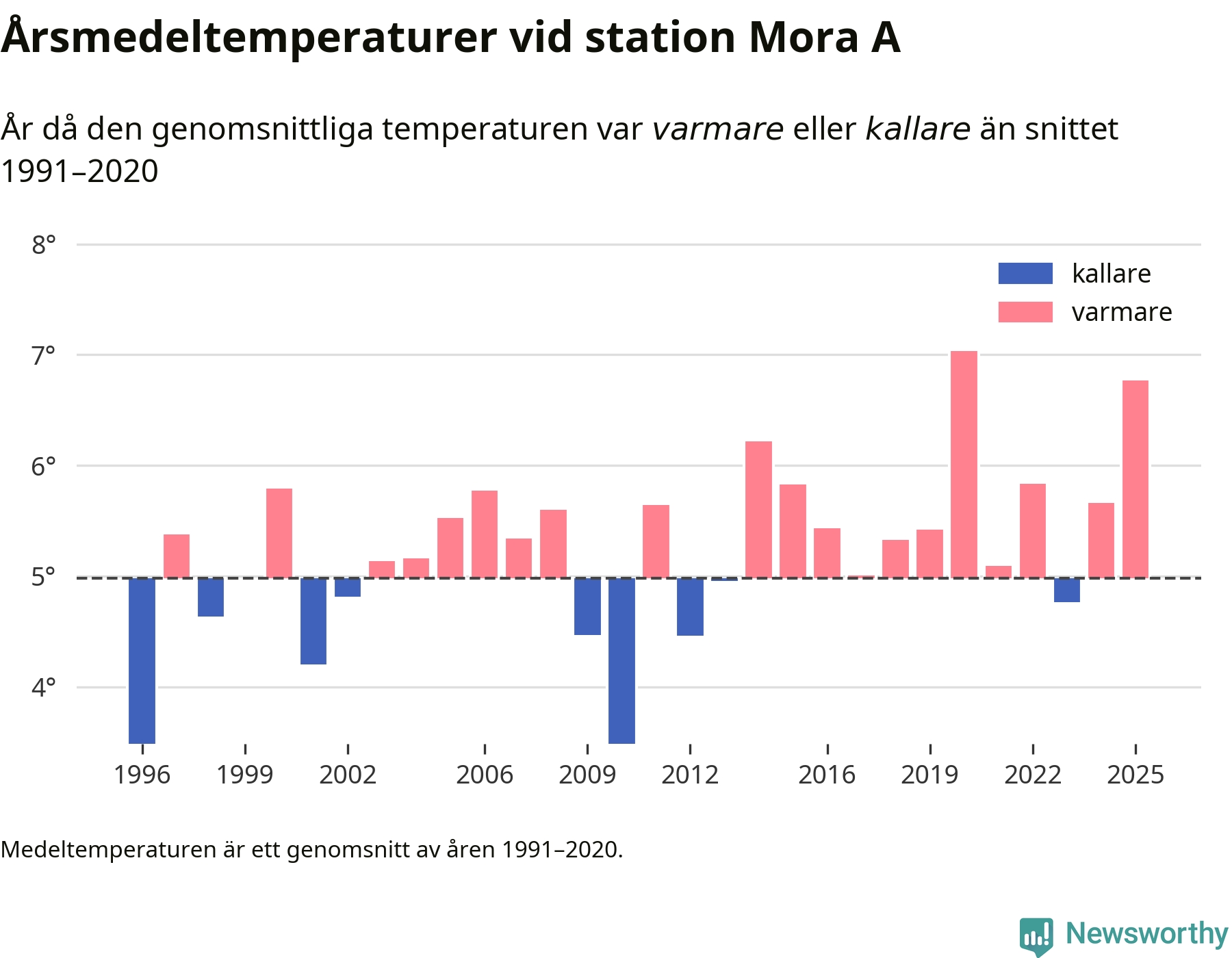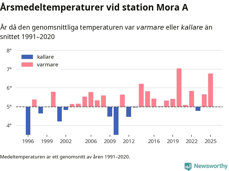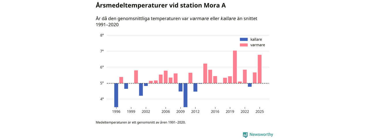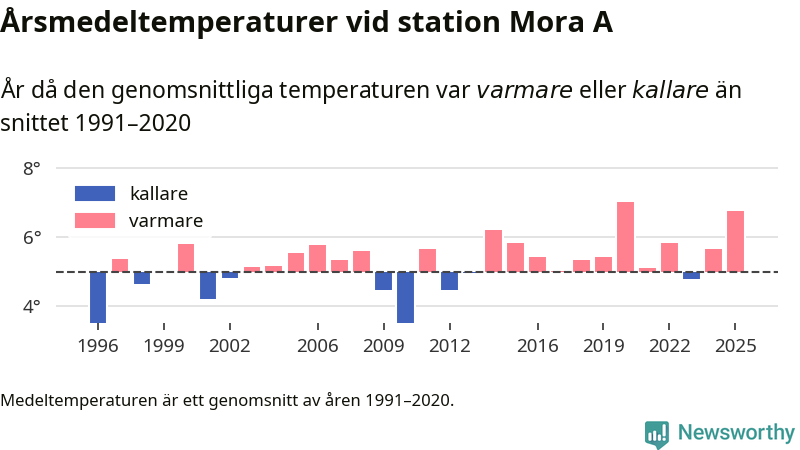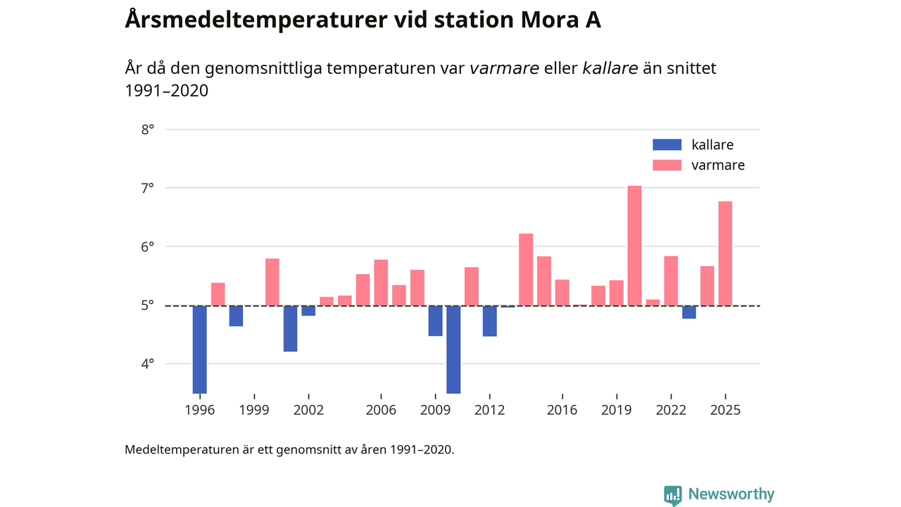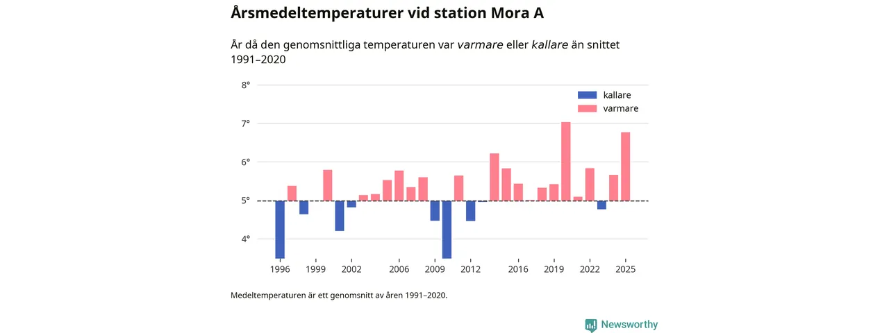 Årsmedeltemperaturen vid Mora A sex kilometer sydväst om centrala Mora1 – den enda aktiva, SMHI-anslutna stationen som mäter medeltemperaturer i Mora kommun – var under 2025 6,8 grader, 1,8 grader högre än genomsnittet de senaste decennierna. Det är den näst högsta noteringen sedan 1941, visar Newsworthys beräkningar baserade på delvis preliminär observationsdata från SMHI.