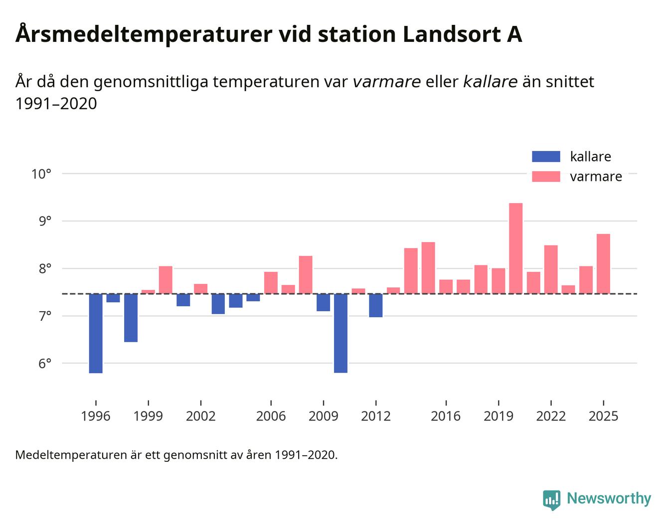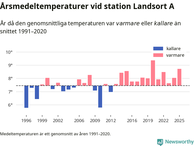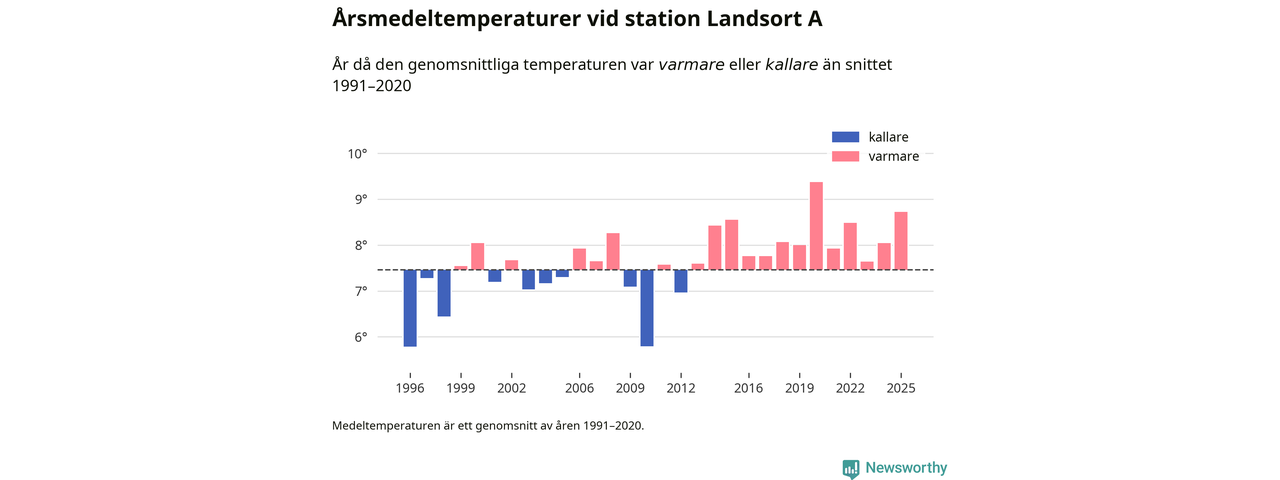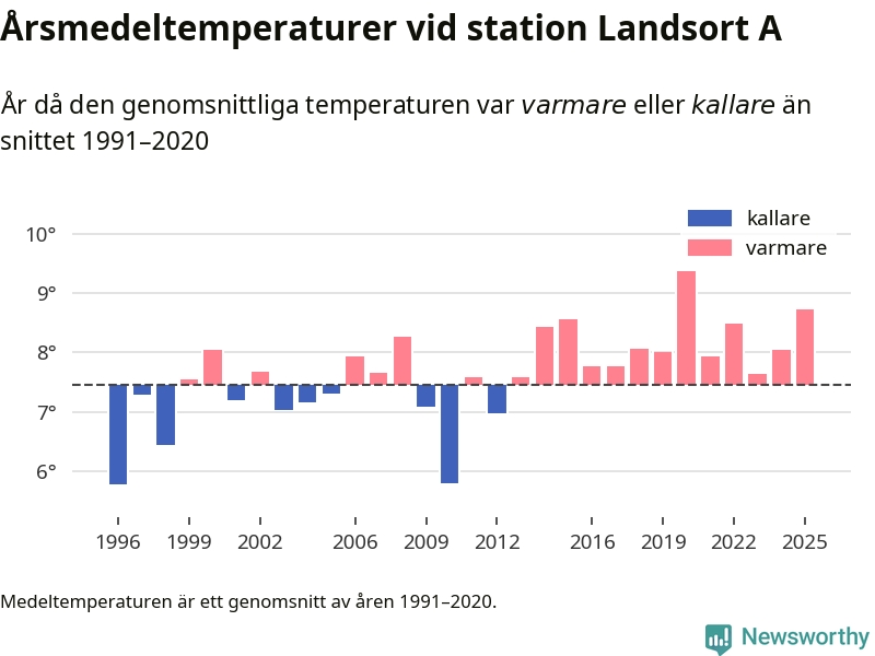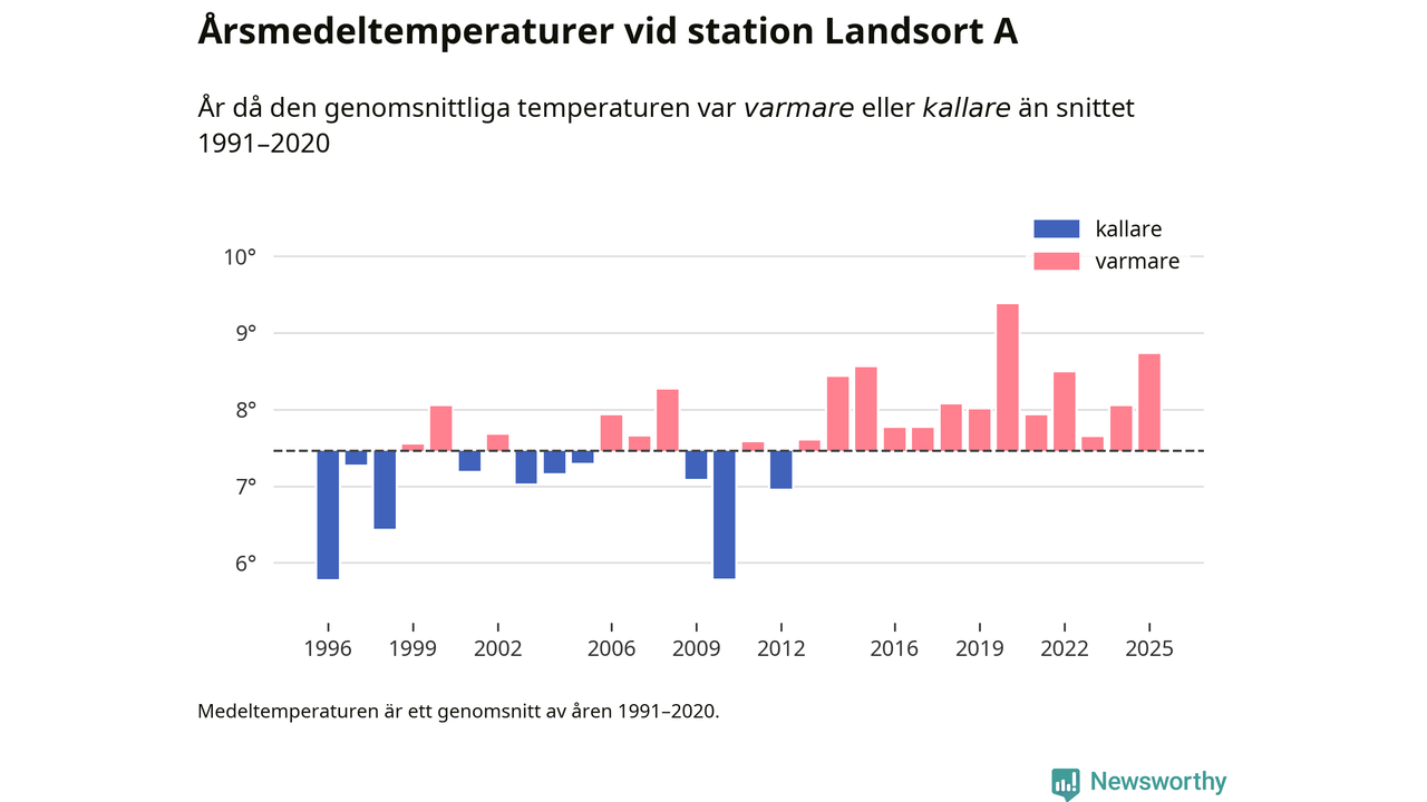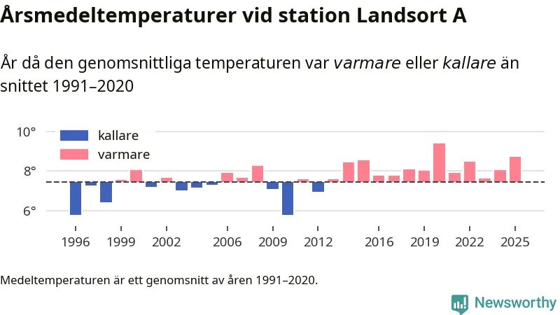 Årsmedeltemperaturen vid Landsort A 19 kilometer söder om centrala Nynäshamn1 var under 2025 8,7 grader, 1,3 grader högre än genomsnittet de senaste decennierna. Det är den näst högsta noteringen sedan 1996, visar Newsworthys beräkningar baserade på delvis preliminär observationsdata från SMHI.