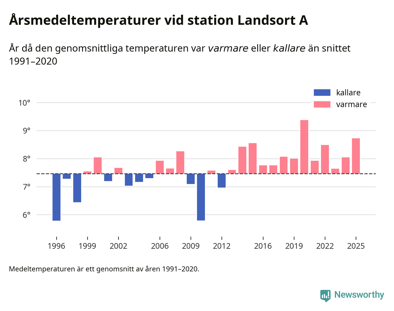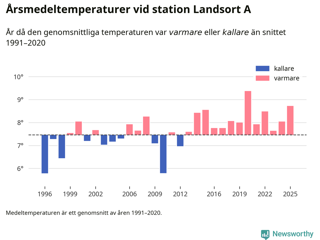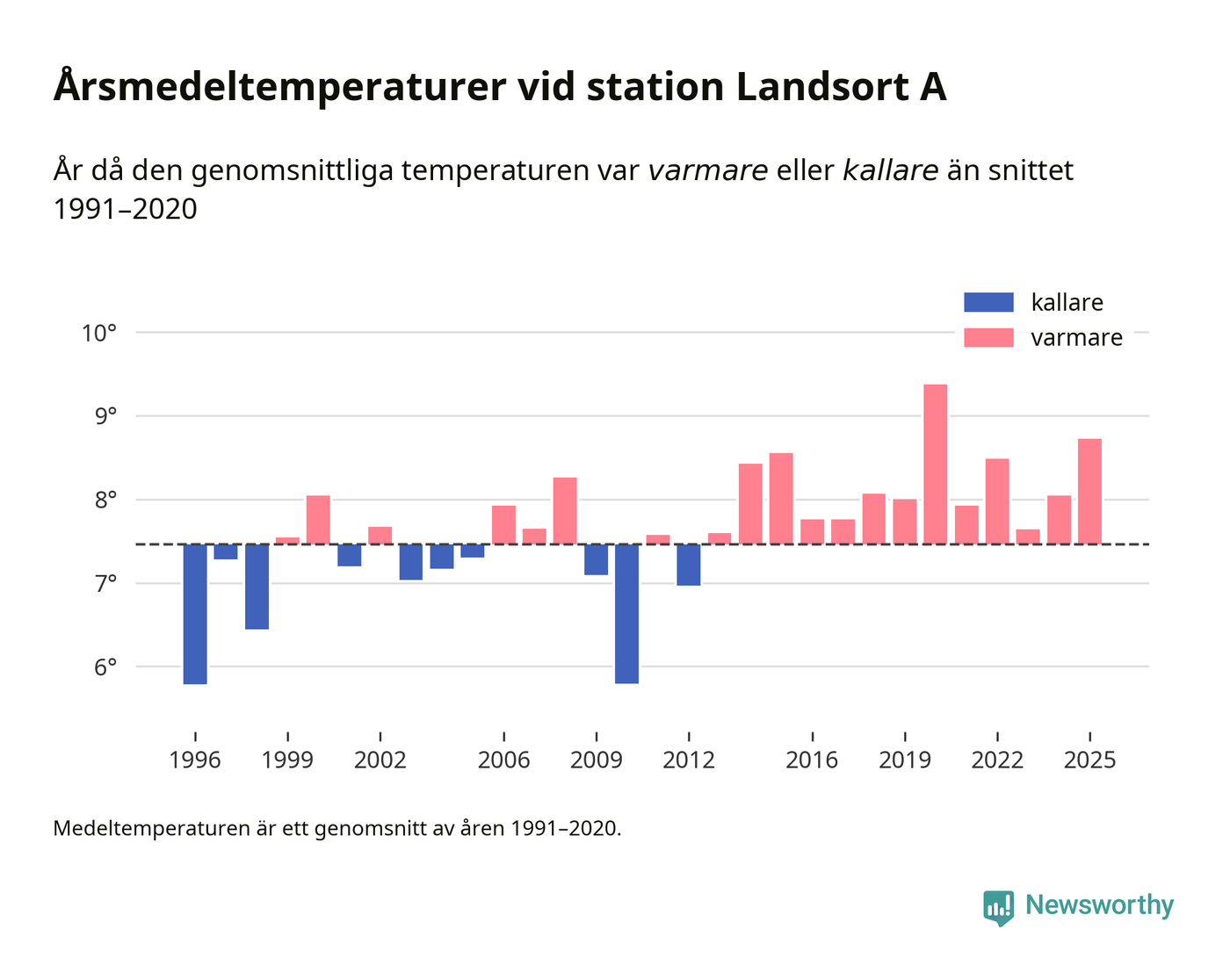 Årsmedeltemperaturen vid Landsort A 19 kilometer söder om centrala Nynäshamn1 var under 2025 8,7 grader, 1,3 grader högre än genomsnittet de senaste decennierna. Det är den näst högsta noteringen sedan 1996, visar Newsworthys beräkningar baserade på delvis preliminär observationsdata från SMHI.