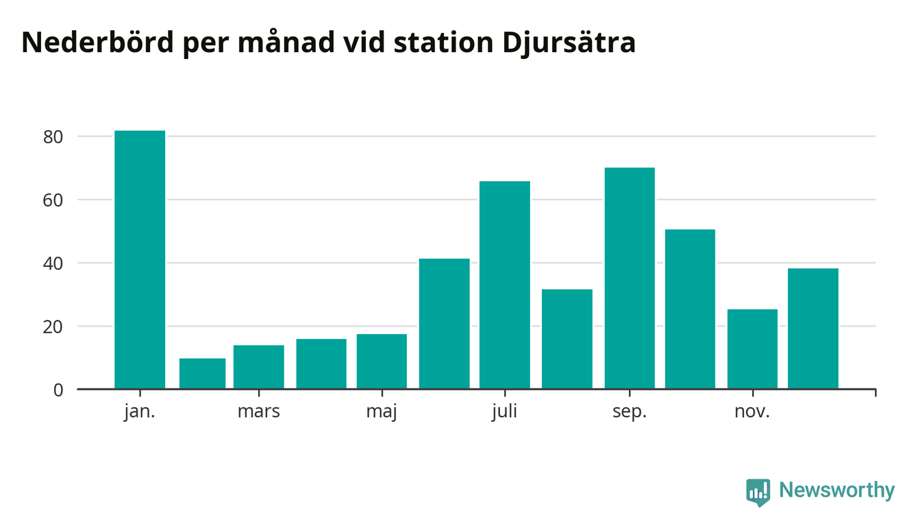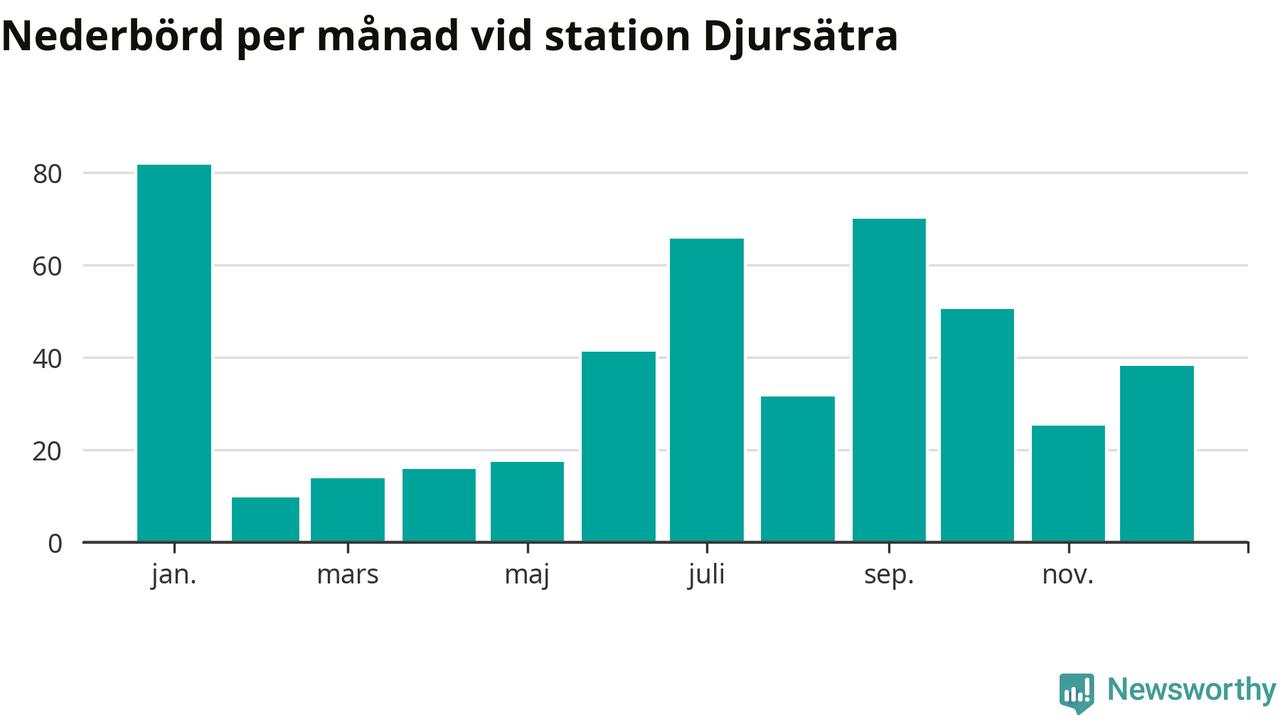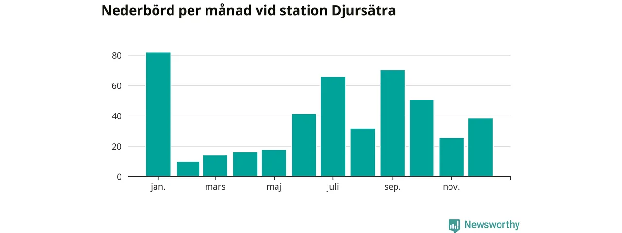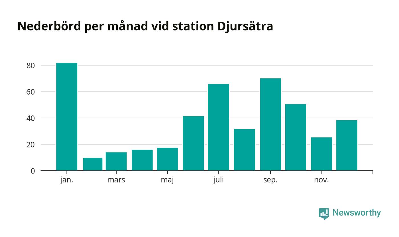 Nederbördsmässigt var 2025 ett torrare år än vanligt , åtminstone vid Djursätra, 18 kilometer norr om centrala Tidaholm. Totalt föll 461 millimeter nederbörd vid stationen, att jämföra med de senaste tre decenniernas genomsnitt på 622 millimeter. Månaden med mest nederbörd var januari, med 82 millimeter.