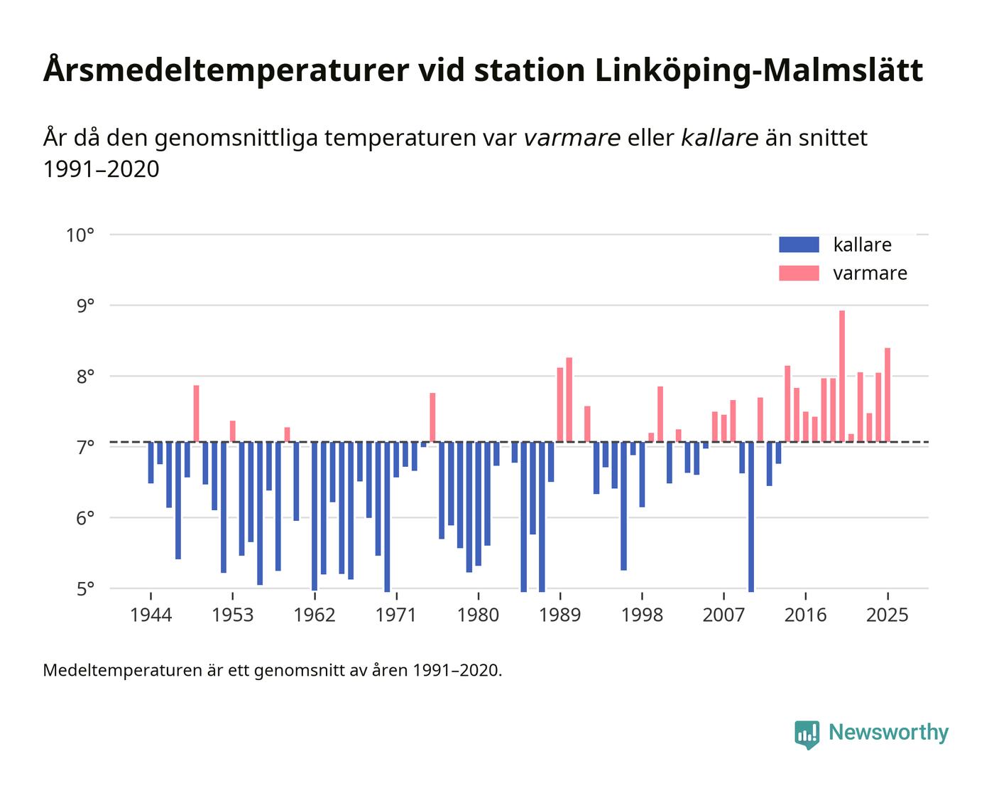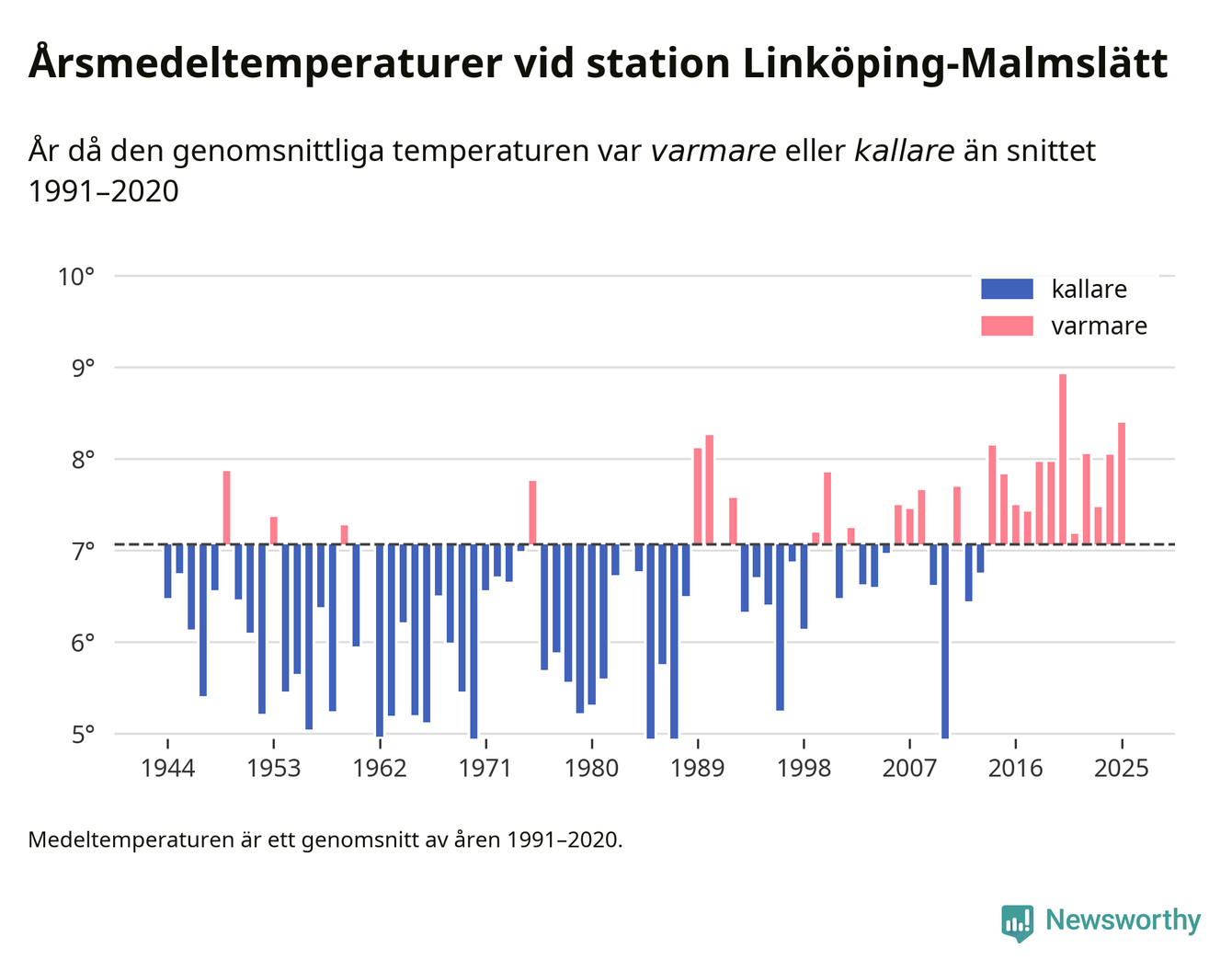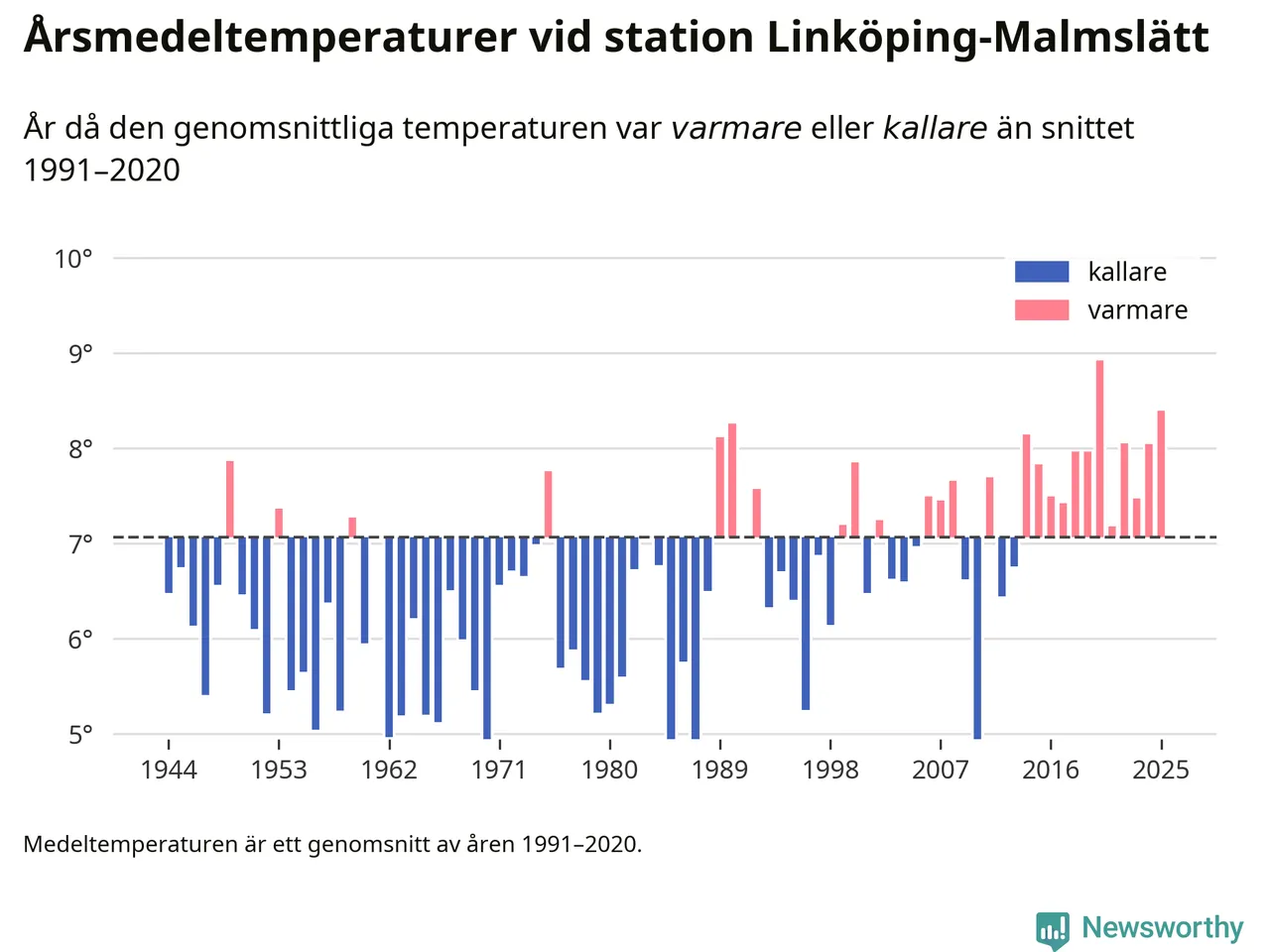 Årsmedeltemperaturen vid Linköping-Malmslätt sex kilometer väster om centrala Linköping – den enda aktiva, SMHI-anslutna stationen som mäter medeltemperaturer i Linköpings kommun – var under 2025 8,4 grader, 1,3 grader högre än genomsnittet de senaste decennierna. Det är den näst högsta noteringen sedan 1944, visar Newsworthys beräkningar baserade på delvis preliminär observationsdata från SMHI.