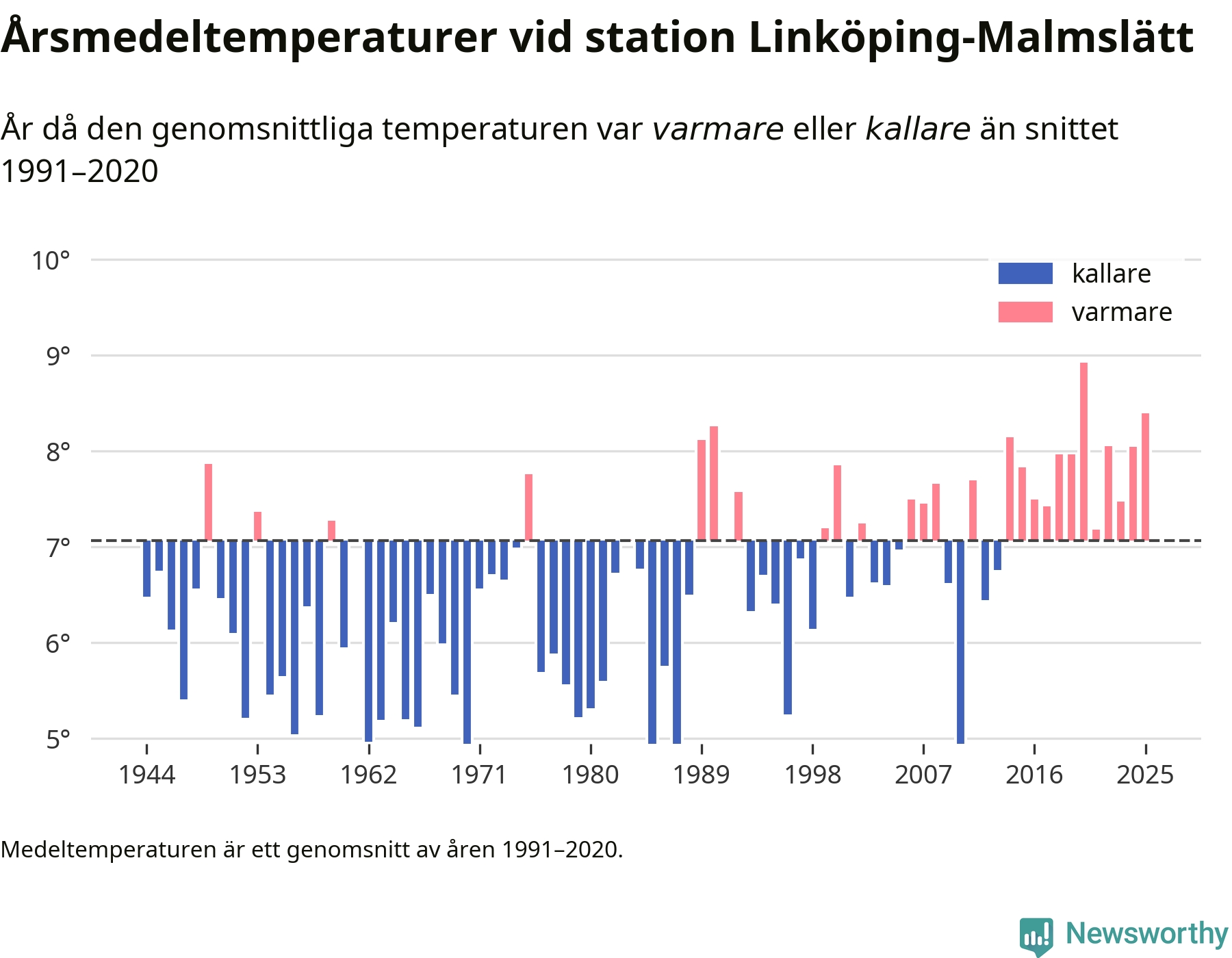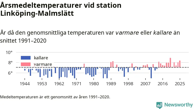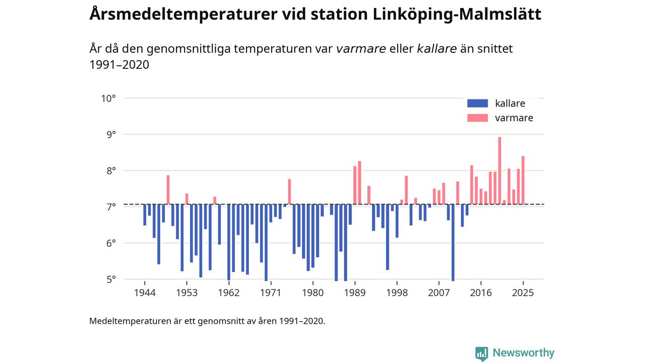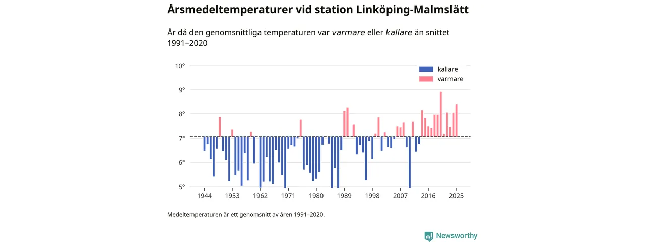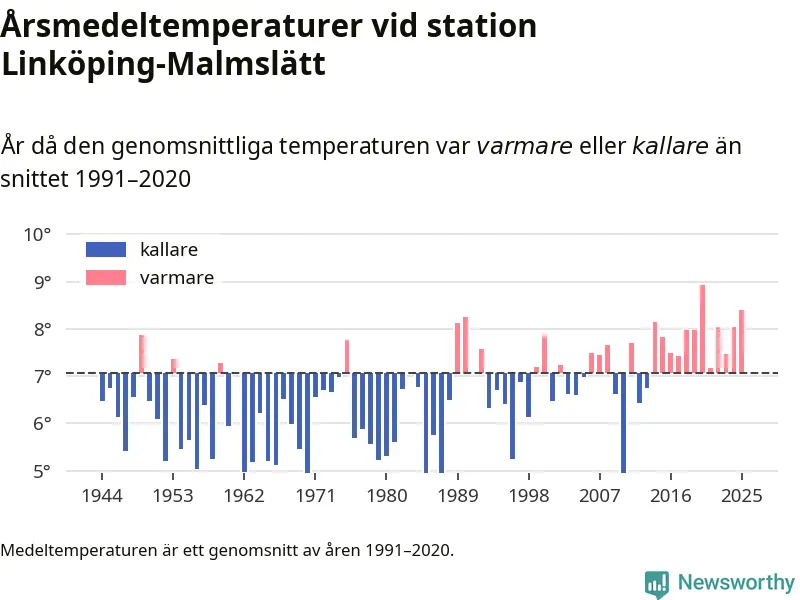 Årsmedeltemperaturen vid Linköping-Malmslätt sex kilometer väster om centrala Linköping – den enda aktiva, SMHI-anslutna stationen som mäter medeltemperaturer i Linköpings kommun – var under 2025 8,4 grader, 1,3 grader högre än genomsnittet de senaste decennierna. Det är den näst högsta noteringen sedan 1944, visar Newsworthys beräkningar baserade på delvis preliminär observationsdata från SMHI.