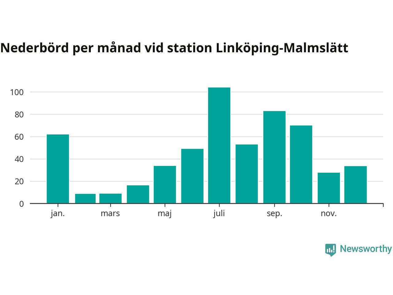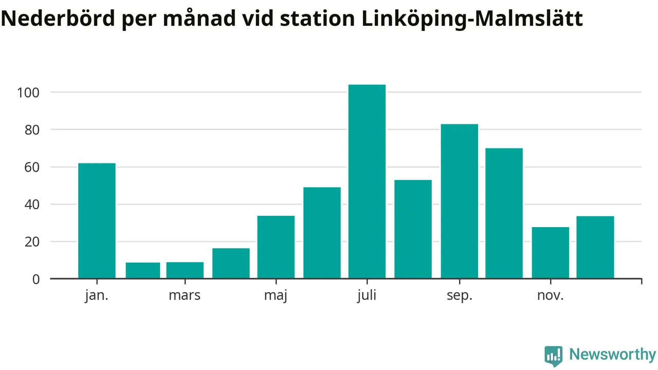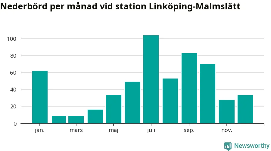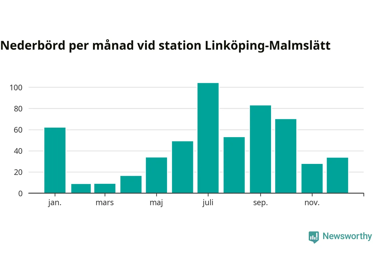 Nederbördsmässigt var 2025 ett ganska normalt år vid Linköping-Malmslätt. Totalt föll 549 millimeter nederbörd vid stationen, att jämföra med de senaste tre decenniernas genomsnitt på 565 millimeter. Månaden med mest nederbörd var juli, med 104 millimeter.