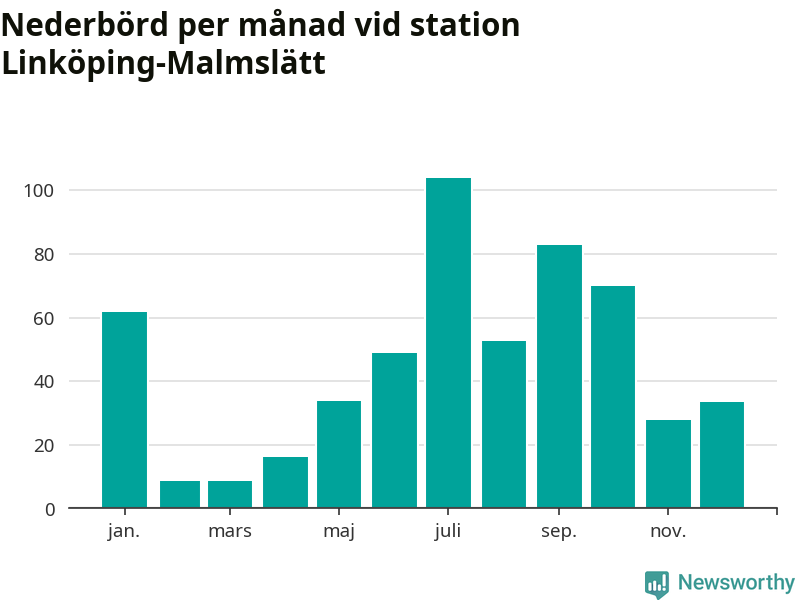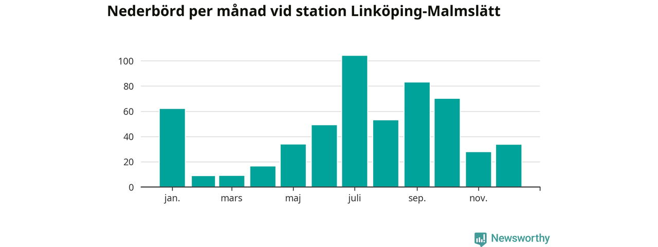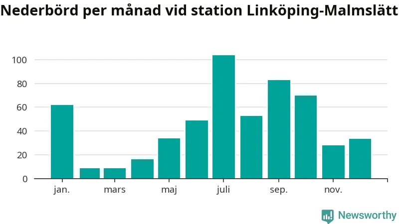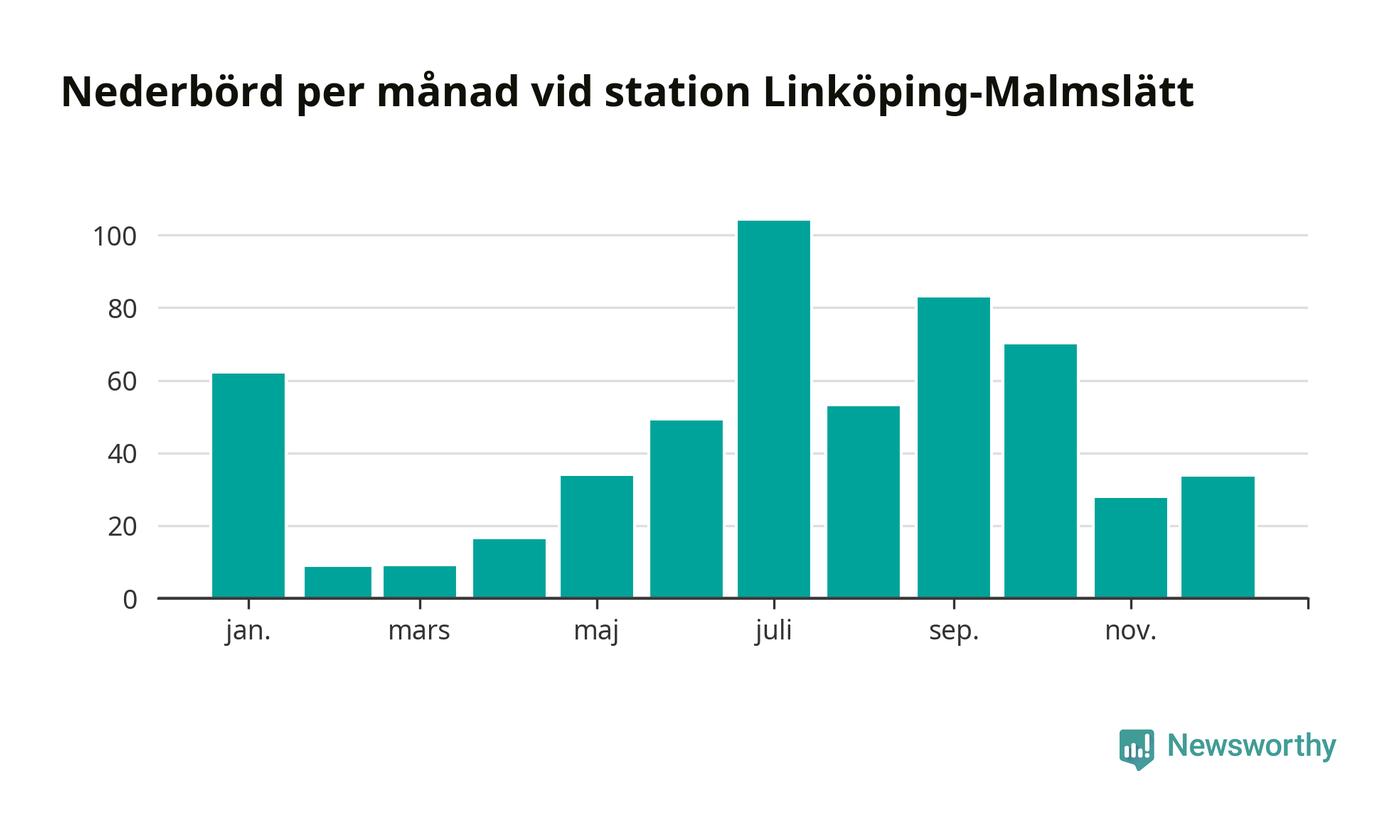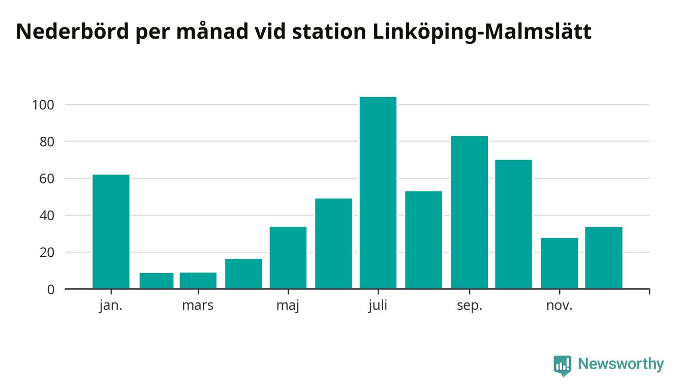 Nederbördsmässigt var 2025 ett ganska normalt år vid Linköping-Malmslätt. Totalt föll 549 millimeter nederbörd vid stationen, att jämföra med de senaste tre decenniernas genomsnitt på 565 millimeter. Månaden med mest nederbörd var juli, med 104 millimeter.
