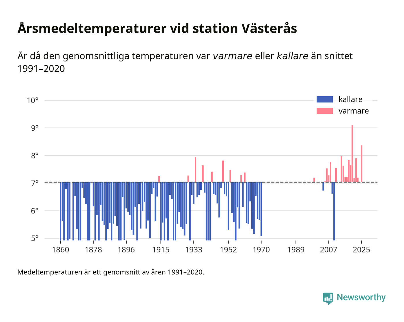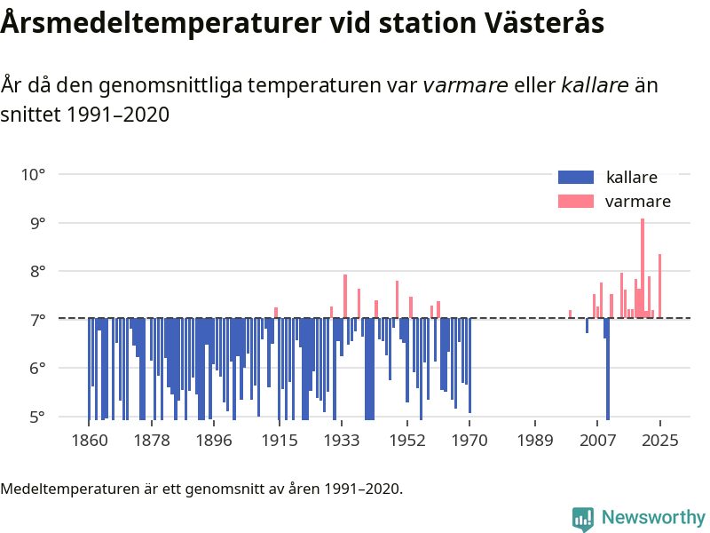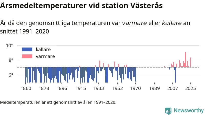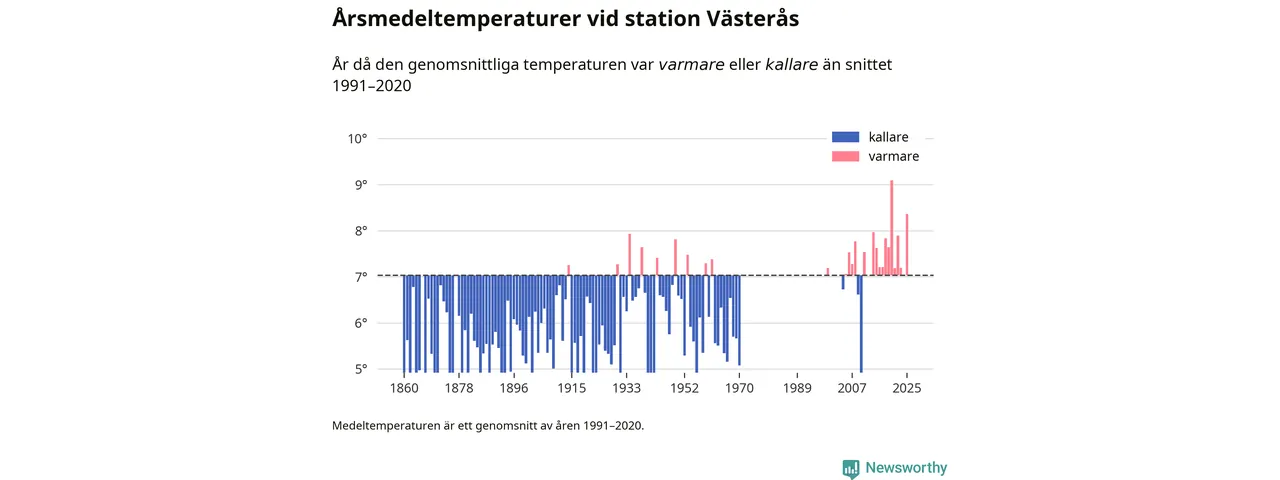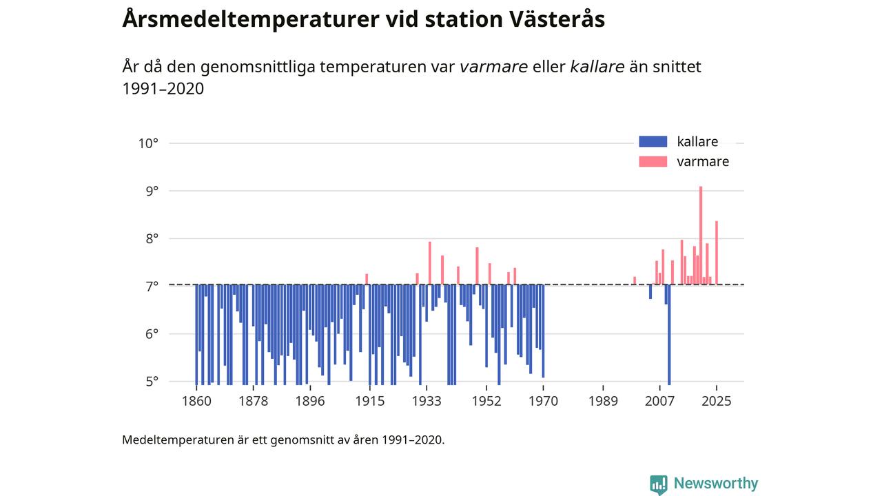 Årsmedeltemperaturen vid Västerås fyra kilometer sydöst om centrala Västerås1 – den enda aktiva, SMHI-anslutna stationen som mäter medeltemperaturer i Västerås kommun – var under 2025 8,4 grader, 1,3 grader högre än genomsnittet de senaste decennierna. Det visar Newsworthys beräkningar, som bygger på delvis preliminär observationsdata från SMHI.