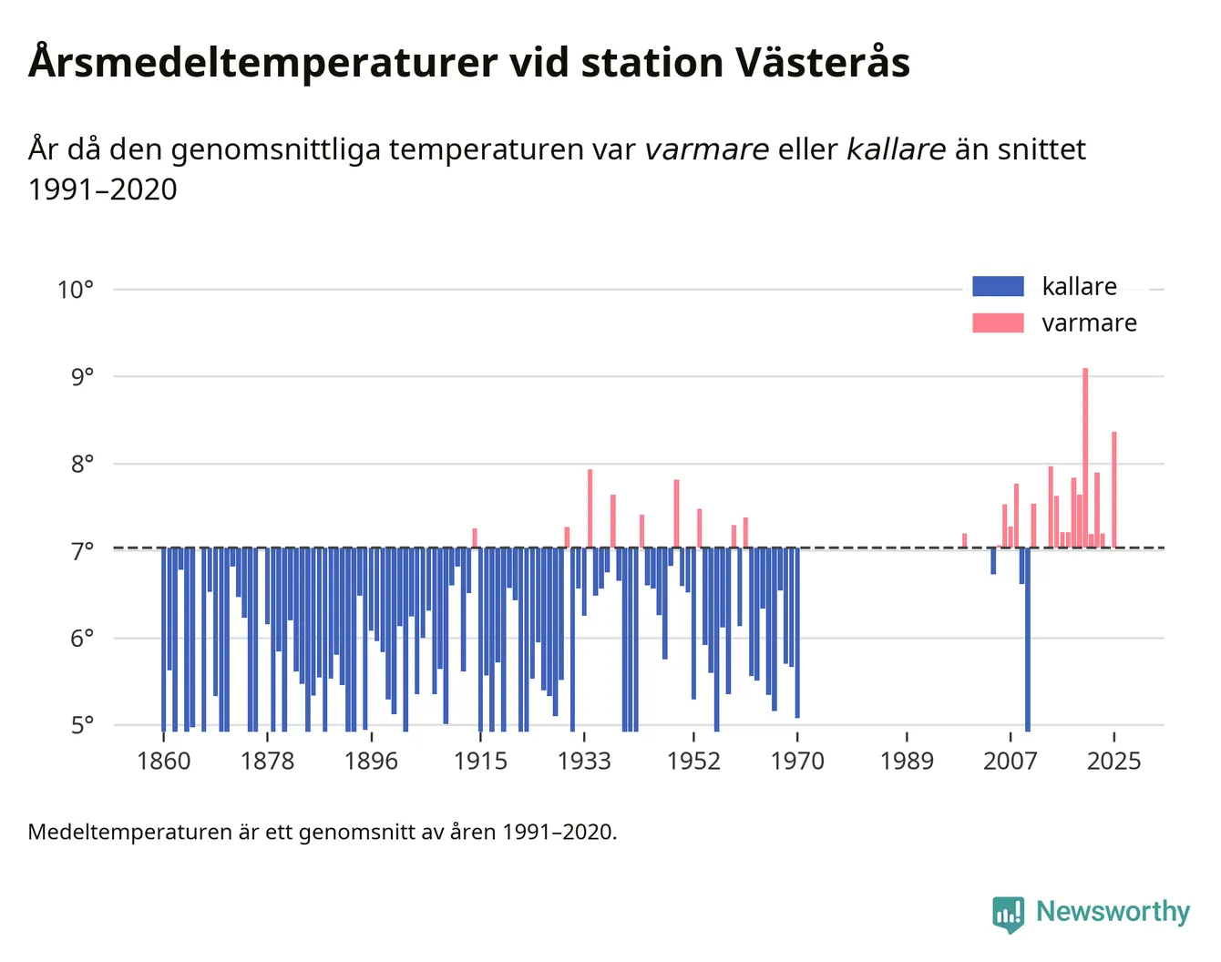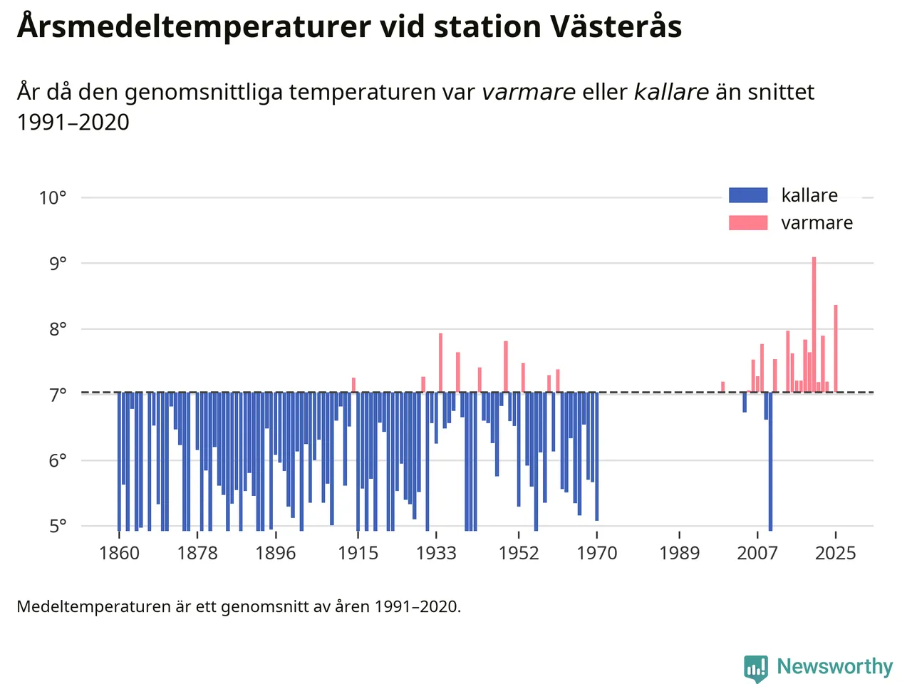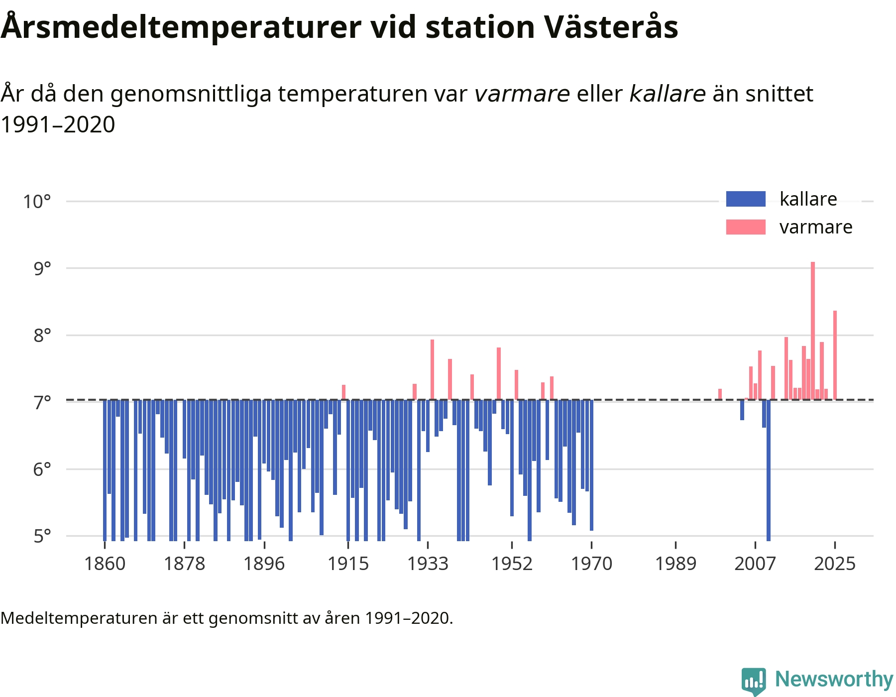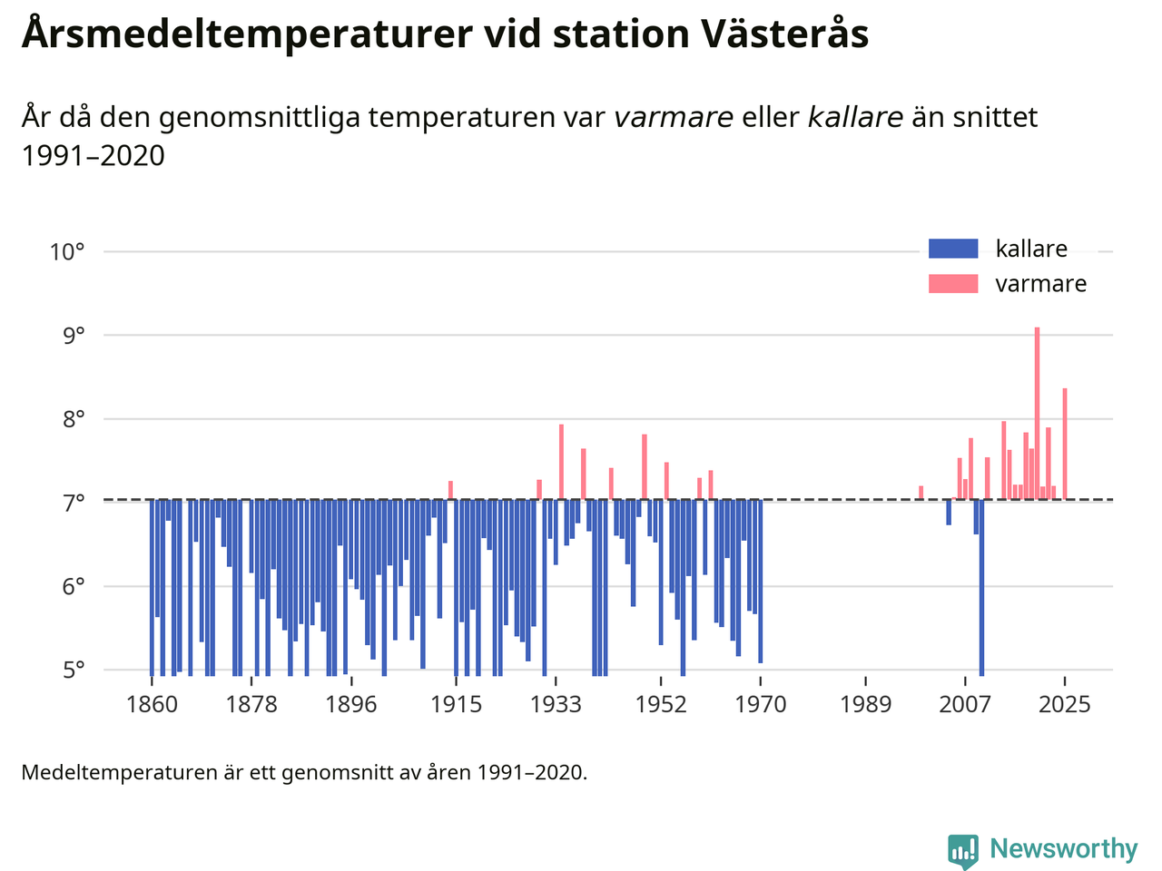 Årsmedeltemperaturen vid Västerås fyra kilometer sydöst om centrala Västerås1 – den enda aktiva, SMHI-anslutna stationen som mäter medeltemperaturer i Västerås kommun – var under 2025 8,4 grader, 1,3 grader högre än genomsnittet de senaste decennierna. Det visar Newsworthys beräkningar, som bygger på delvis preliminär observationsdata från SMHI.