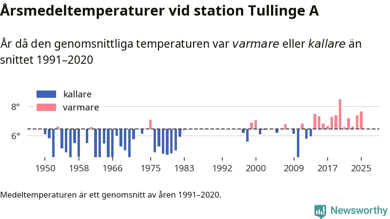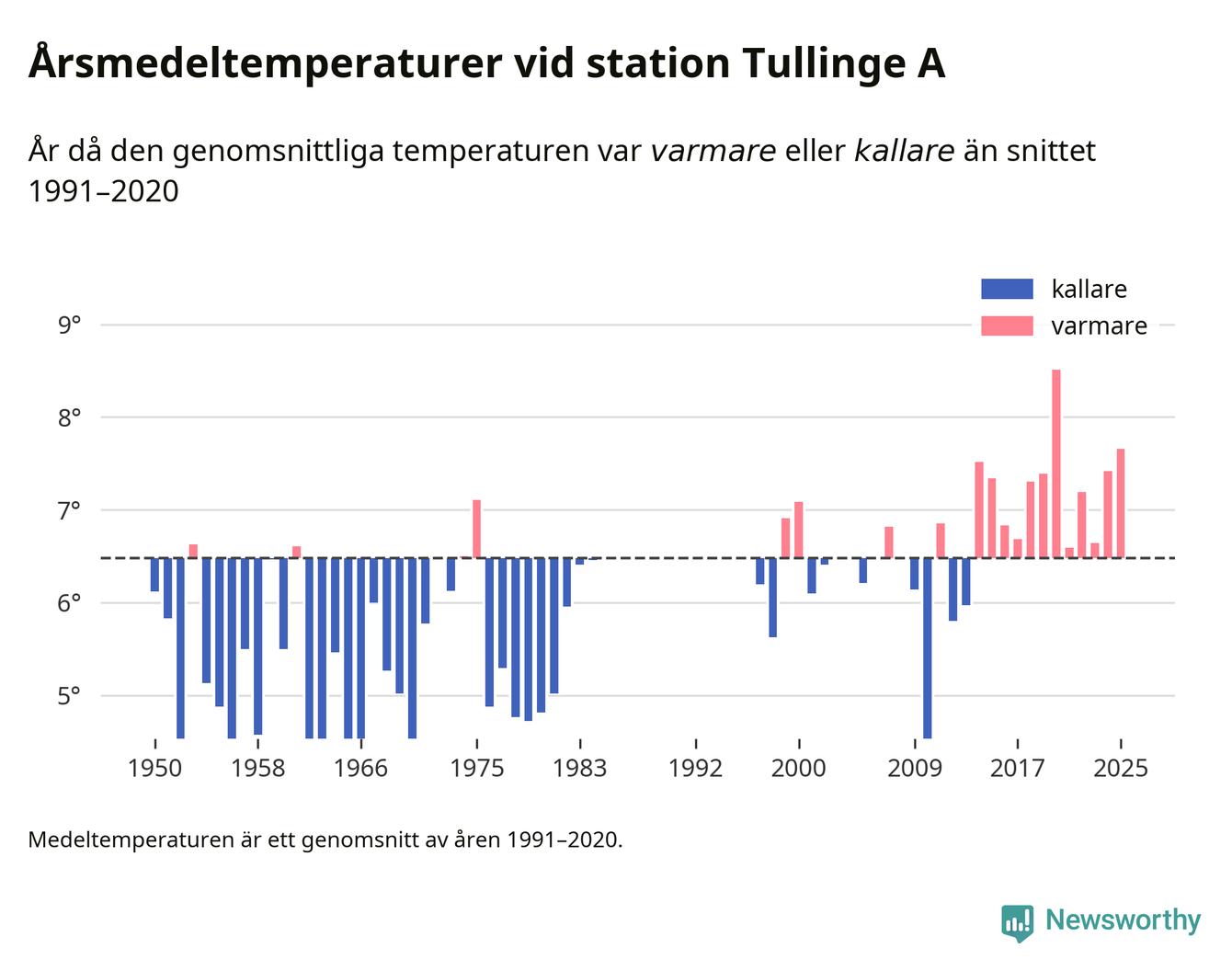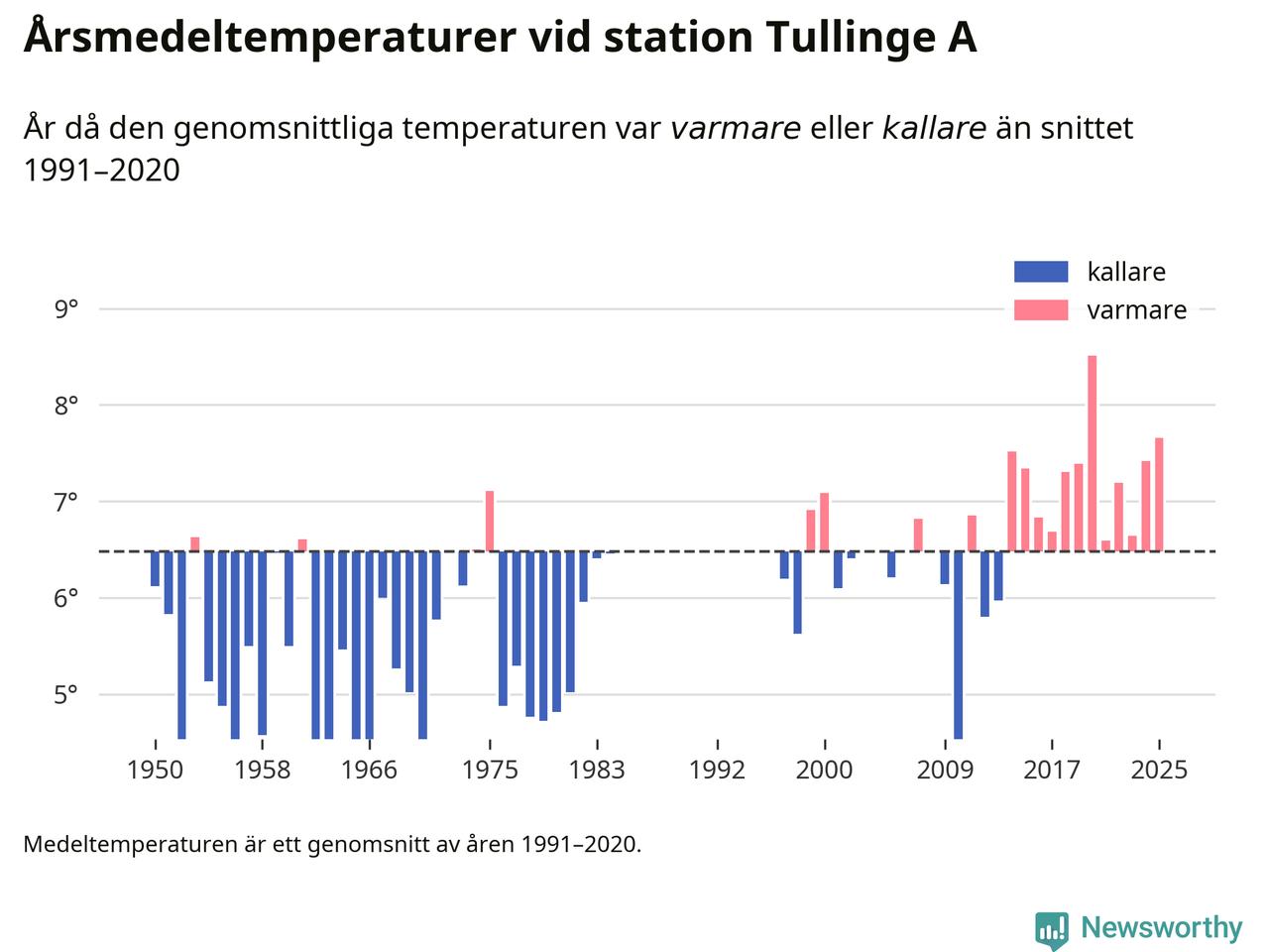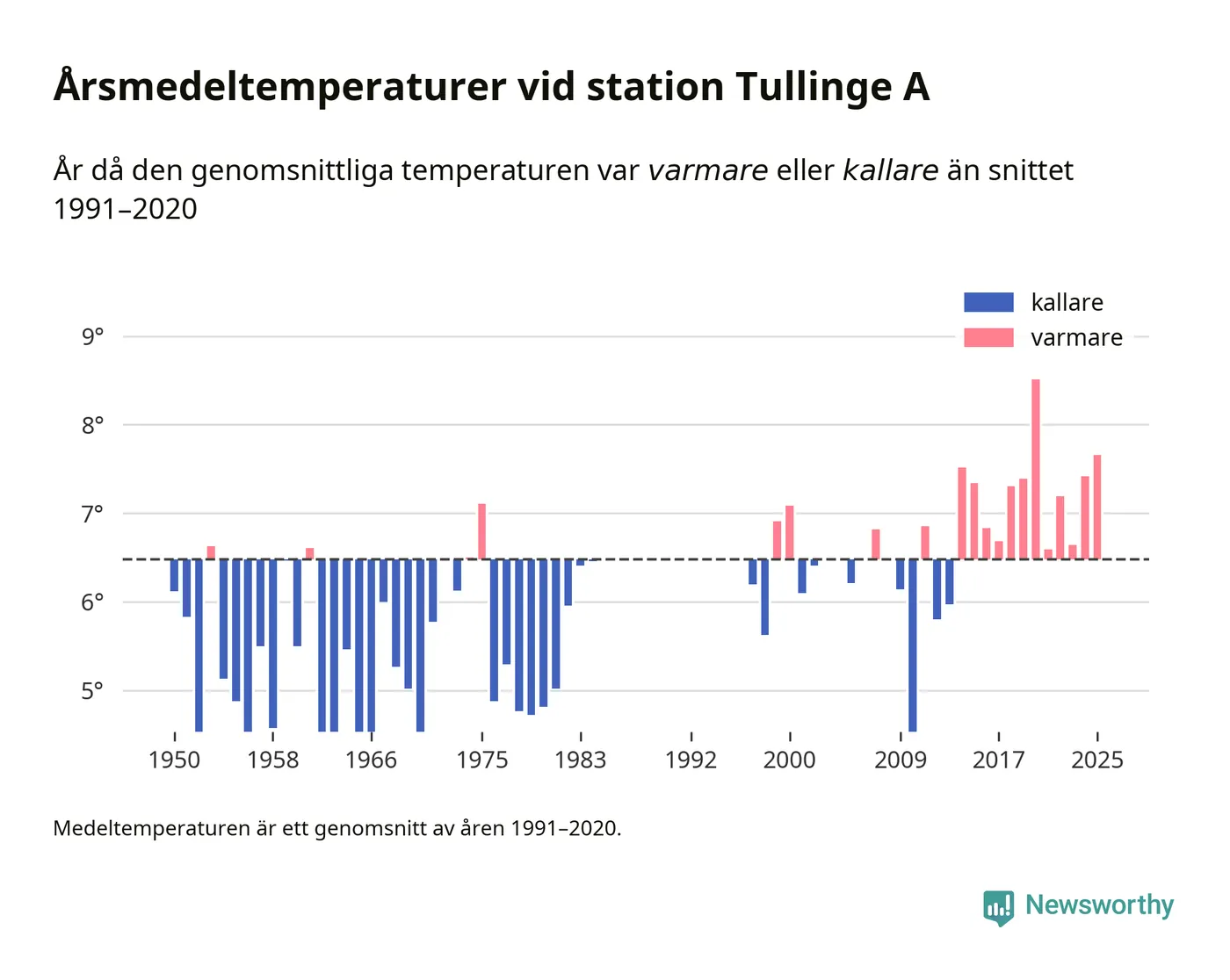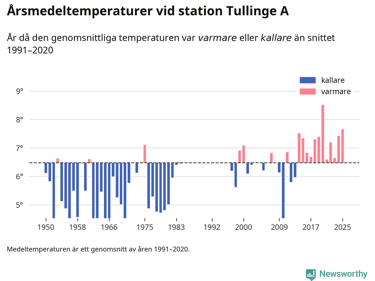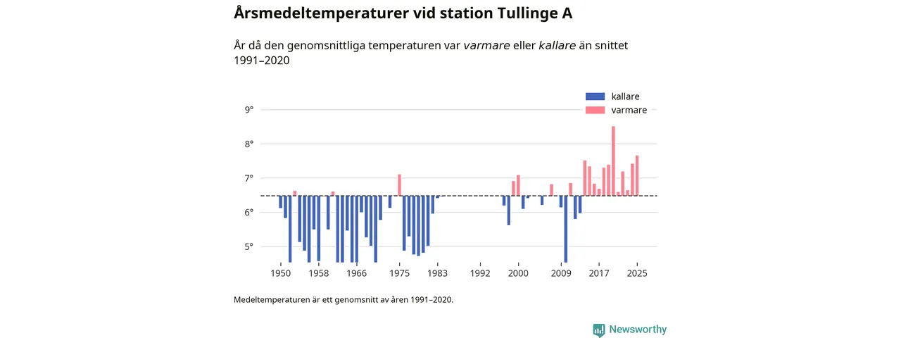 Årsmedeltemperaturen vid Tullinge A sju kilometer sydväst om centrala Huddinge centrum1 var under 2025 7,7 grader, 1,2 grader högre än genomsnittet de senaste decennierna. Det visar Newsworthys beräkningar, som bygger på delvis preliminär observationsdata från SMHI.