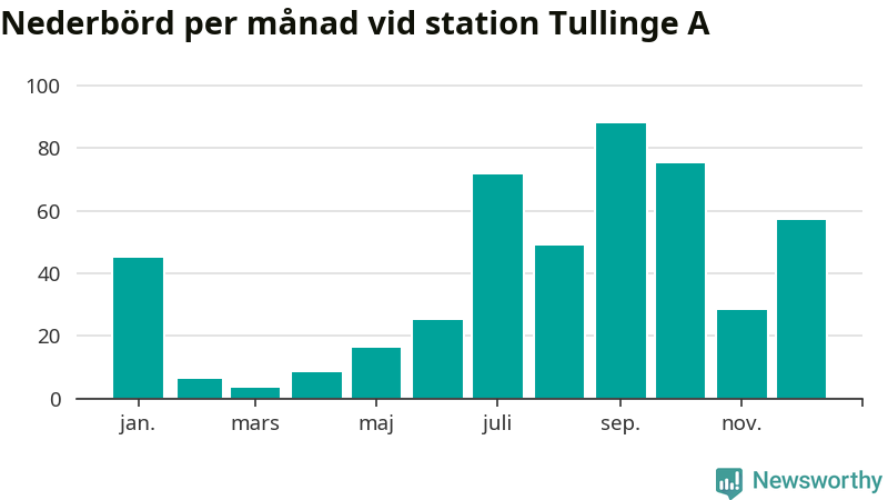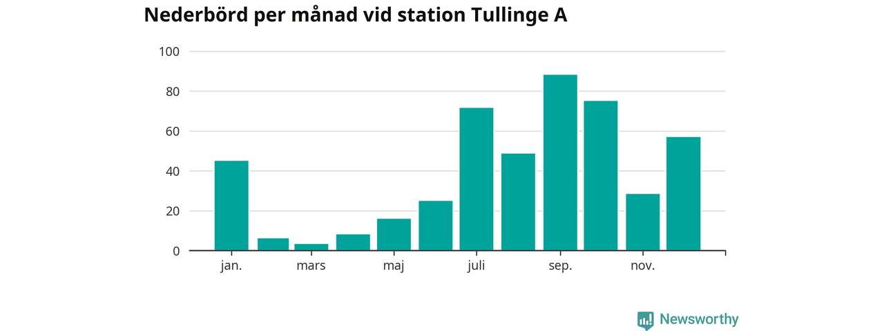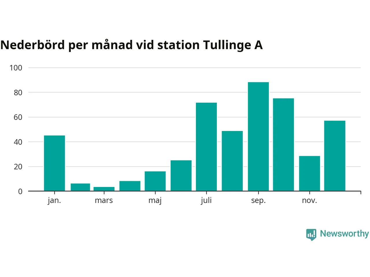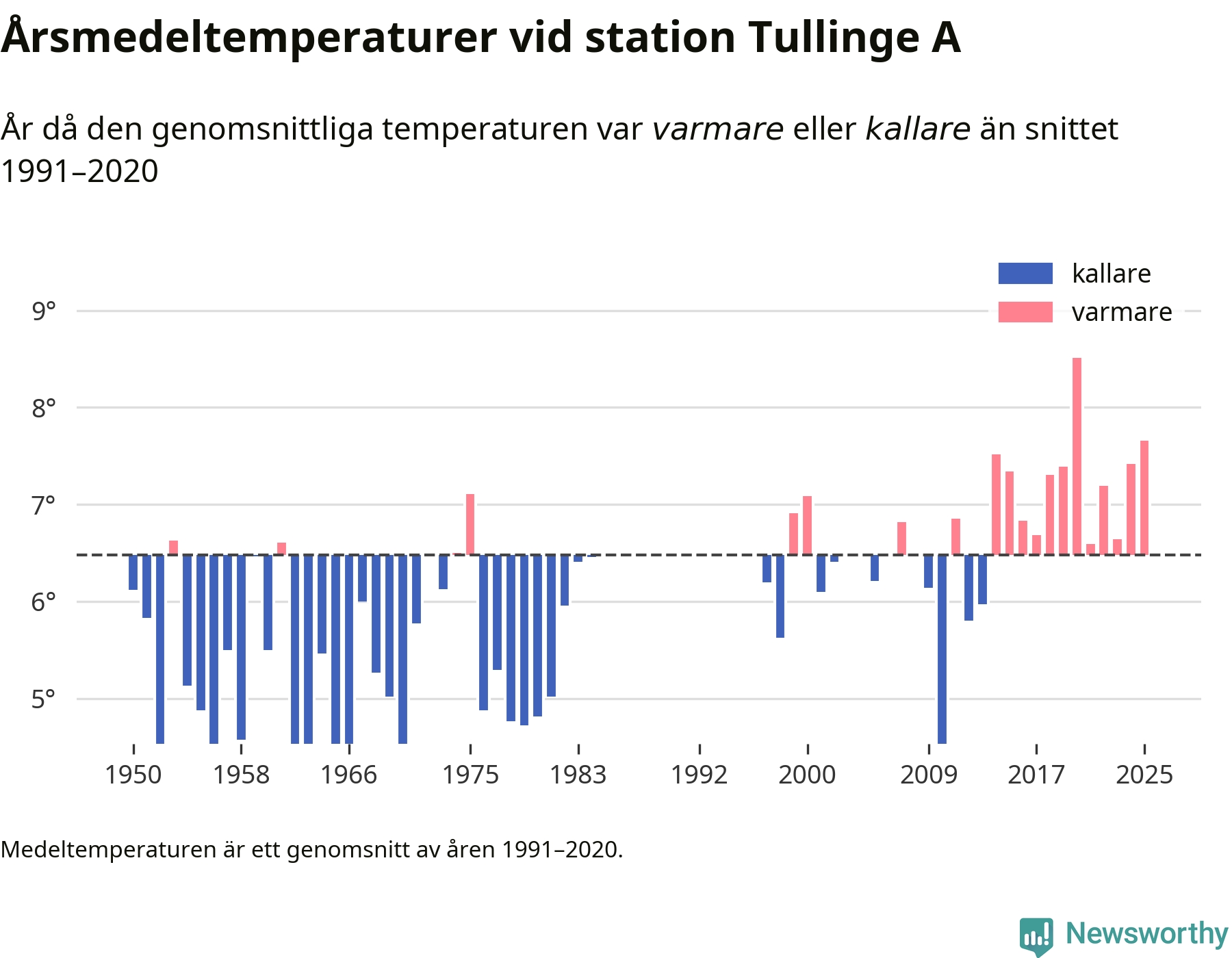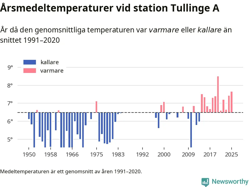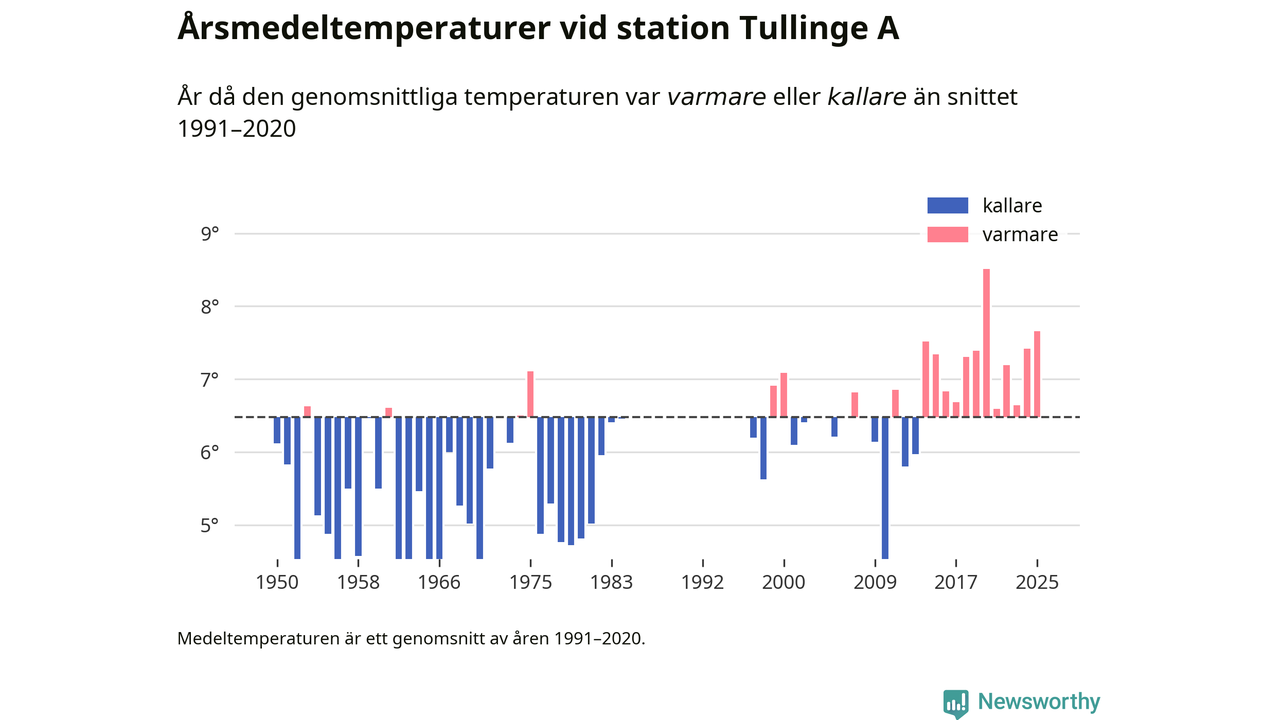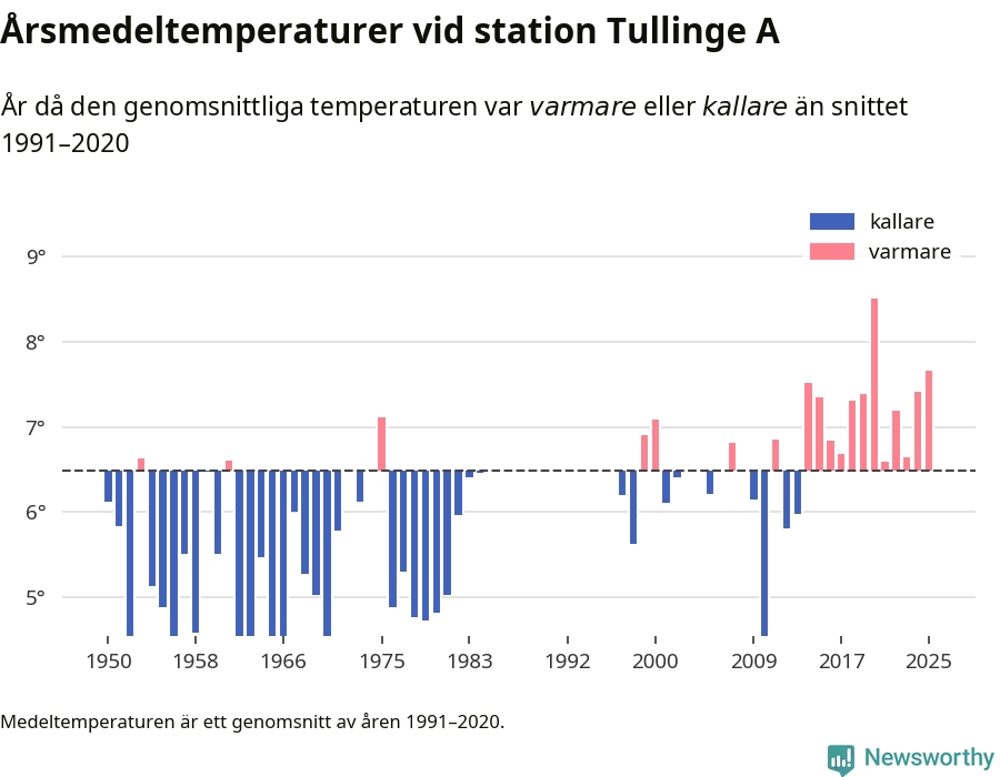Årsmedeltemperaturen vid Tullinge A sju kilometer sydväst om centrala Huddinge centrum1 var under 2025 7,7 grader, 1,2 grader högre än genomsnittet de senaste decennierna. Det visar Newsworthys beräkningar, som bygger på delvis preliminär observationsdata från SMHI.