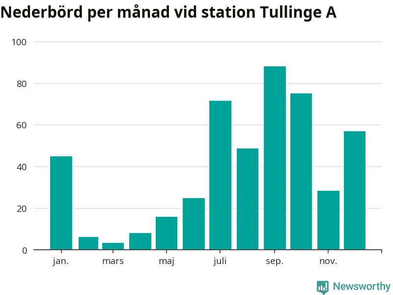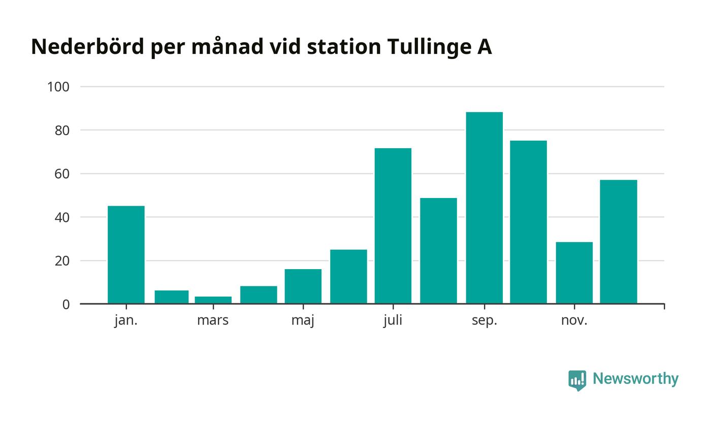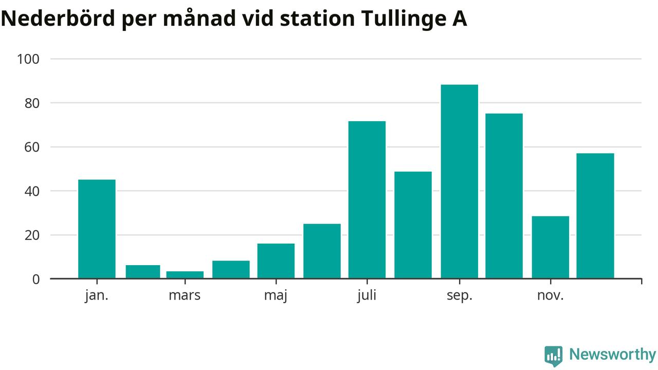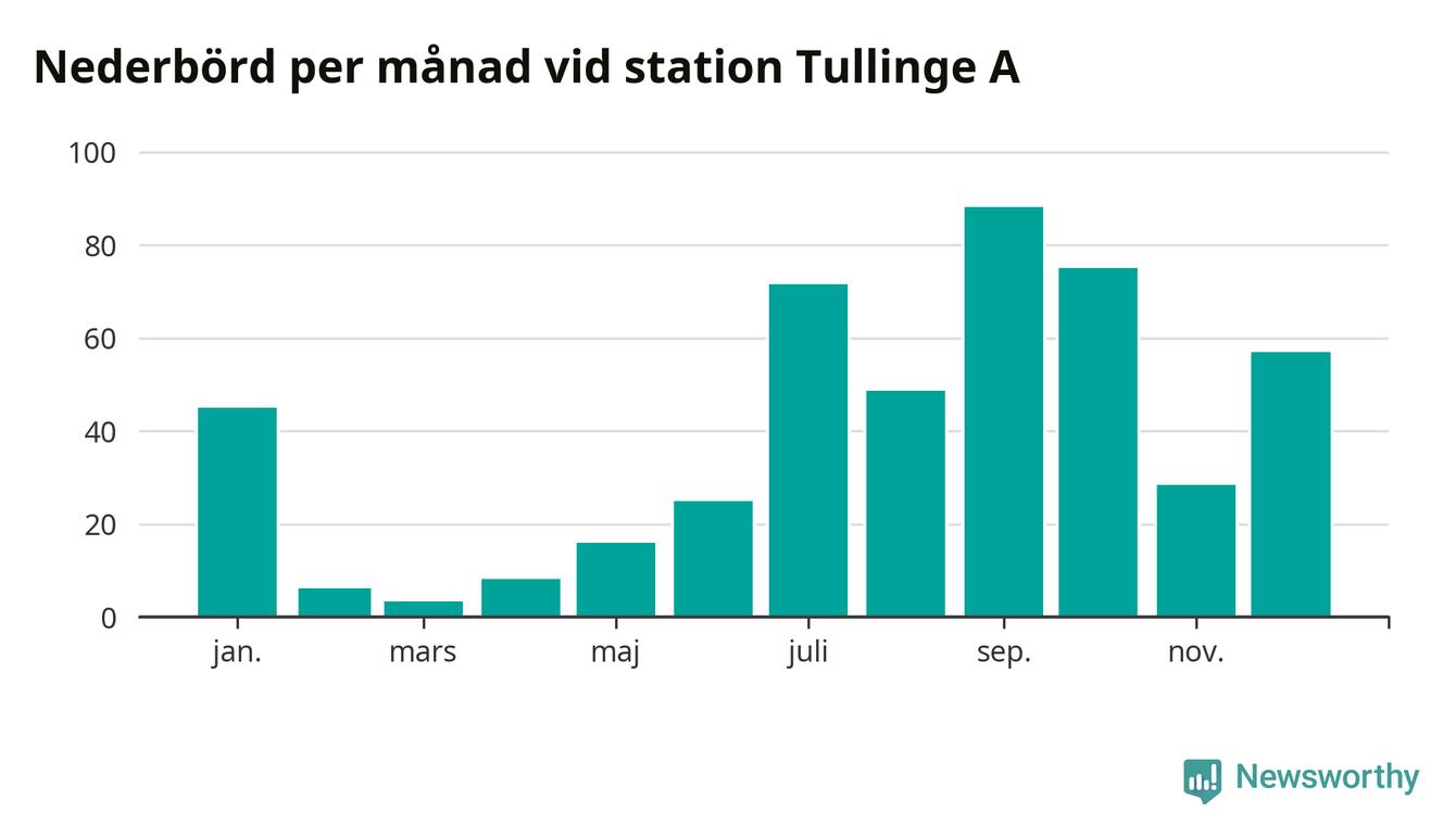Nederbördsmässigt var 2025 ett torrare år än vanligt vid Tullinge A. Totalt föll 473 millimeter nederbörd vid stationen, att jämföra med de senaste tre decenniernas genomsnitt på 576 millimeter. Månaden med mest nederbörd var september, med 88 millimeter.
