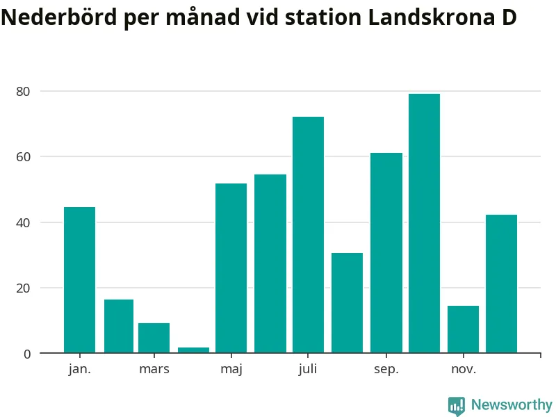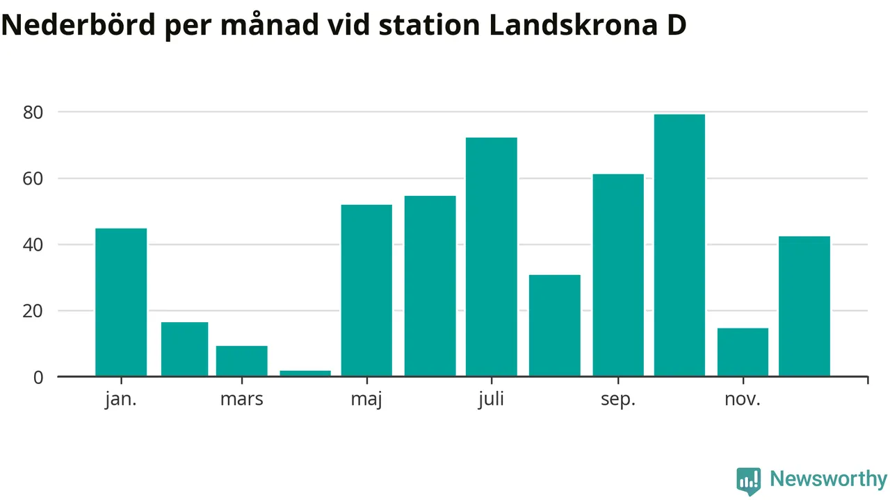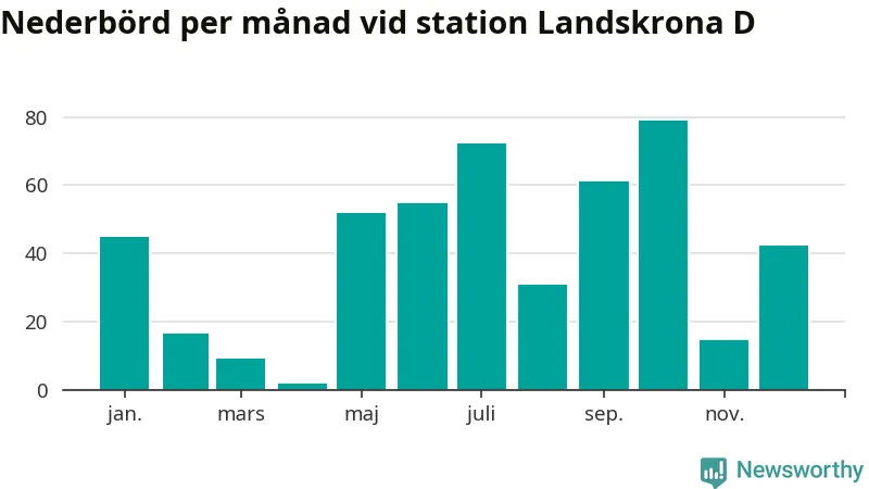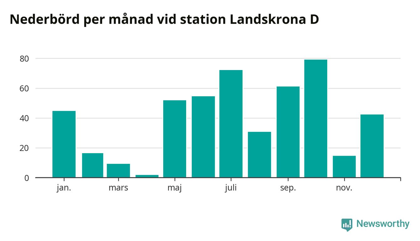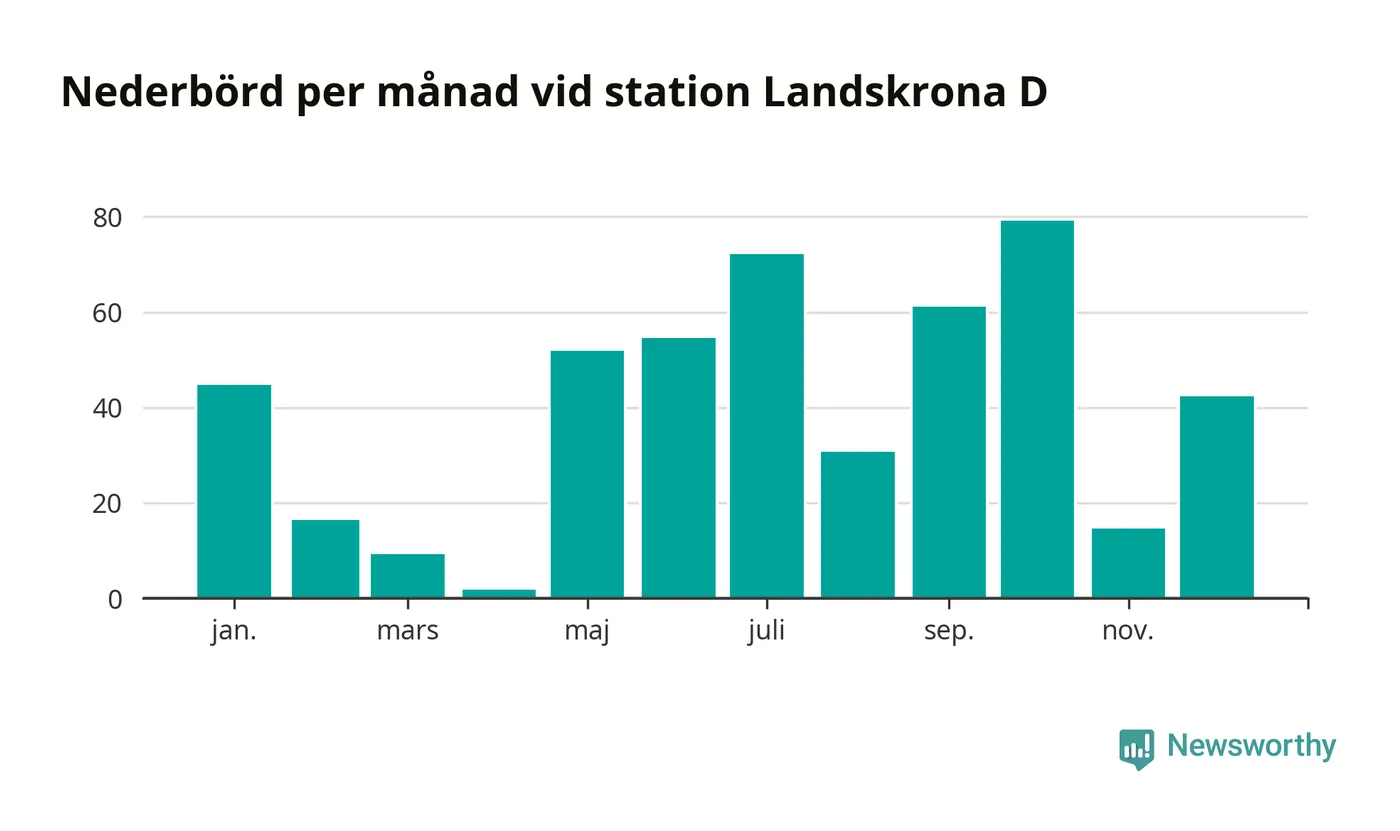 Nederbördsmässigt var 2025 ett torrare år än vanligt , åtminstone vid Landskrona D, i centrala Landskrona2. Totalt föll 479 millimeter nederbörd vid stationen, att jämföra med de senaste tre decenniernas genomsnitt på 583 millimeter. Månaden med mest nederbörd var oktober, med 79 millimeter.