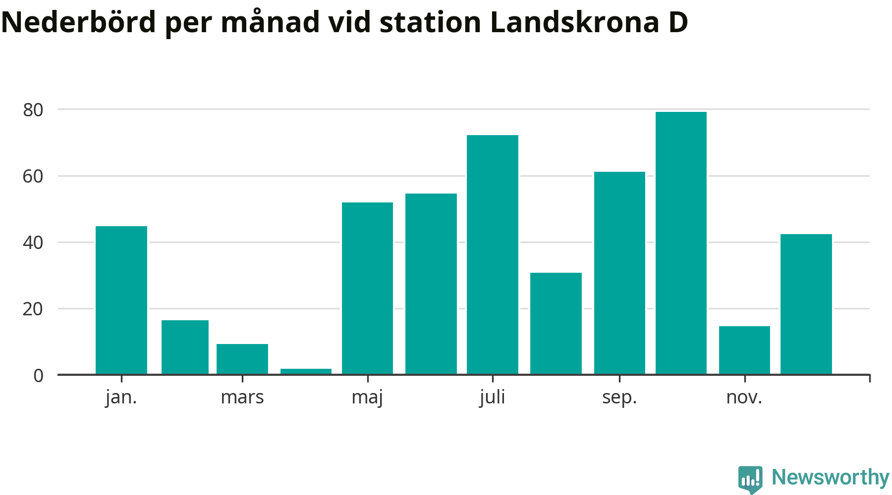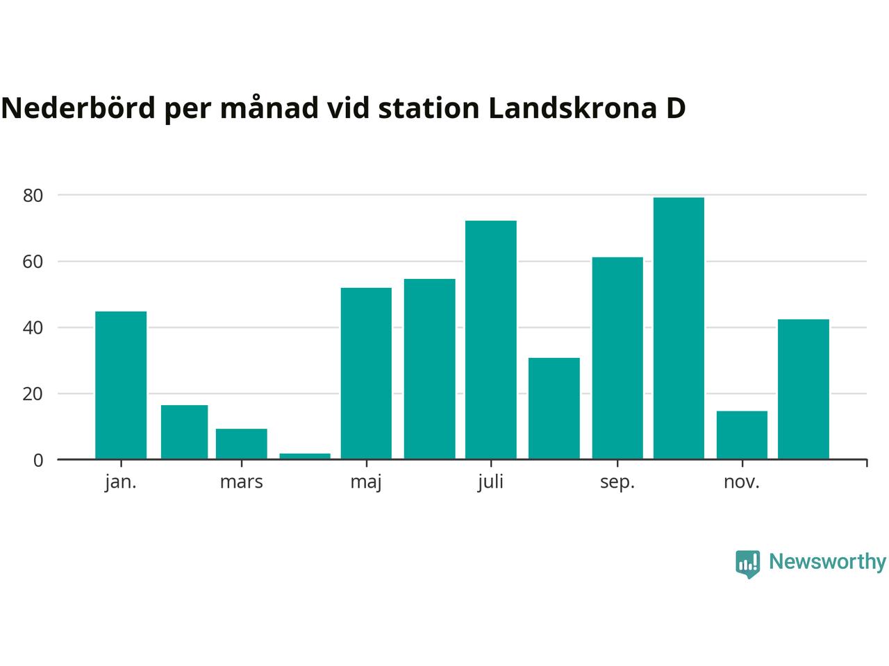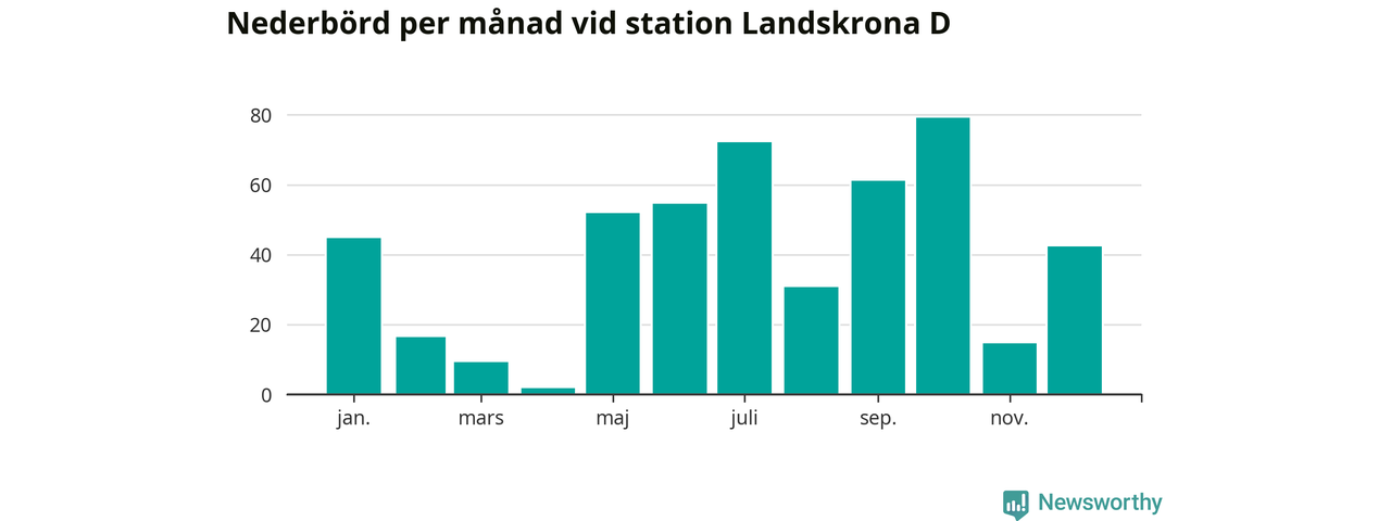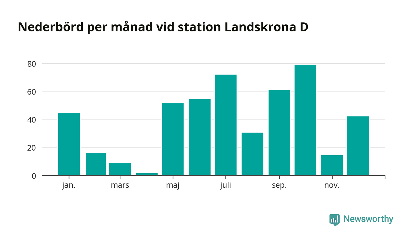 Nederbördsmässigt var 2025 ett torrare år än vanligt , åtminstone vid Landskrona D, i centrala Landskrona2. Totalt föll 479 millimeter nederbörd vid stationen, att jämföra med de senaste tre decenniernas genomsnitt på 583 millimeter. Månaden med mest nederbörd var oktober, med 79 millimeter.