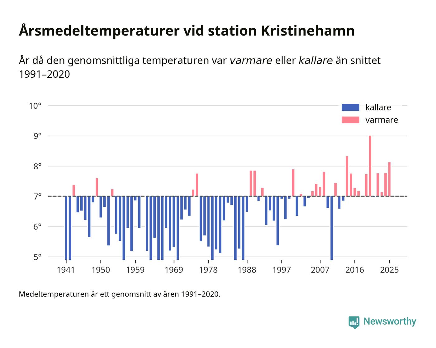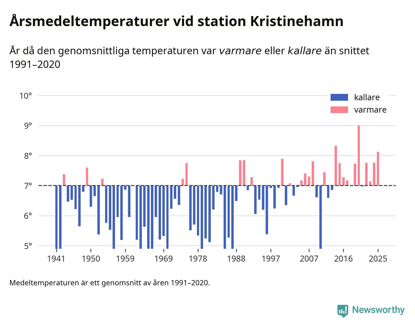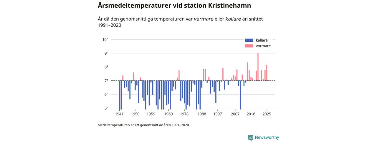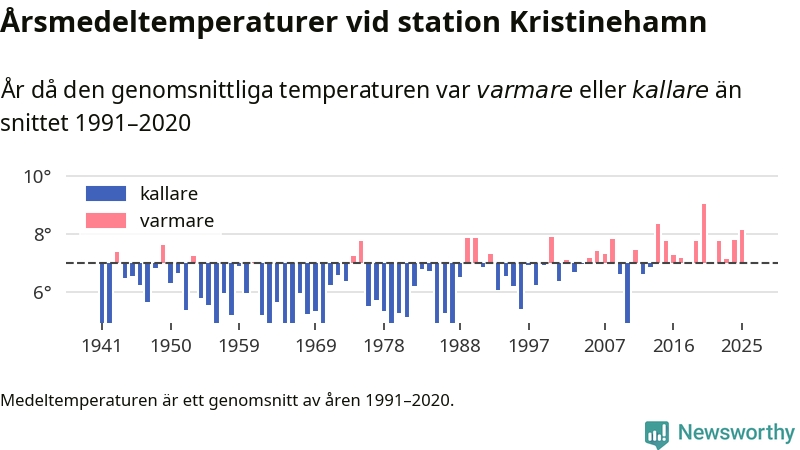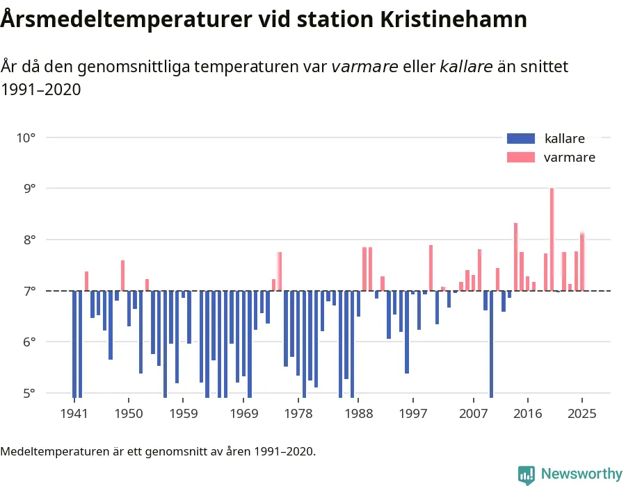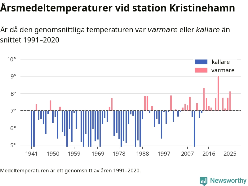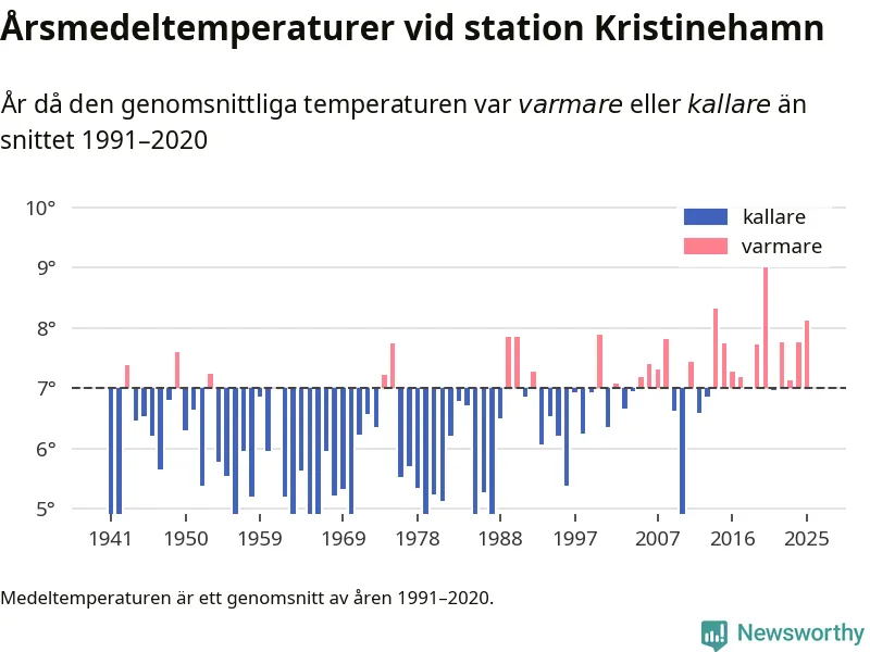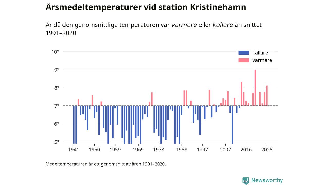 Årsmedeltemperaturen vid Kristinehamn i centrala Kristinehamn1 – den enda aktiva, SMHI-anslutna stationen som mäter medeltemperaturer i Kristinehamns kommun – var under 2025 8,1 grader, 1,1 grader högre än genomsnittet de senaste decennierna. Det är den tredje högsta noteringen sedan 1941, visar Newsworthys beräkningar baserade på delvis preliminär observationsdata från SMHI.