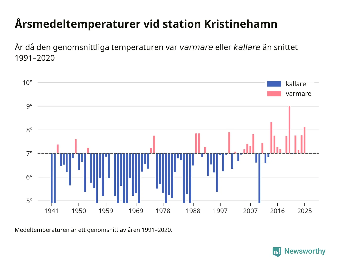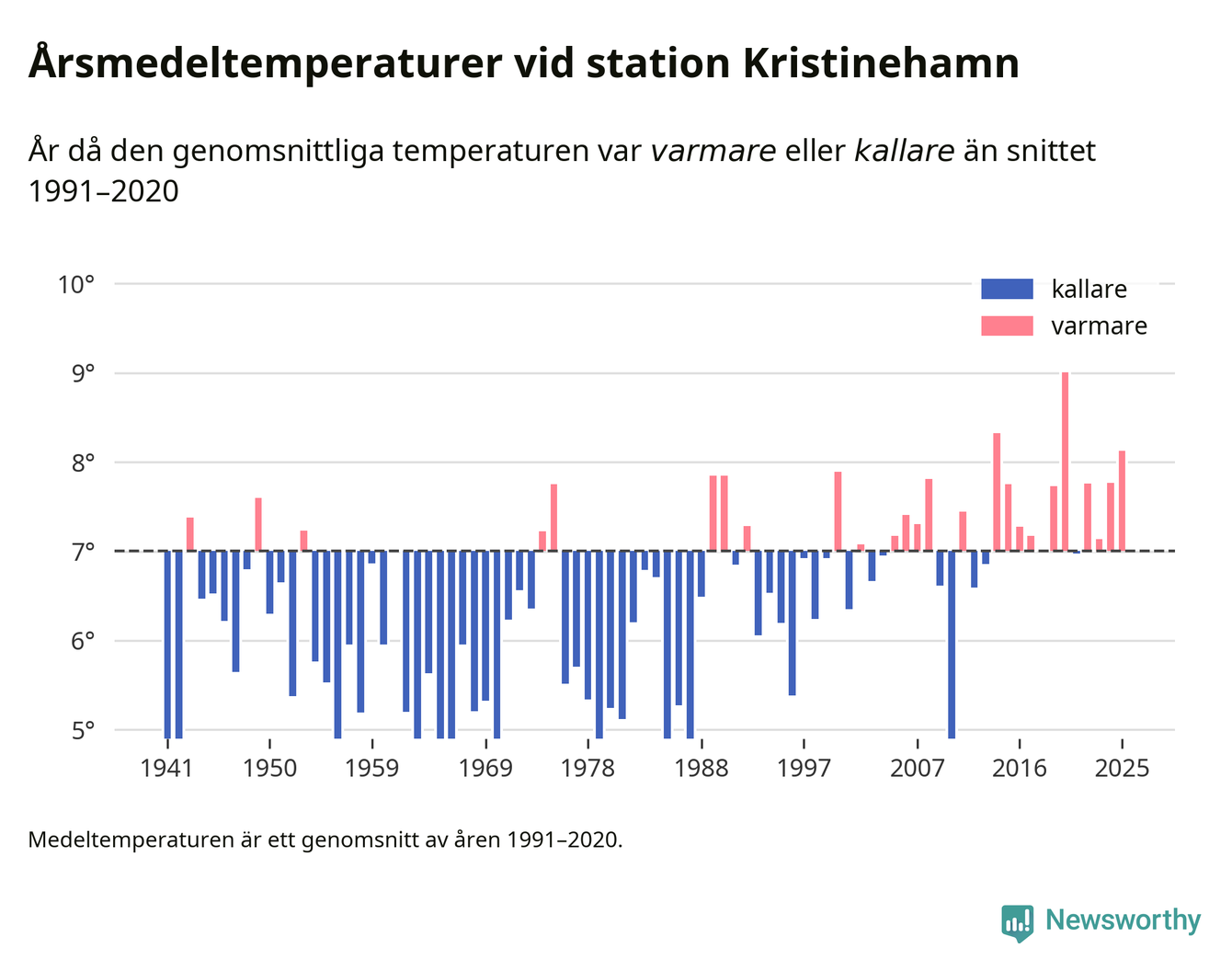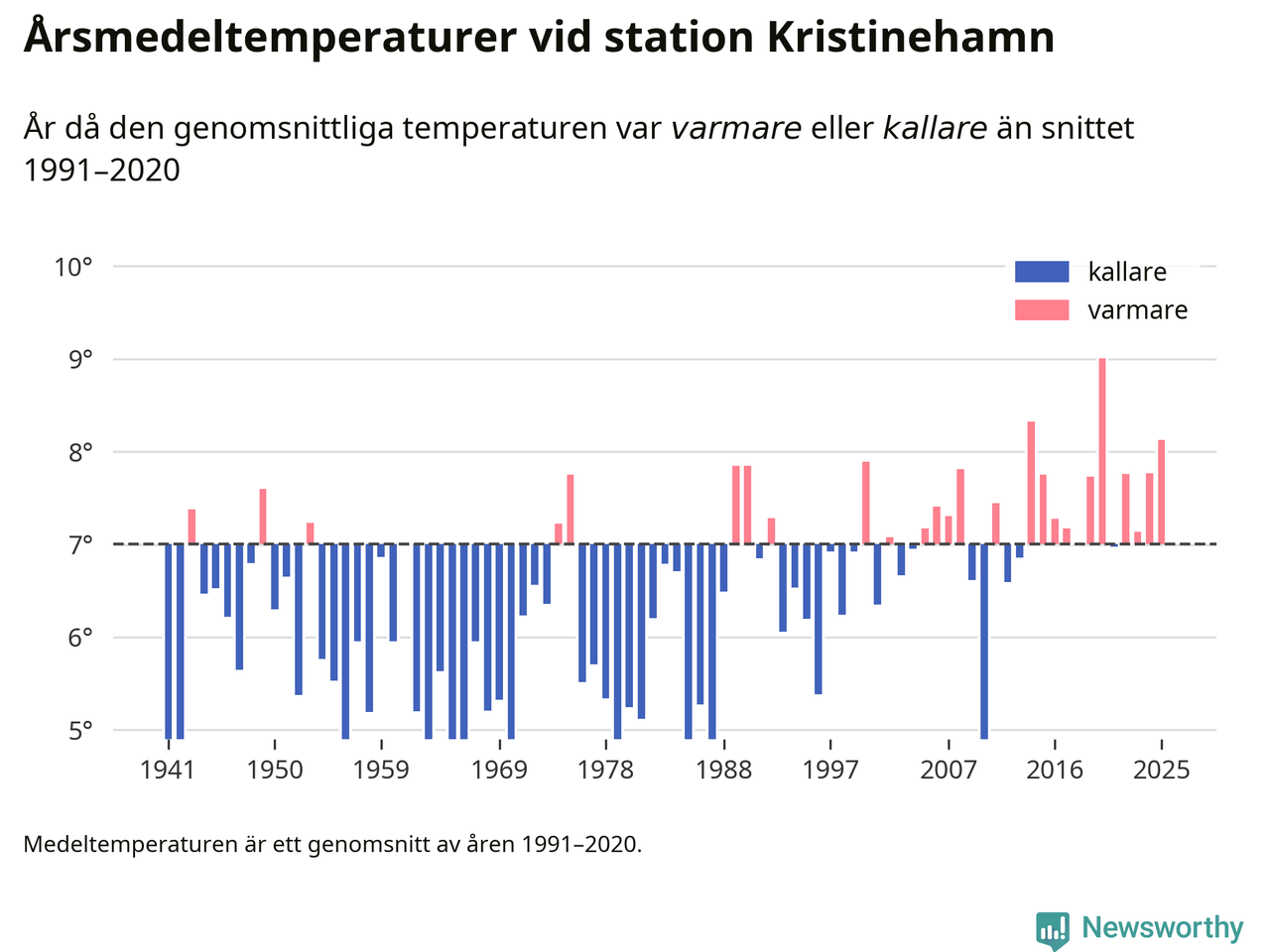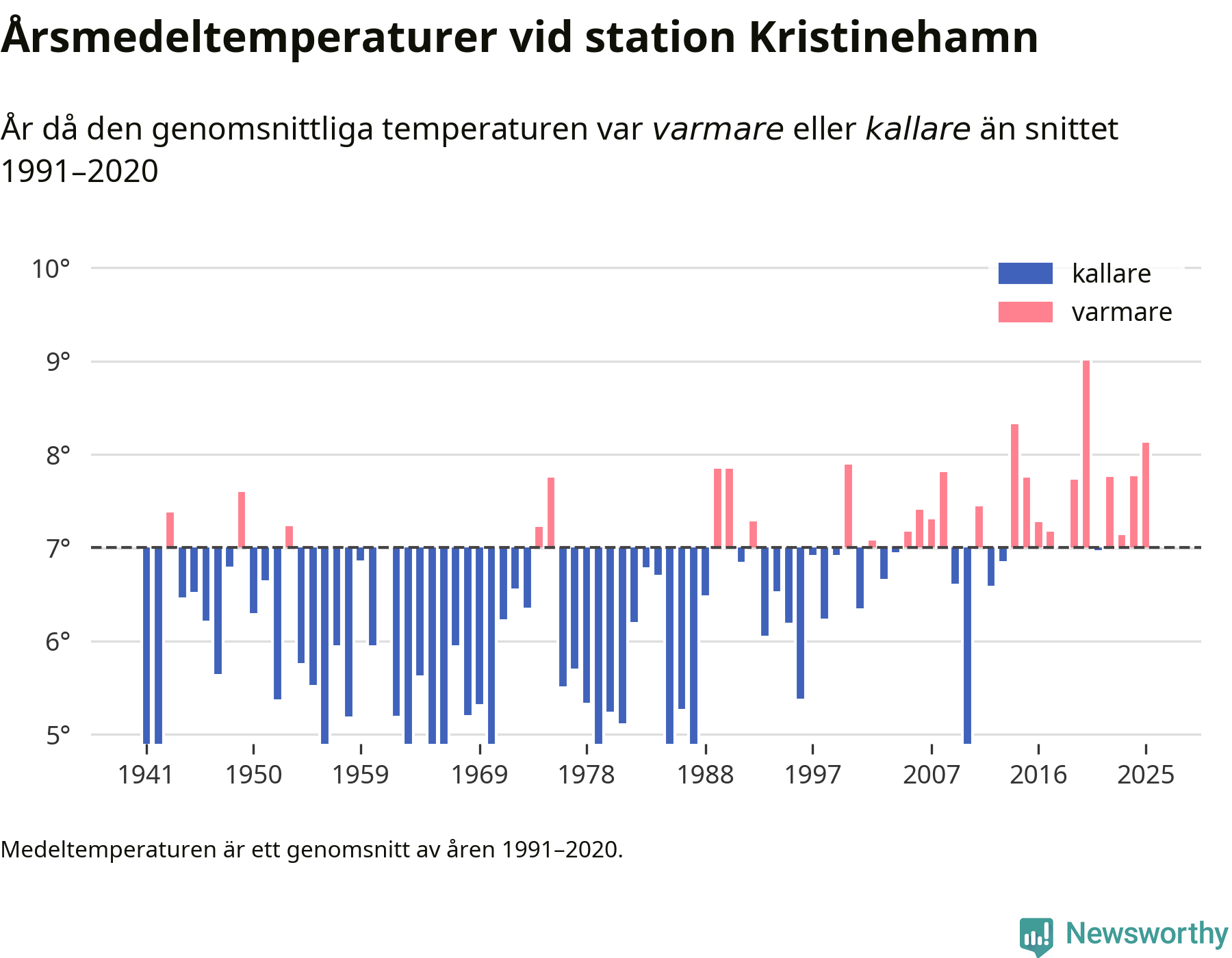 Årsmedeltemperaturen vid Kristinehamn i centrala Kristinehamn1 – den enda aktiva, SMHI-anslutna stationen som mäter medeltemperaturer i Kristinehamns kommun – var under 2025 8,1 grader, 1,1 grader högre än genomsnittet de senaste decennierna. Det är den tredje högsta noteringen sedan 1941, visar Newsworthys beräkningar baserade på delvis preliminär observationsdata från SMHI.