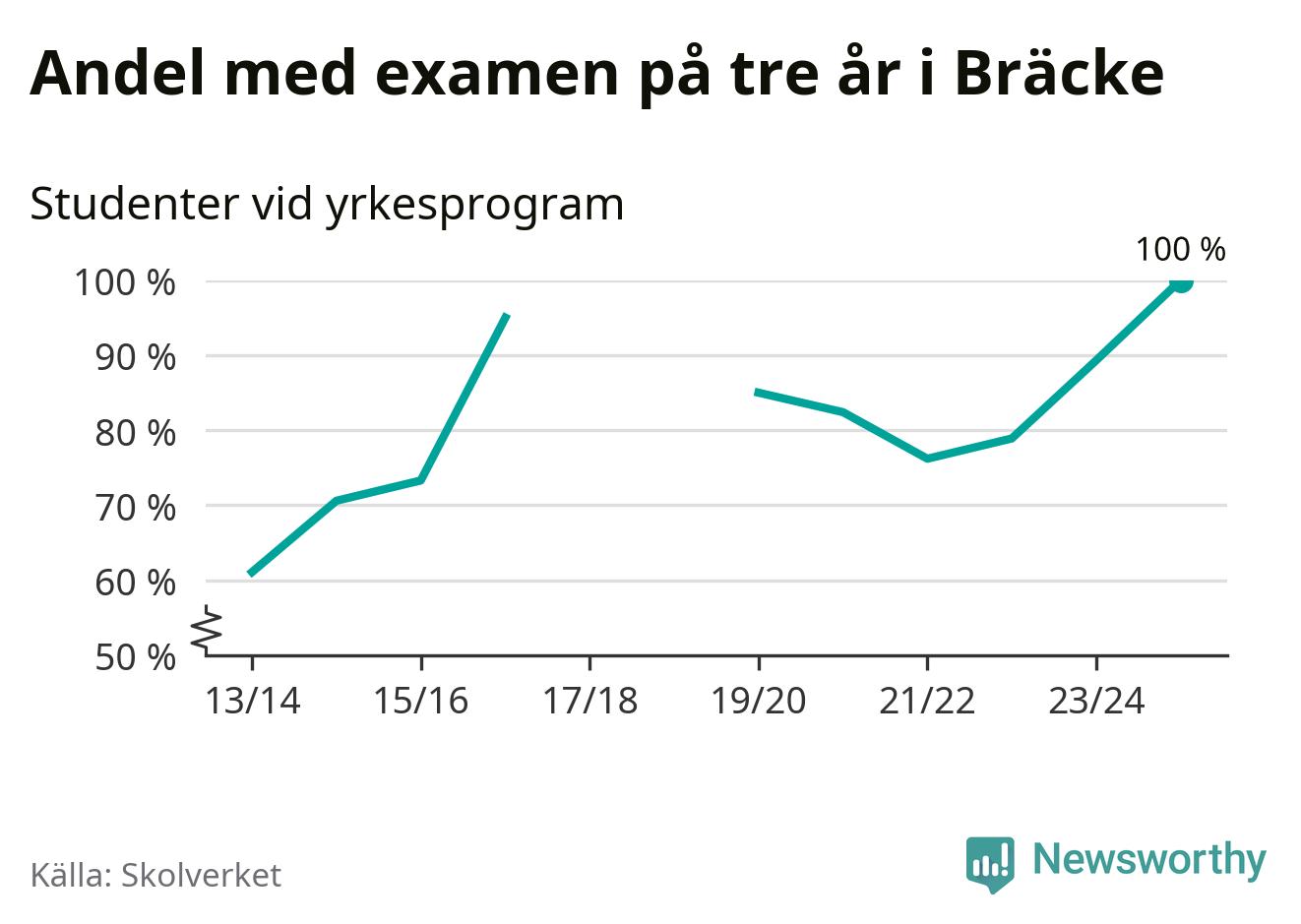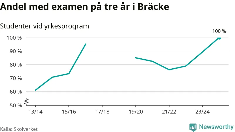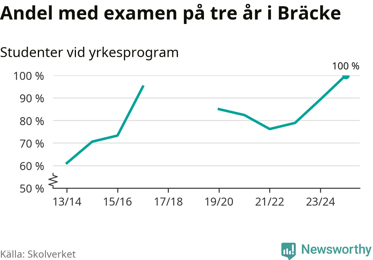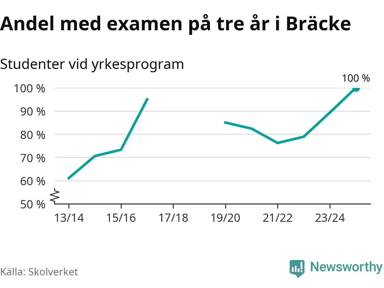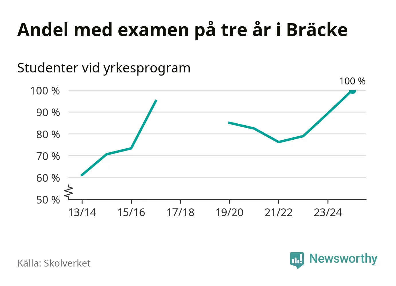 Alla 22 elever som började på Jämtlands Gymn, Bräcke 2022/23 klarade alltså examen på tre år i våras. Det är ganska ovanligt, i hela landet var det bara 48 skolenheter där alla yrkeselever klarade examen, medan alla elever på högskoleförberedande program fick examen på totalt tio skolenheter.